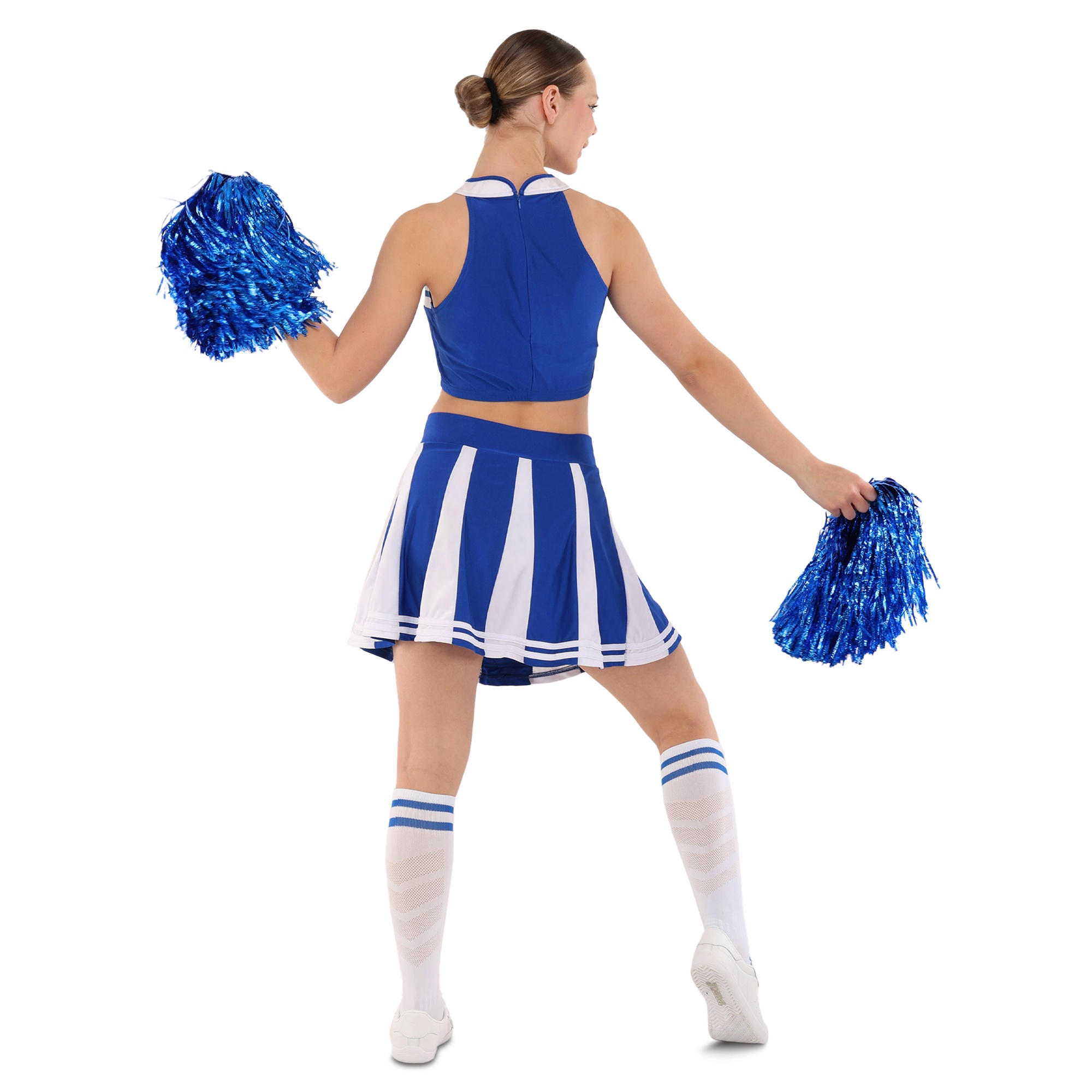 Легкий топ с воротником-стойкой и плиссированная мини-юбка созданы для эффектных, динамичных выступлений и позволяют спортсменке почувствовать полную свободу и уверенность. Костюм удачно подчеркивает ритм, синхронность и пластику каждого элемента в чирлидинге.