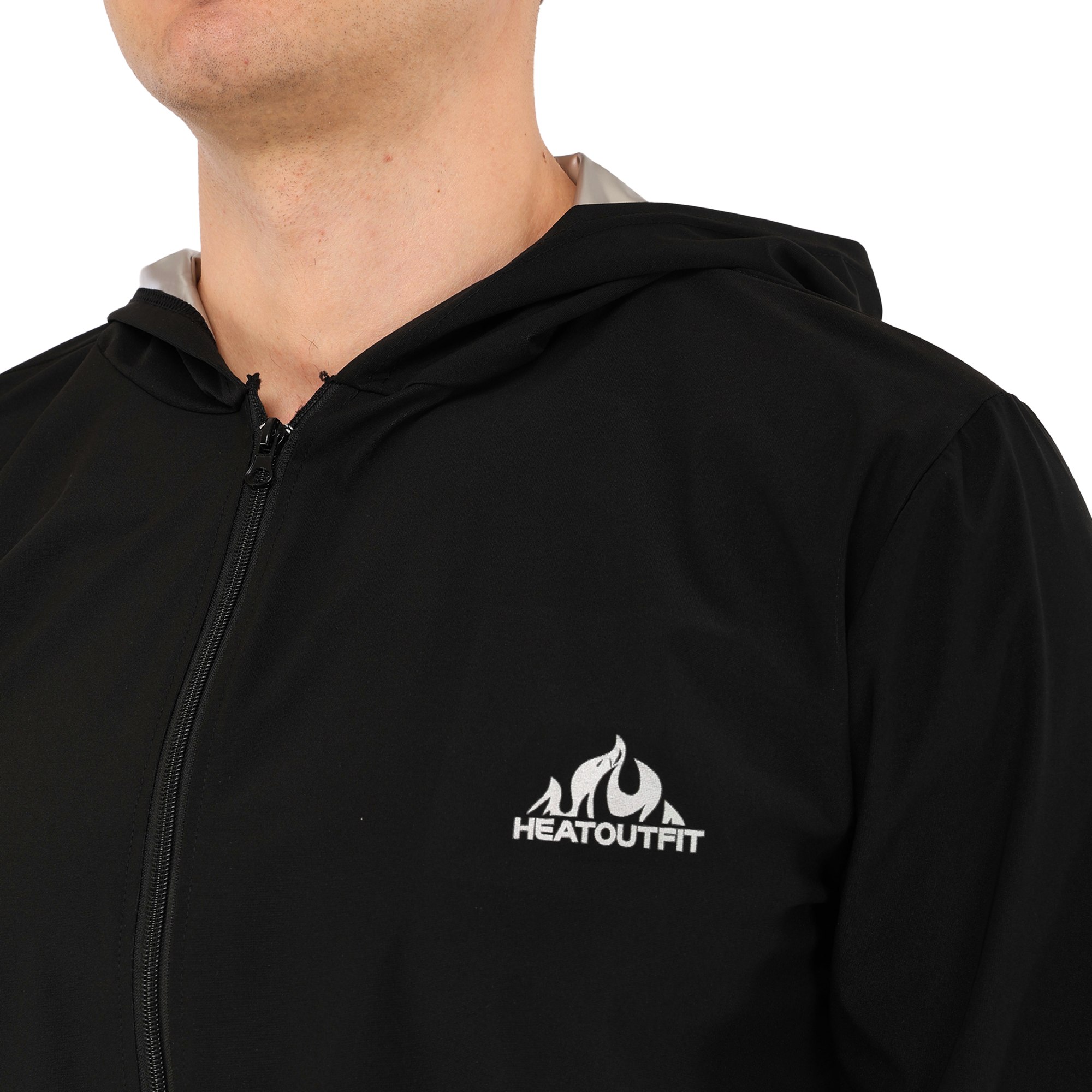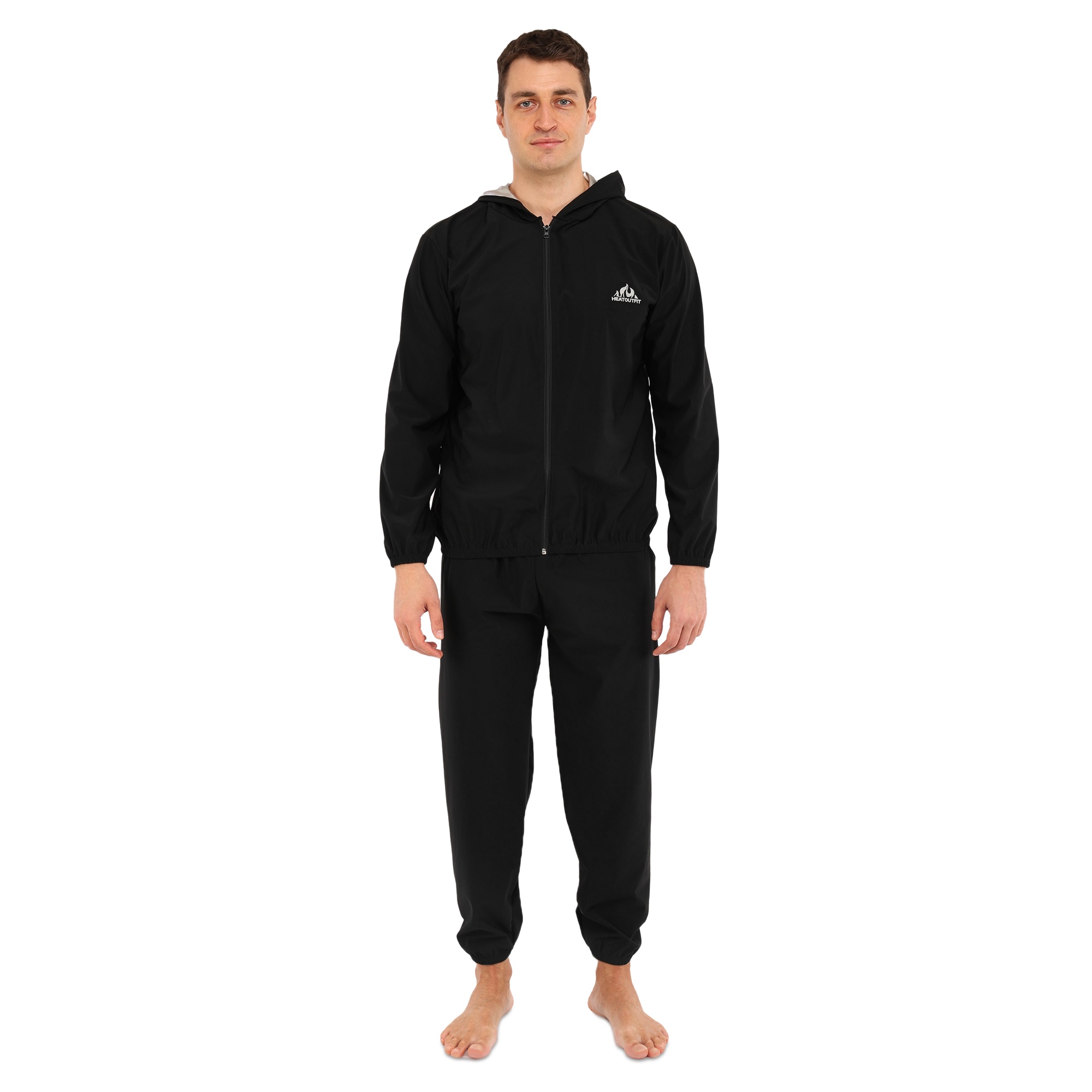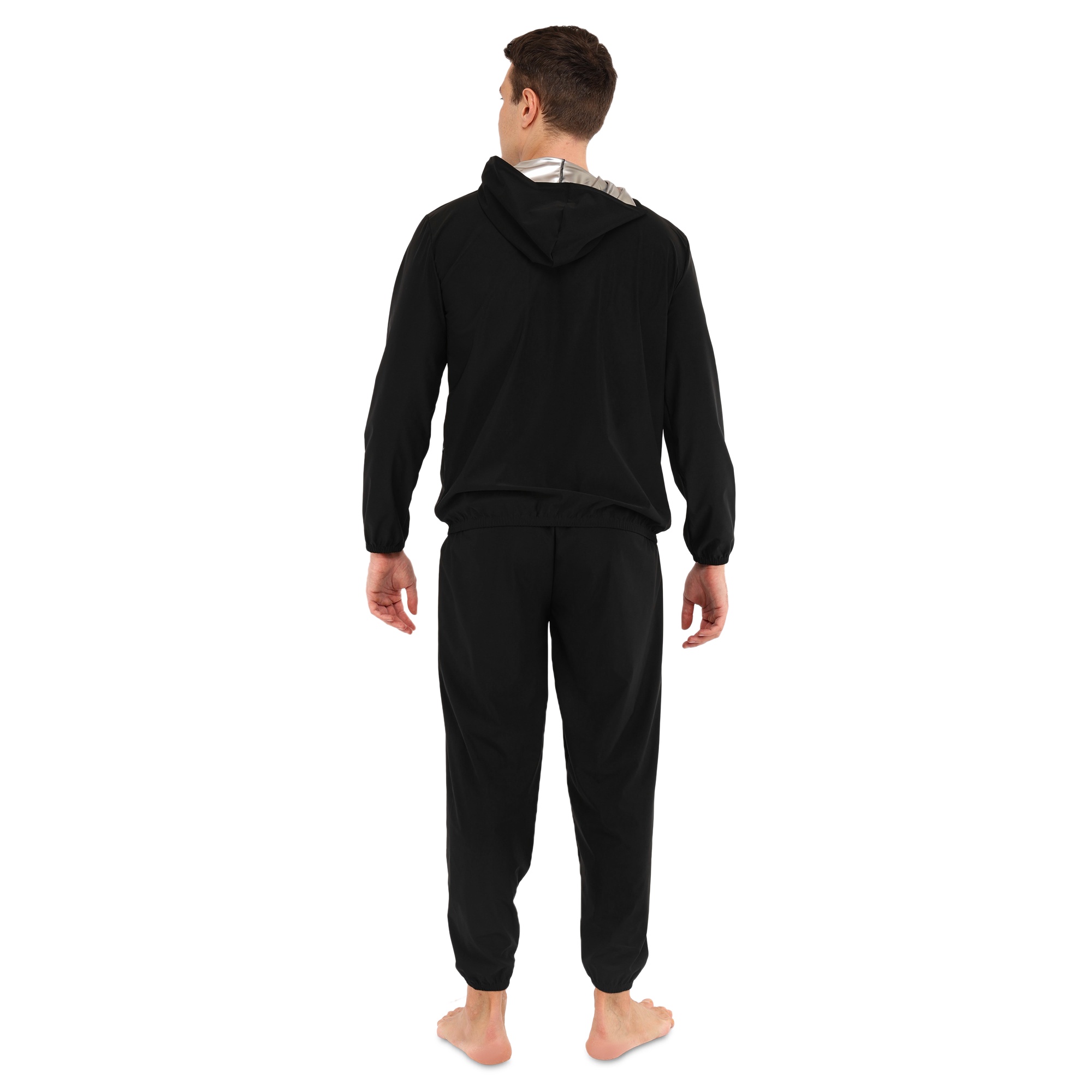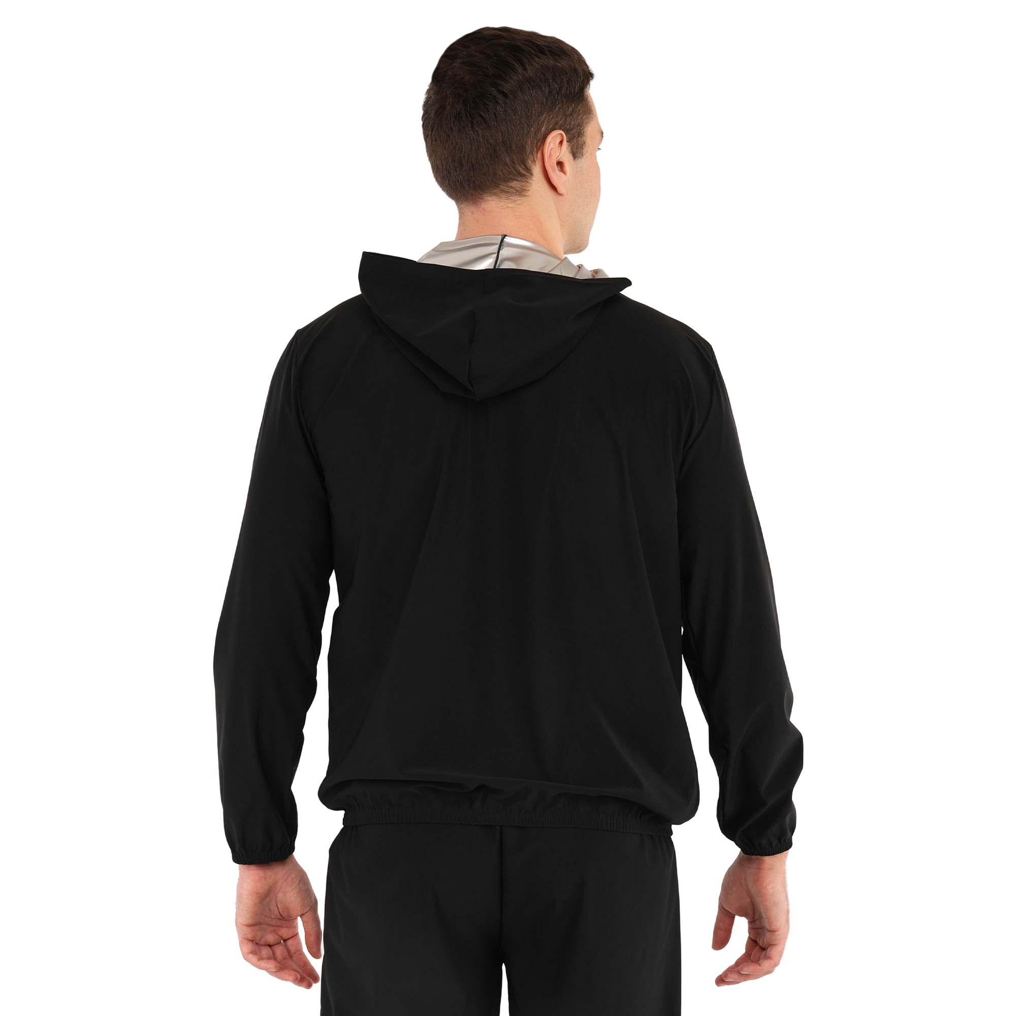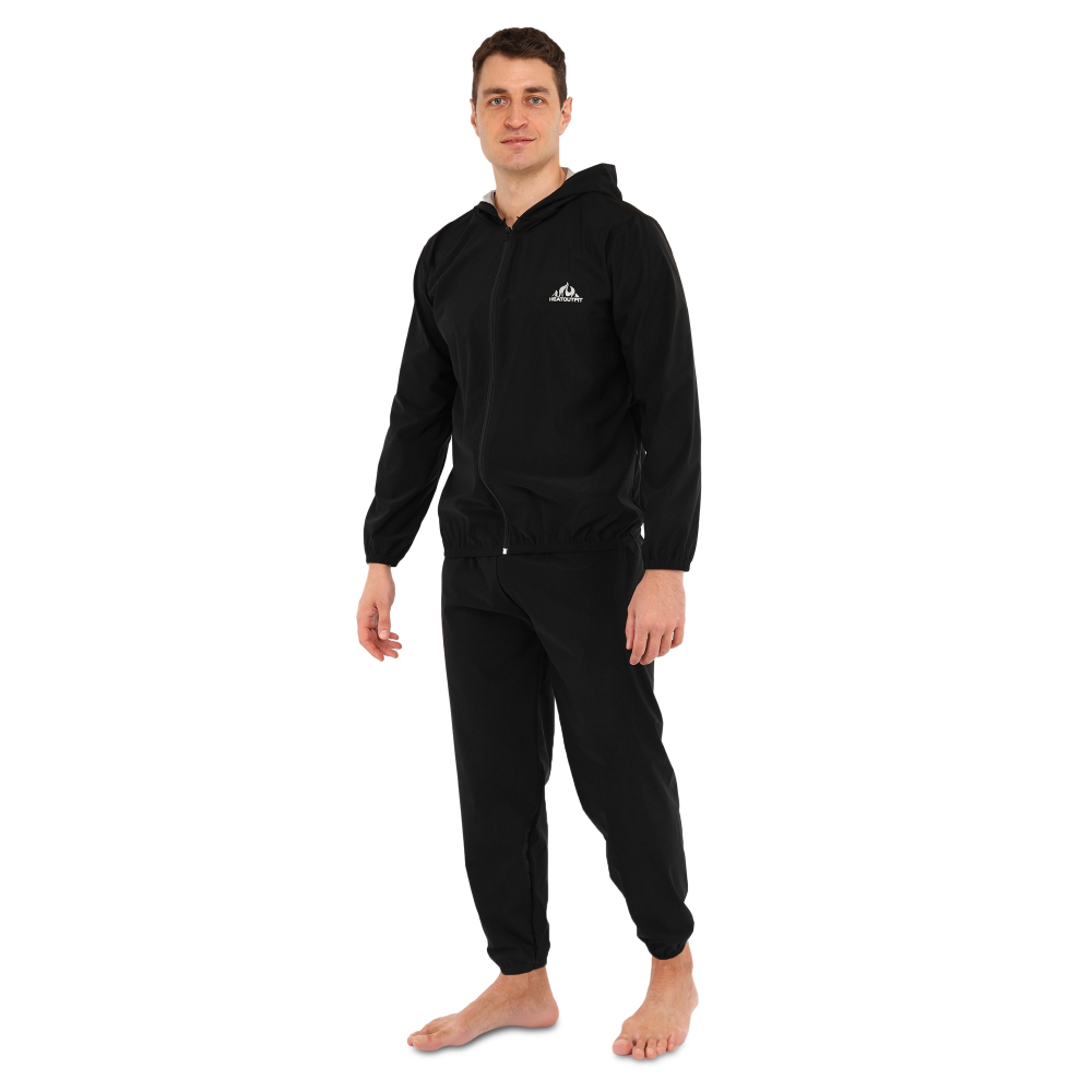 Костюм выполнен в черном цвете и подходит для мужчин и женщин благодаря универсальному дизайну. В куртке предусмотрены боковые и вырезные карманы, которые позволяют взять с собой на тренировку небольшие личные вещи. Капюшон позволяет накрыть голову, чтобы еще больше усилить эффект сауны. Куртка застегивается на молнию, что позволяет легко и быстро снять или надеть ее.