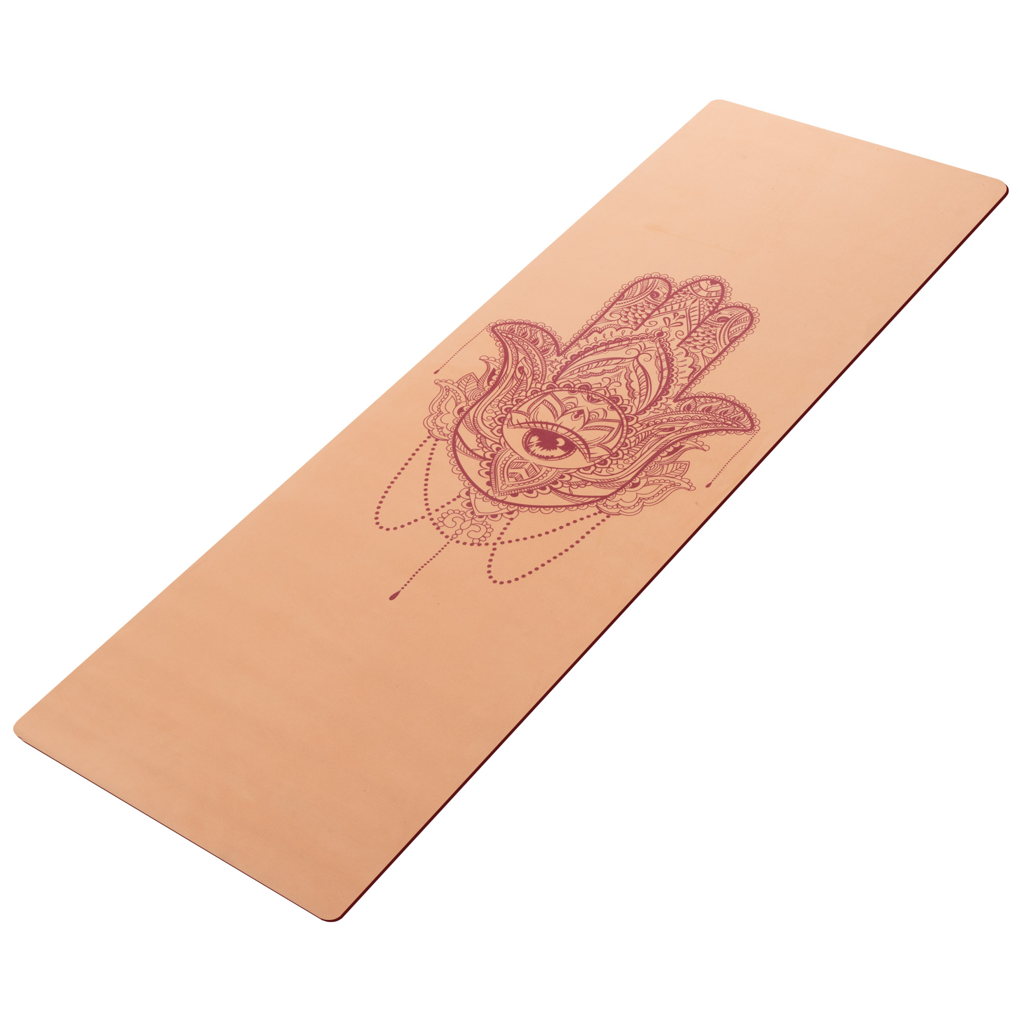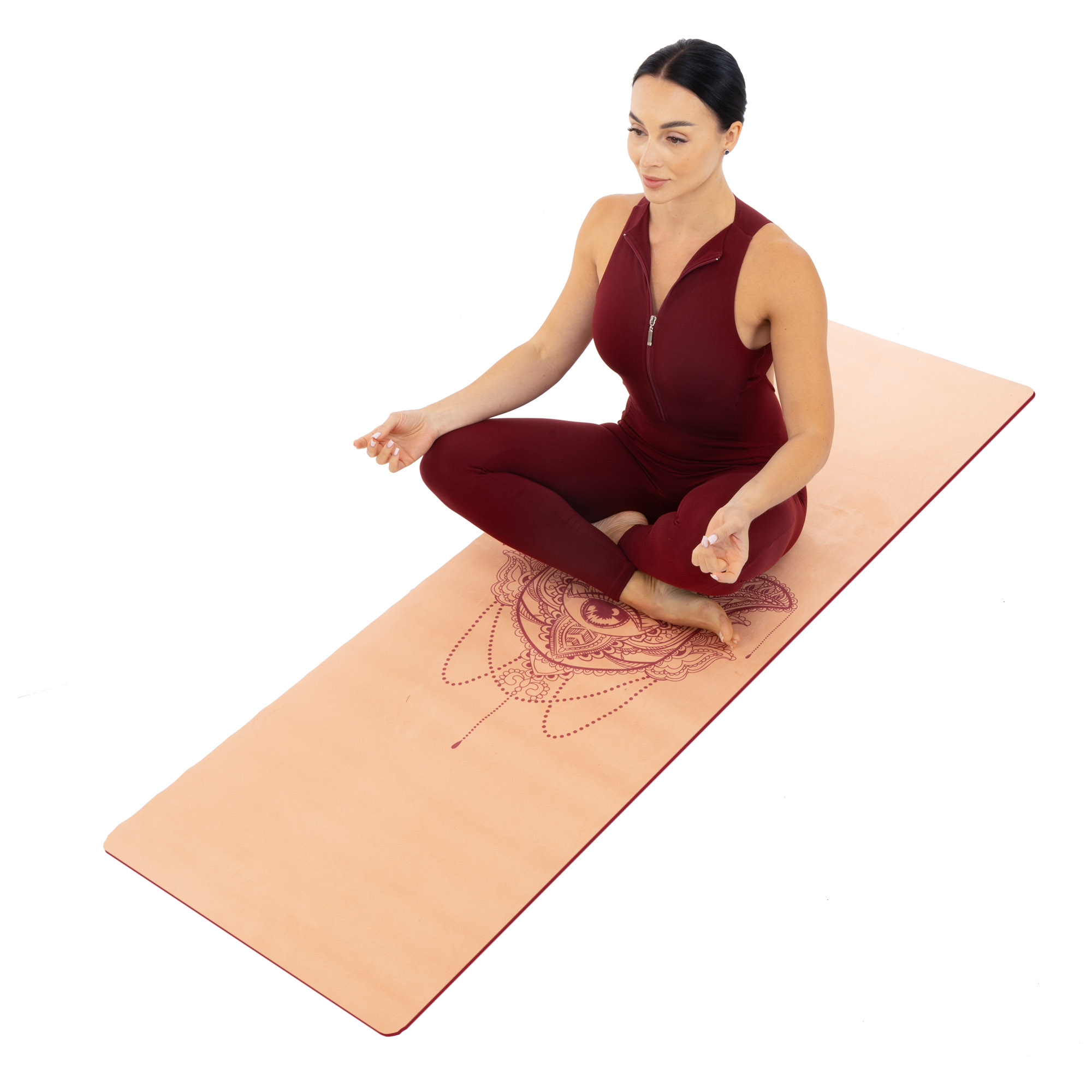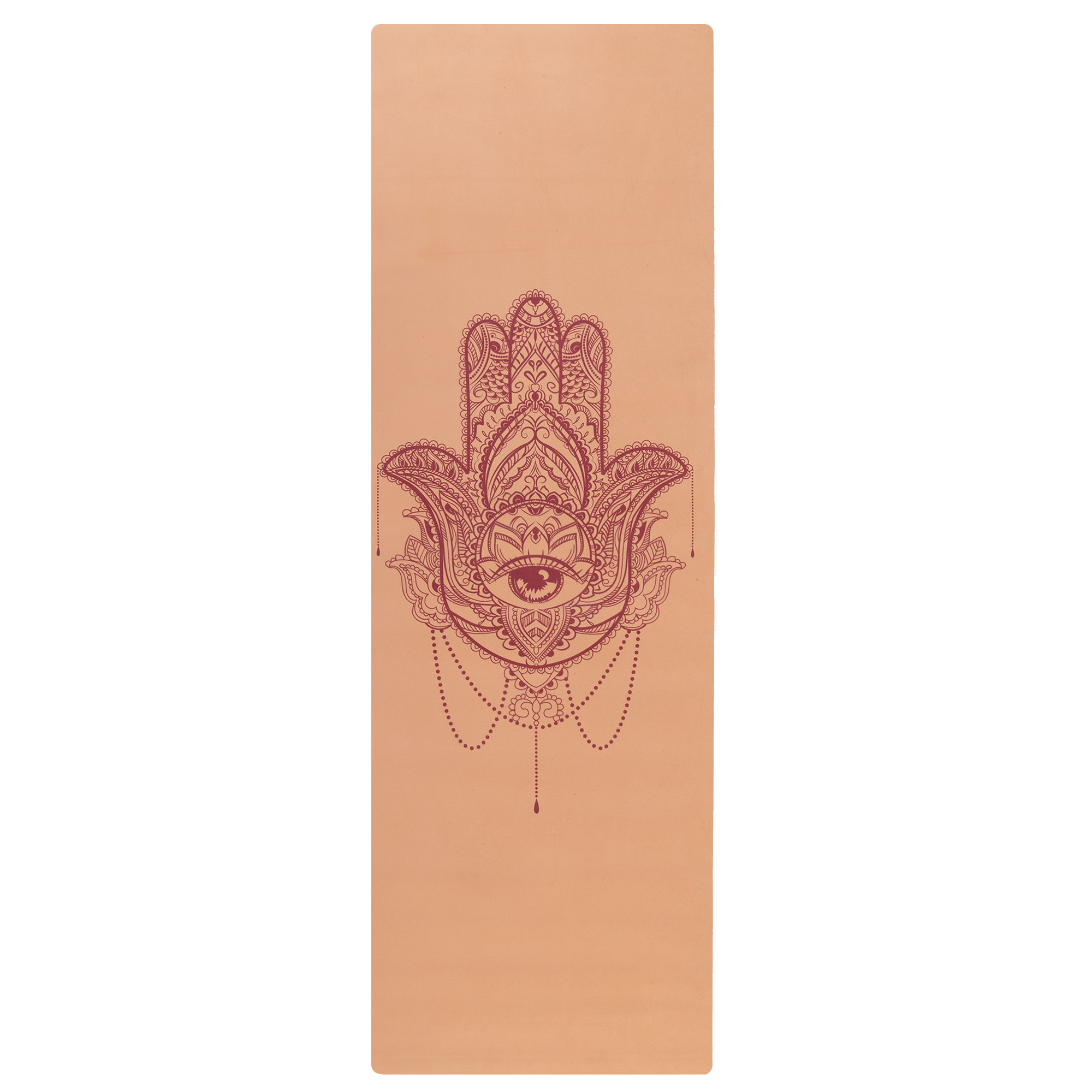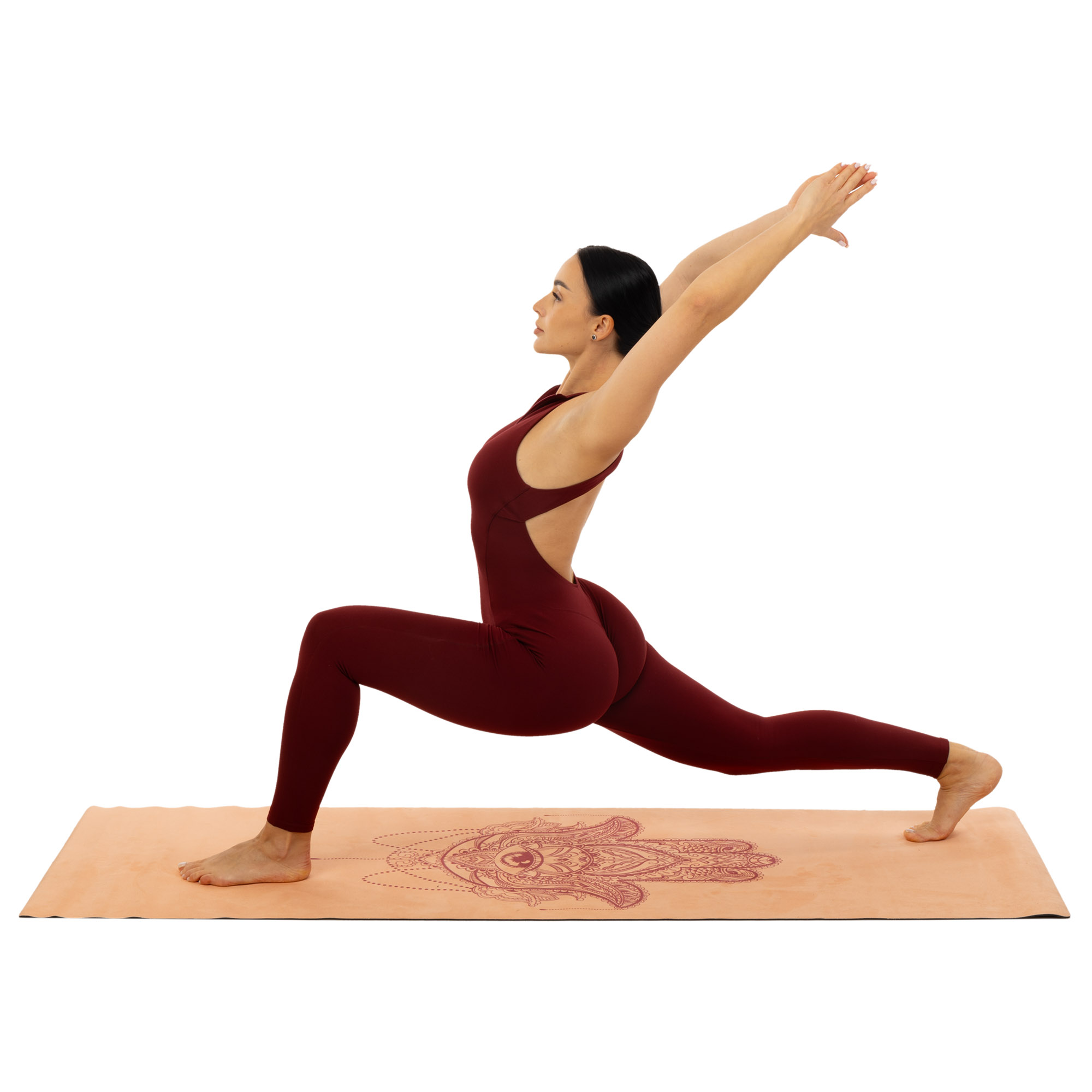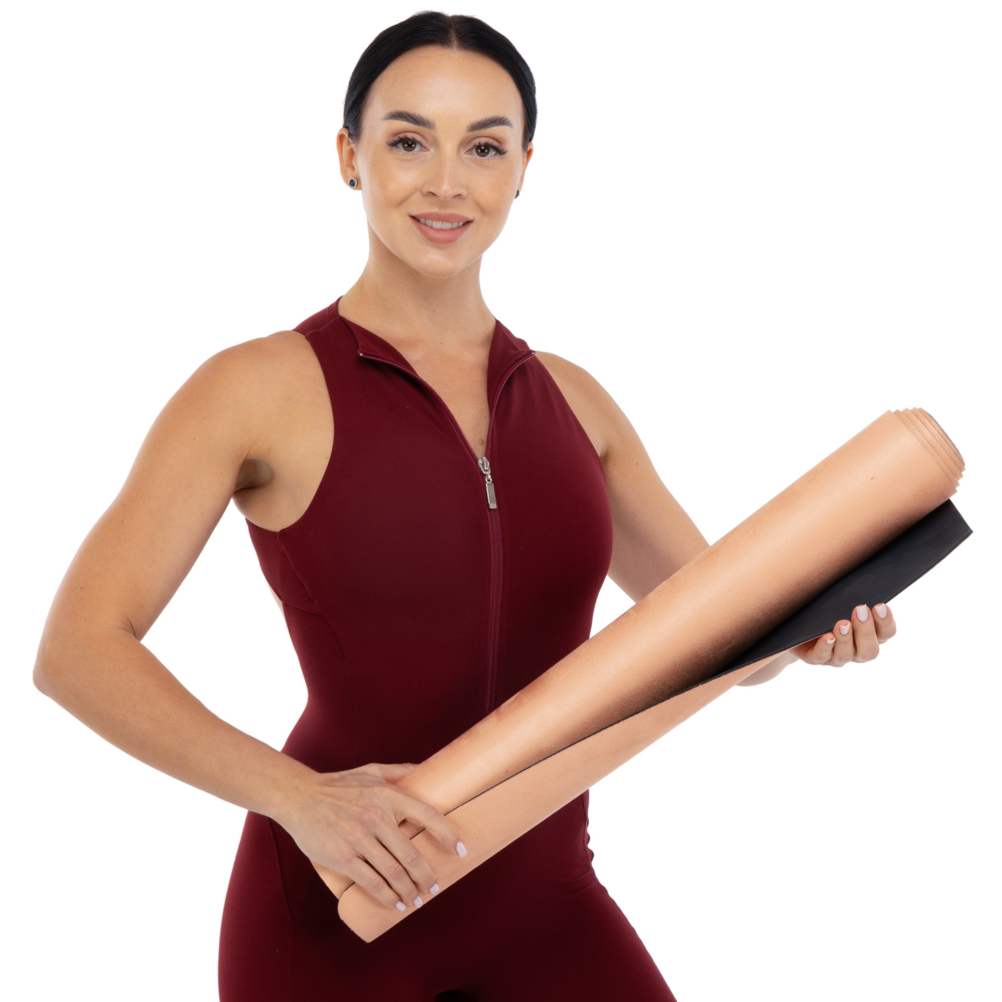 Двухслойный коврик состоит из слоя каучука и слоя замши. Замшевый верх имеет интересный принт, который позволяет не только комфортно тренироваться, но и получать эстетическое удовольствие от занятий. Лицевая поверхность коврика не скользкая. Отличной липкостью обладает тыльная сторона, изготовленная из каучука. Этот материал хорошо прилипает к различным покрытиям и точно не будет скользить.