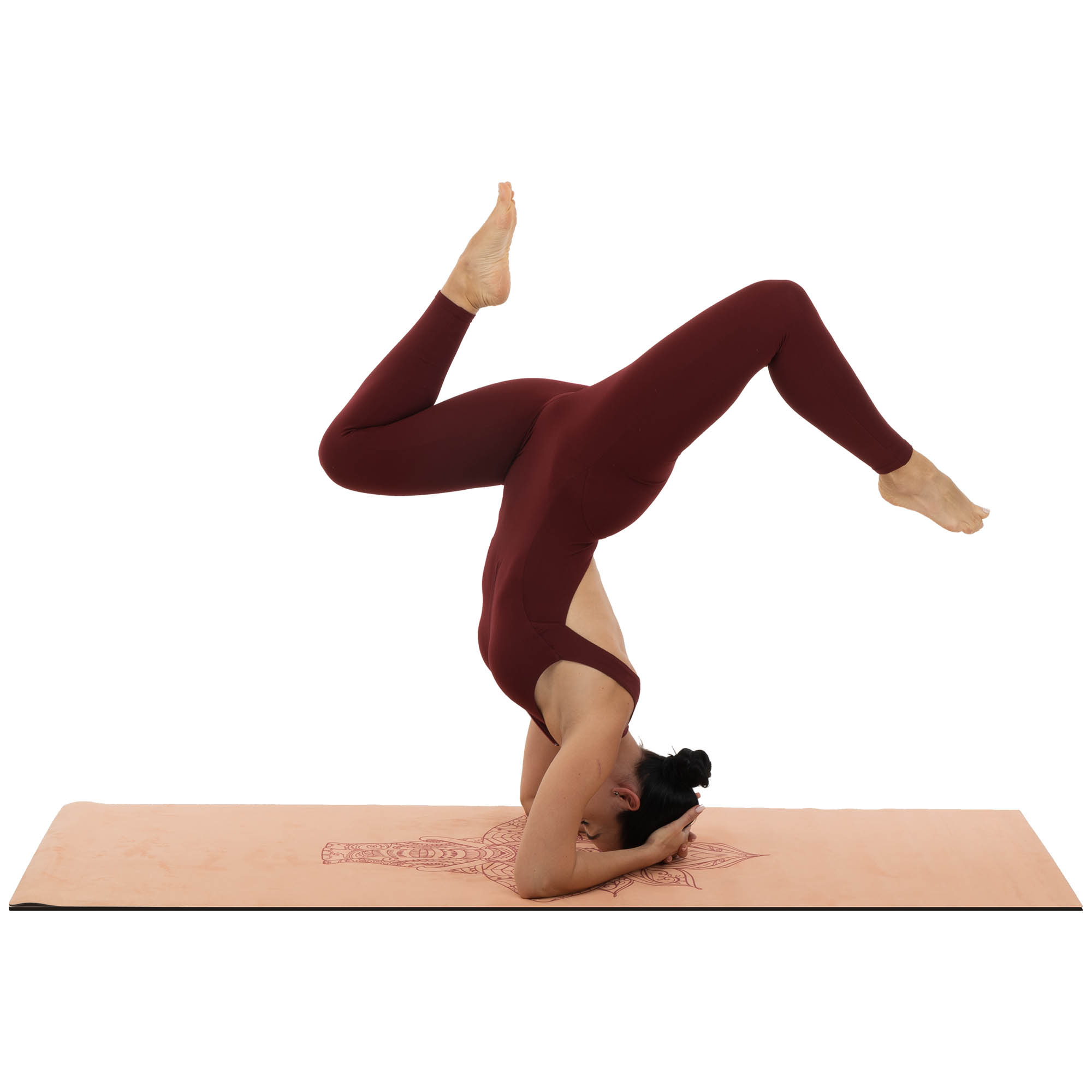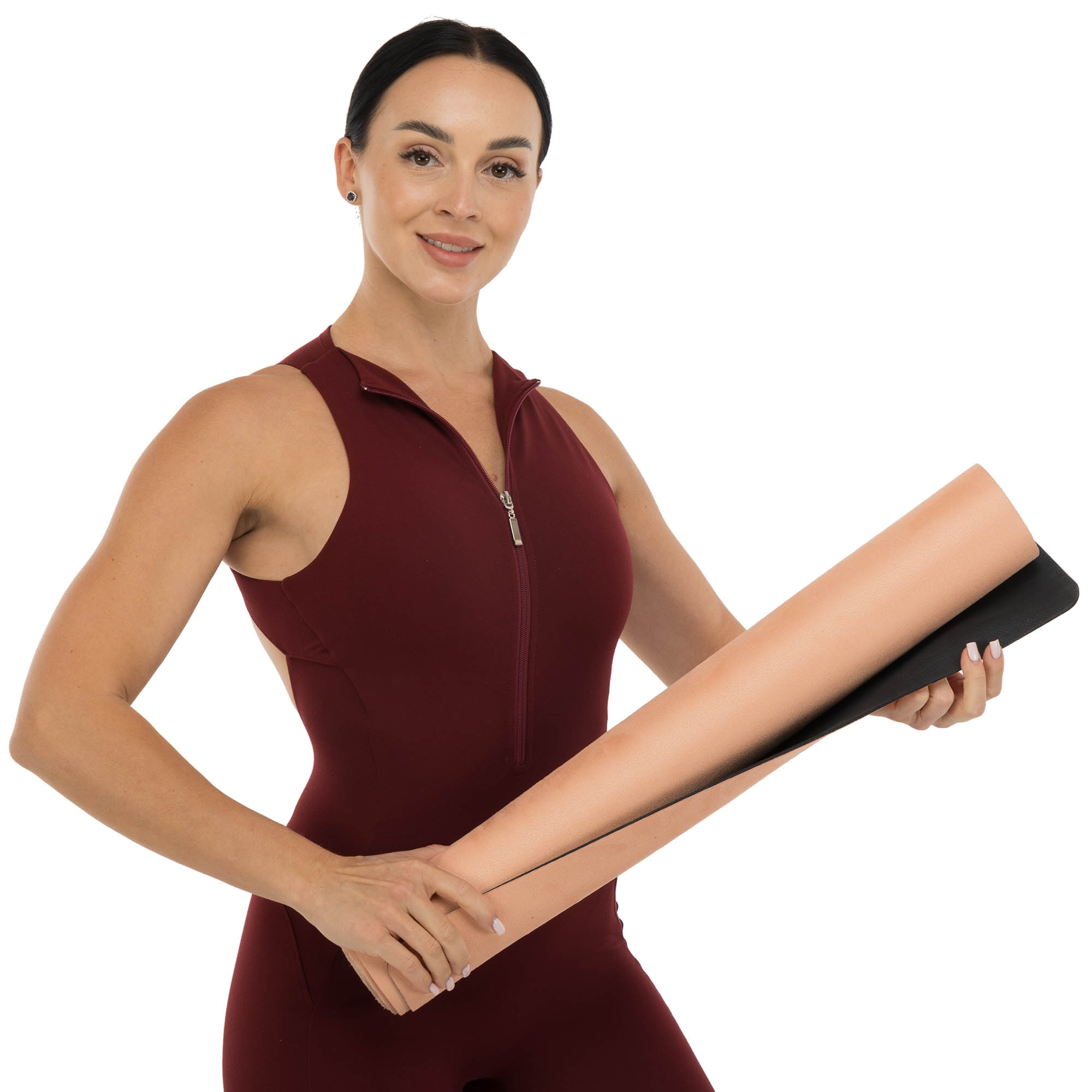 Двухслойный коврик состоит из слоя каучука и слоя замши. Замшевый верх имеет интересный принт, который позволяет не только комфортно тренироваться, но и получать эстетическое удовольствие от занятий. Лицевая поверхность коврика не скользкая. Отличной липкостью обладает тыльная сторона, изготовленная из каучука. Этот материал хорошо прилипает к различным покрытиям и точно не будет скользить.