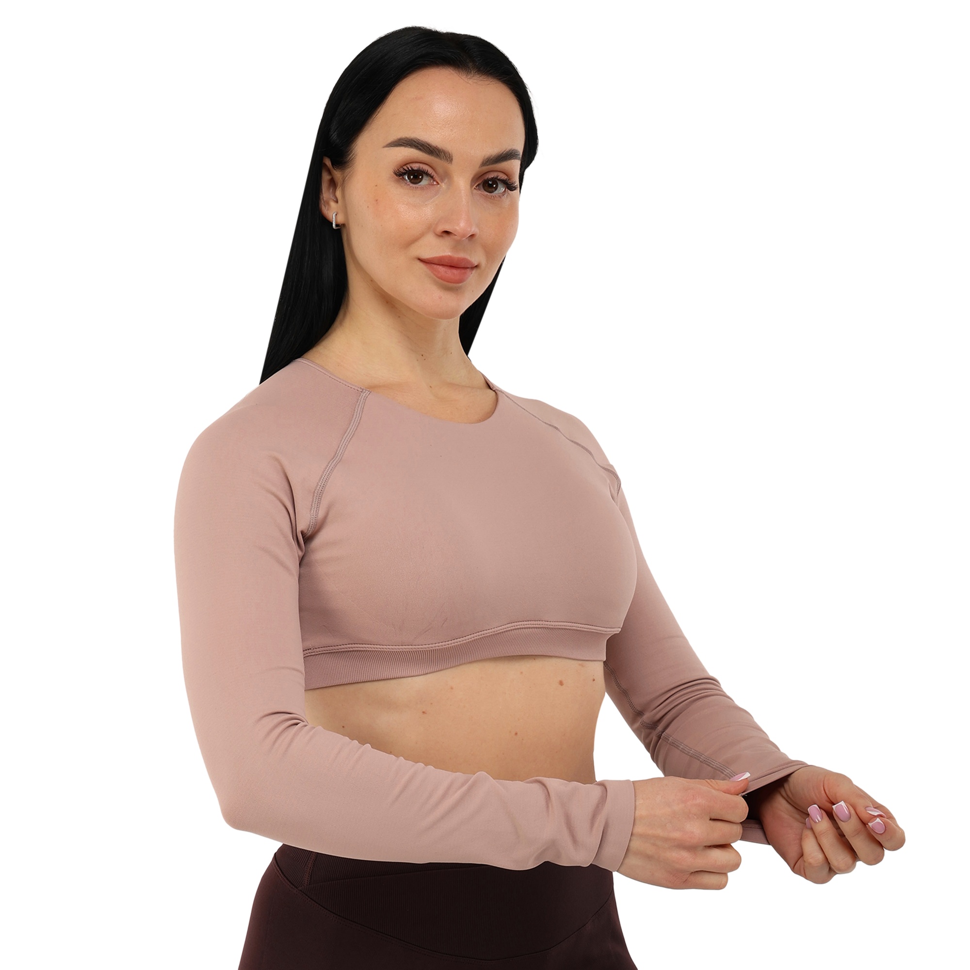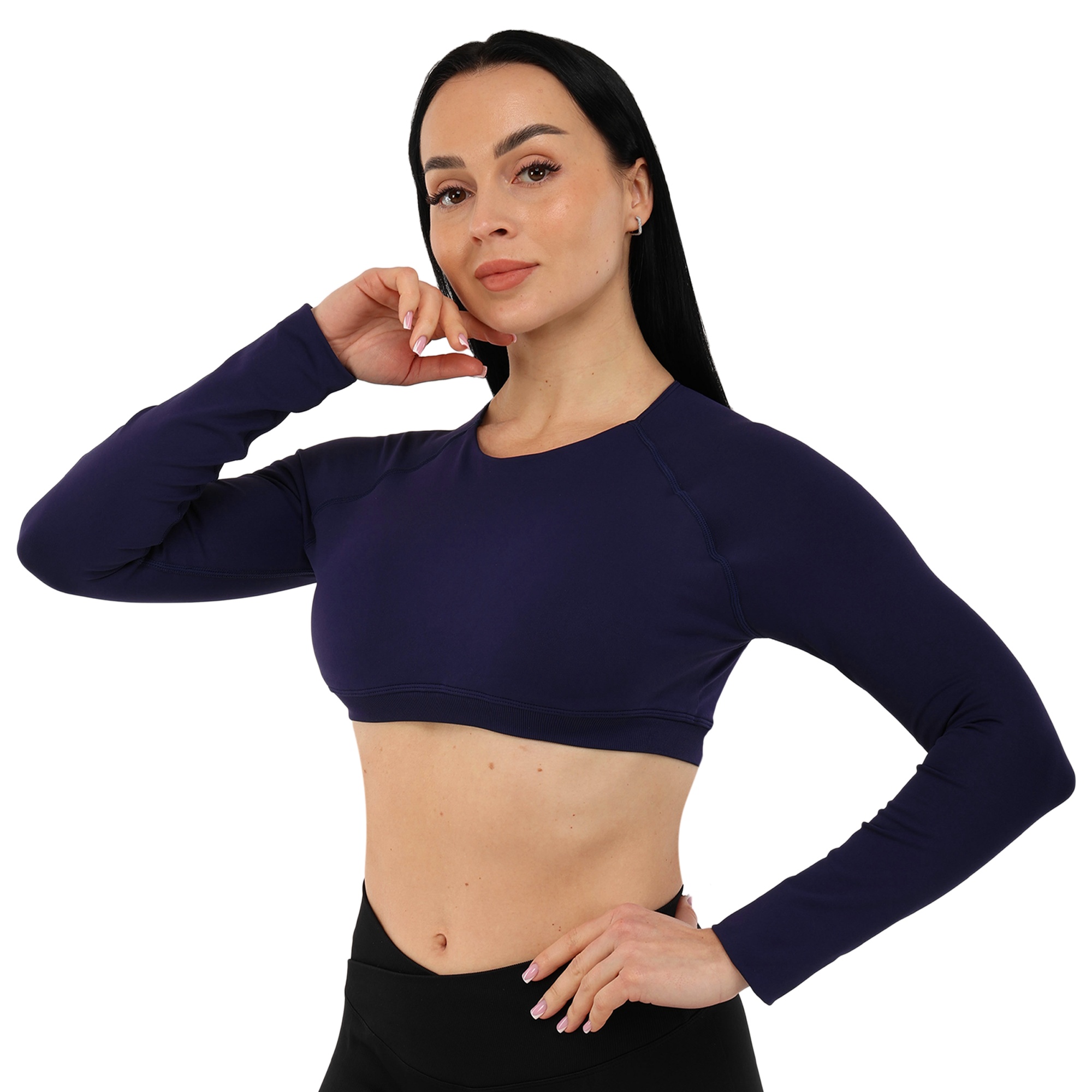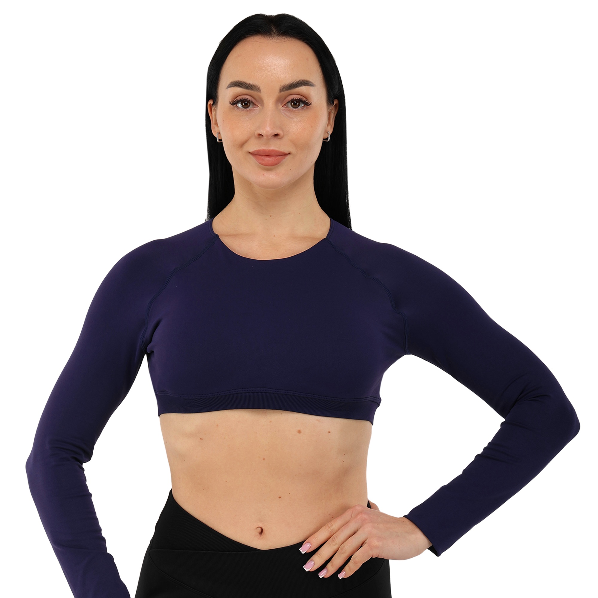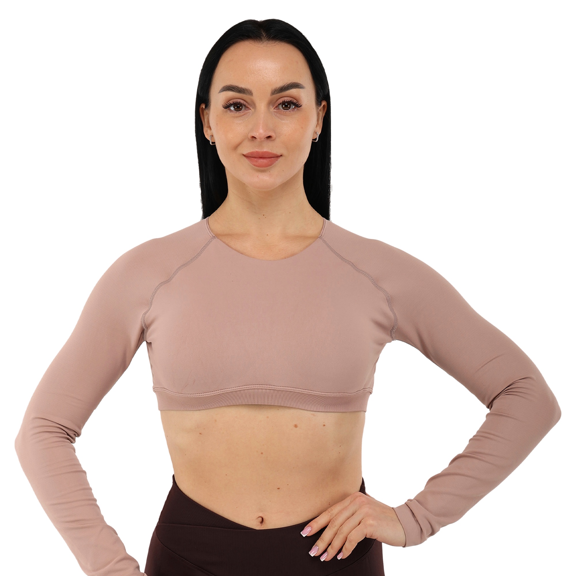 Женский кроп-топ с длинным рукавом можно использовать для занятий фитнесом, йогой, пилатесом, стретчингом, а также для повседневной носки или в качестве домашней одежды. Одежда обеспечивает максимальную свободу движений благодаря легкости и эластичности ткани. Она подчеркивает спортивную фигуру. Избежать натирания кожи в процессе выполнения активных движений позволяют плоские швы.