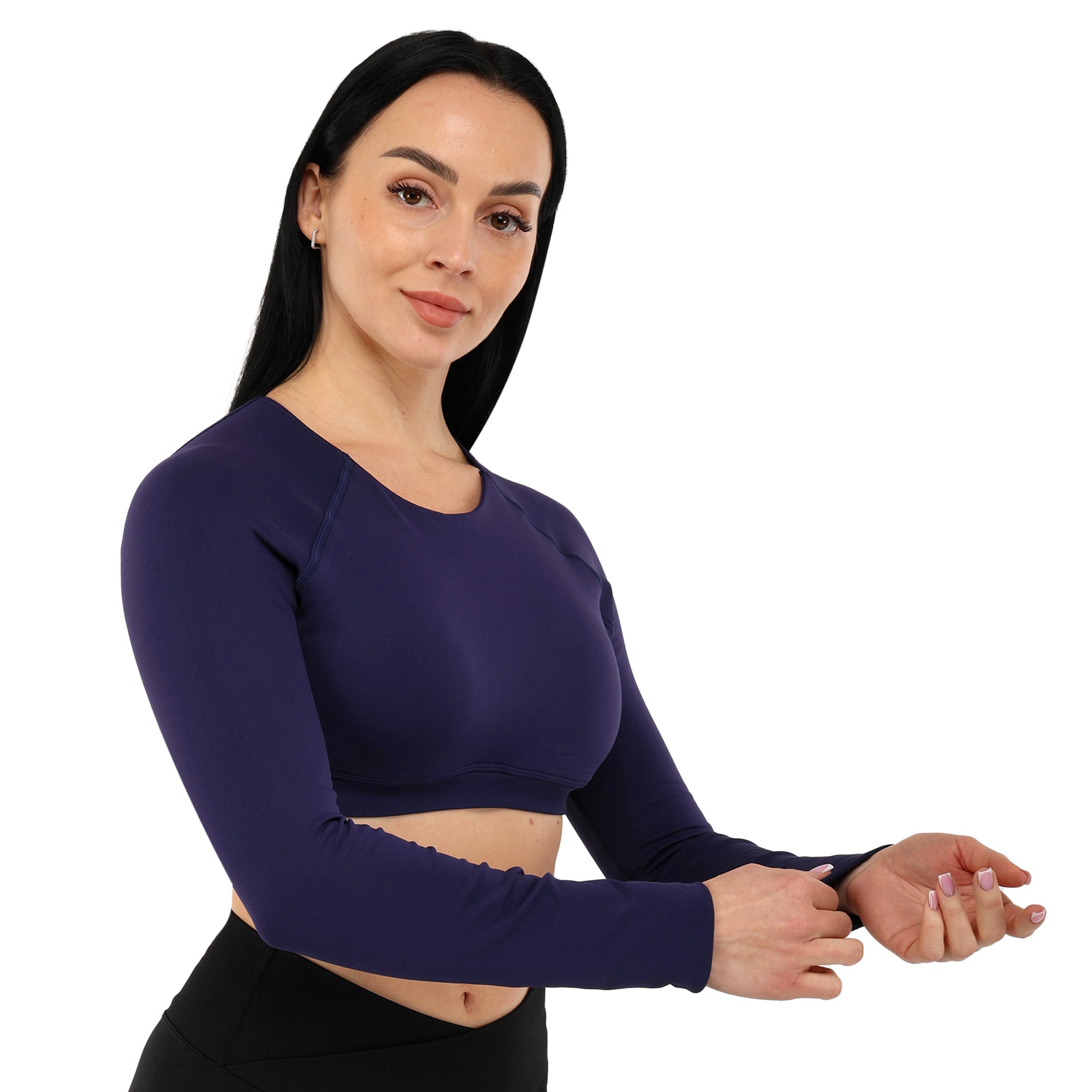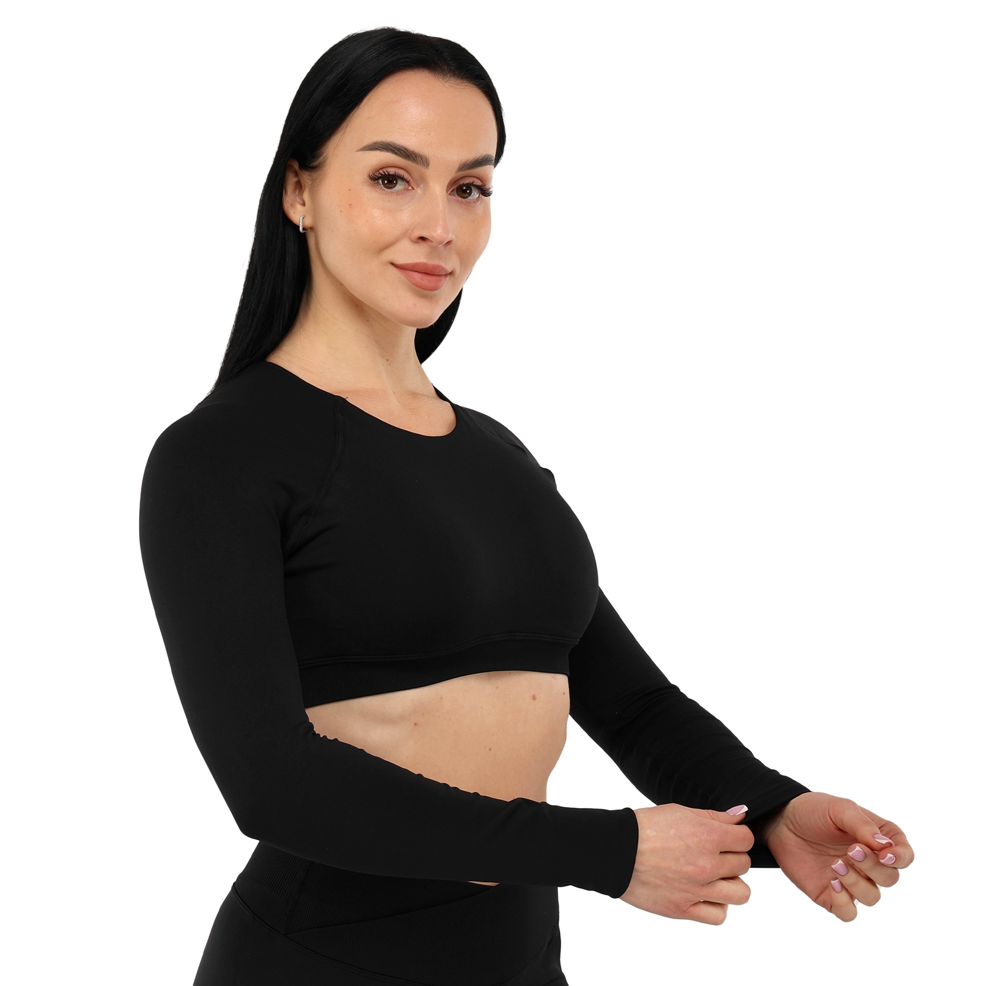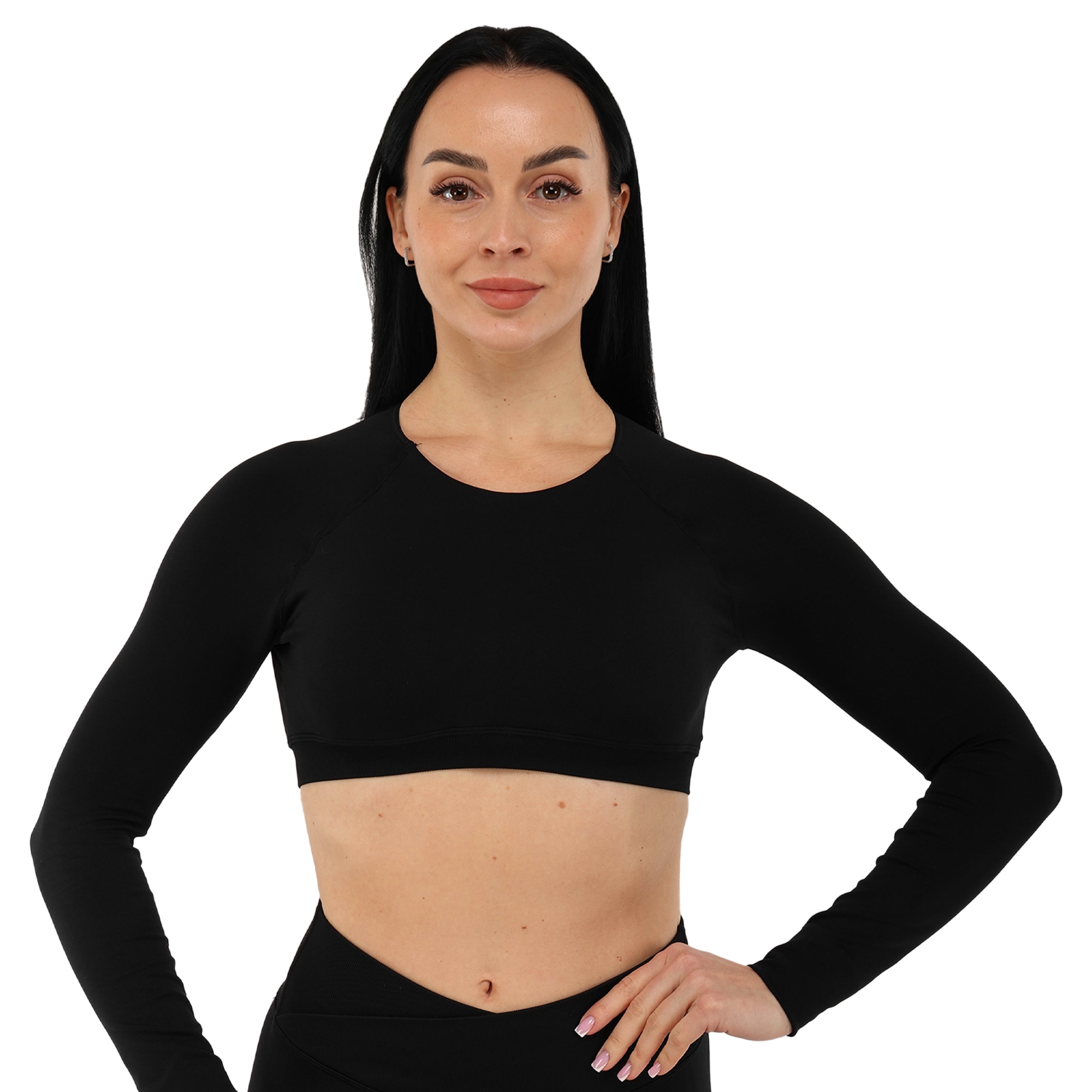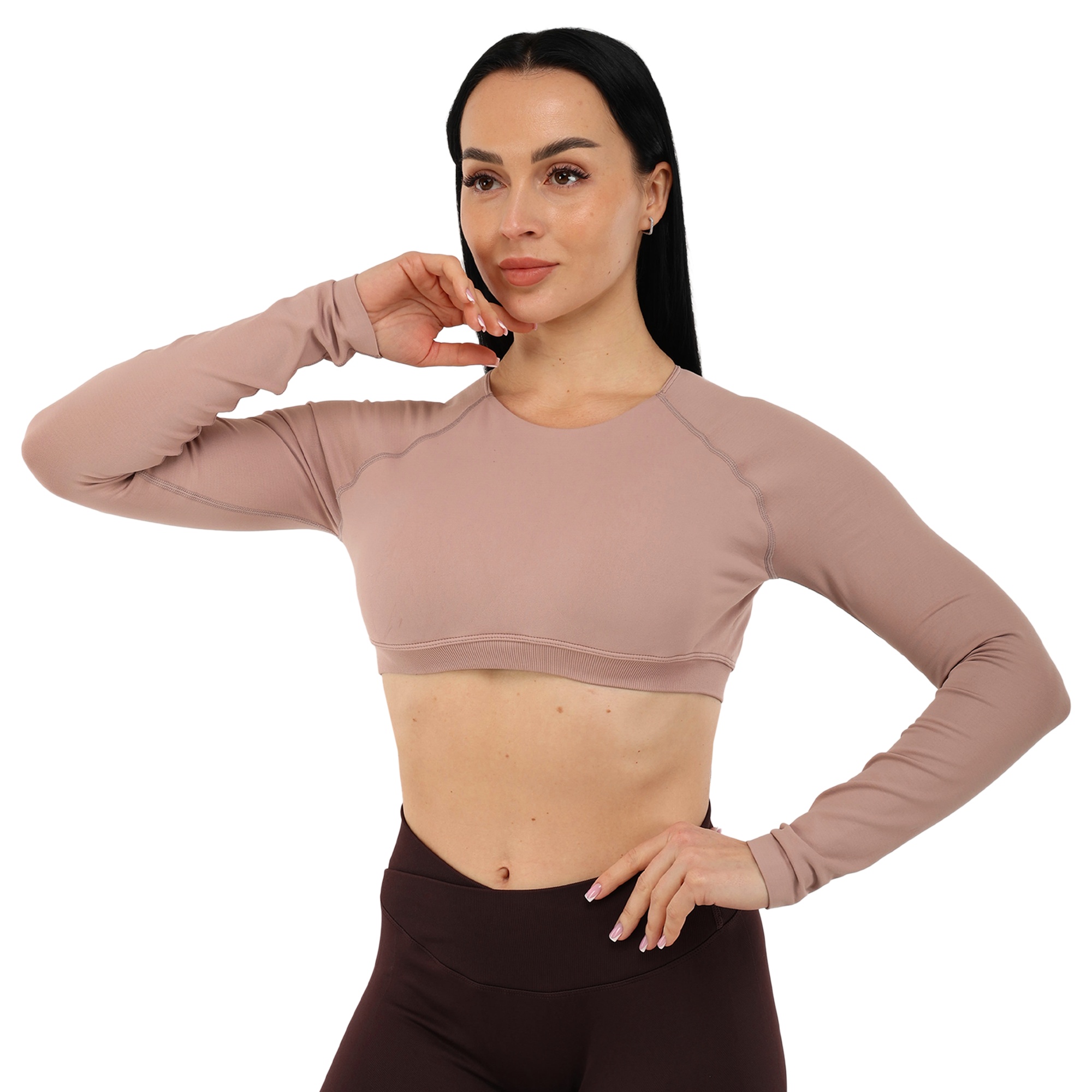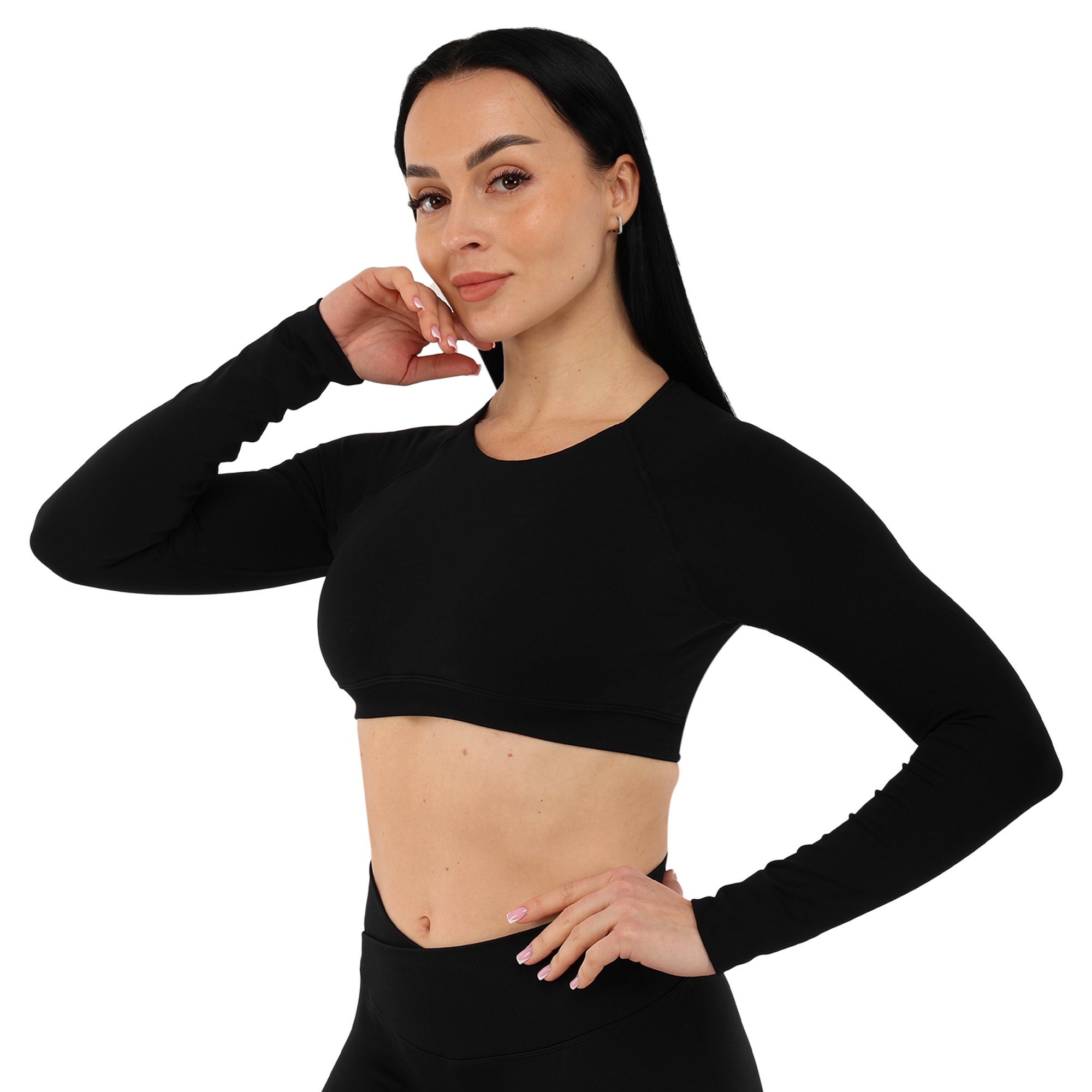 Женский кроп-топ с длинным рукавом можно использовать для занятий фитнесом, йогой, пилатесом, стретчингом, а также для повседневной носки или в качестве домашней одежды. Одежда обеспечивает максимальную свободу движений благодаря легкости и эластичности ткани. Она подчеркивает спортивную фигуру. Избежать натирания кожи в процессе выполнения активных движений позволяют плоские швы.