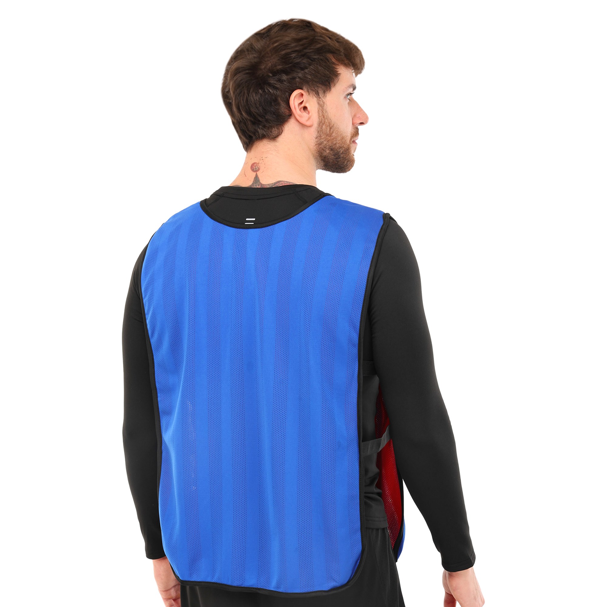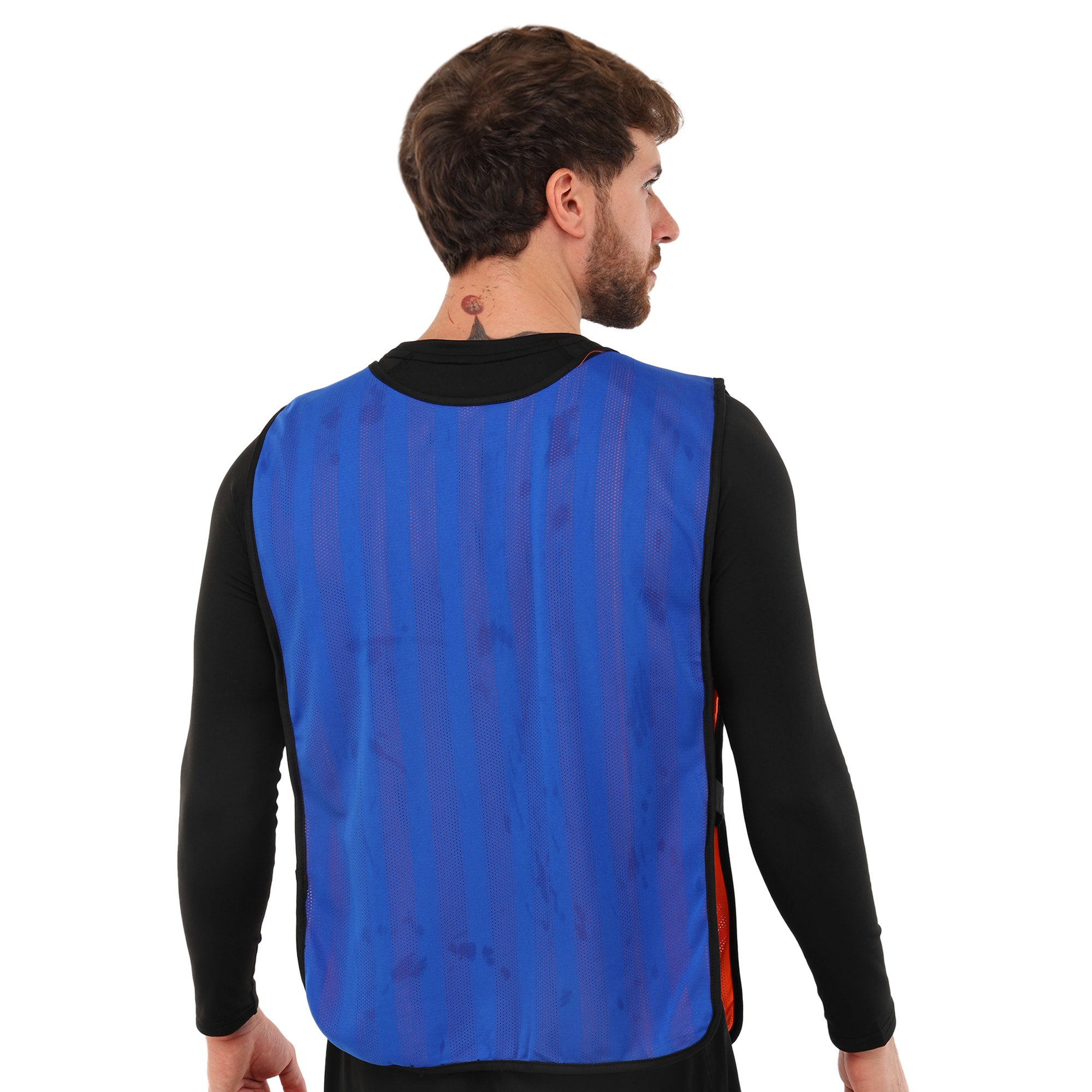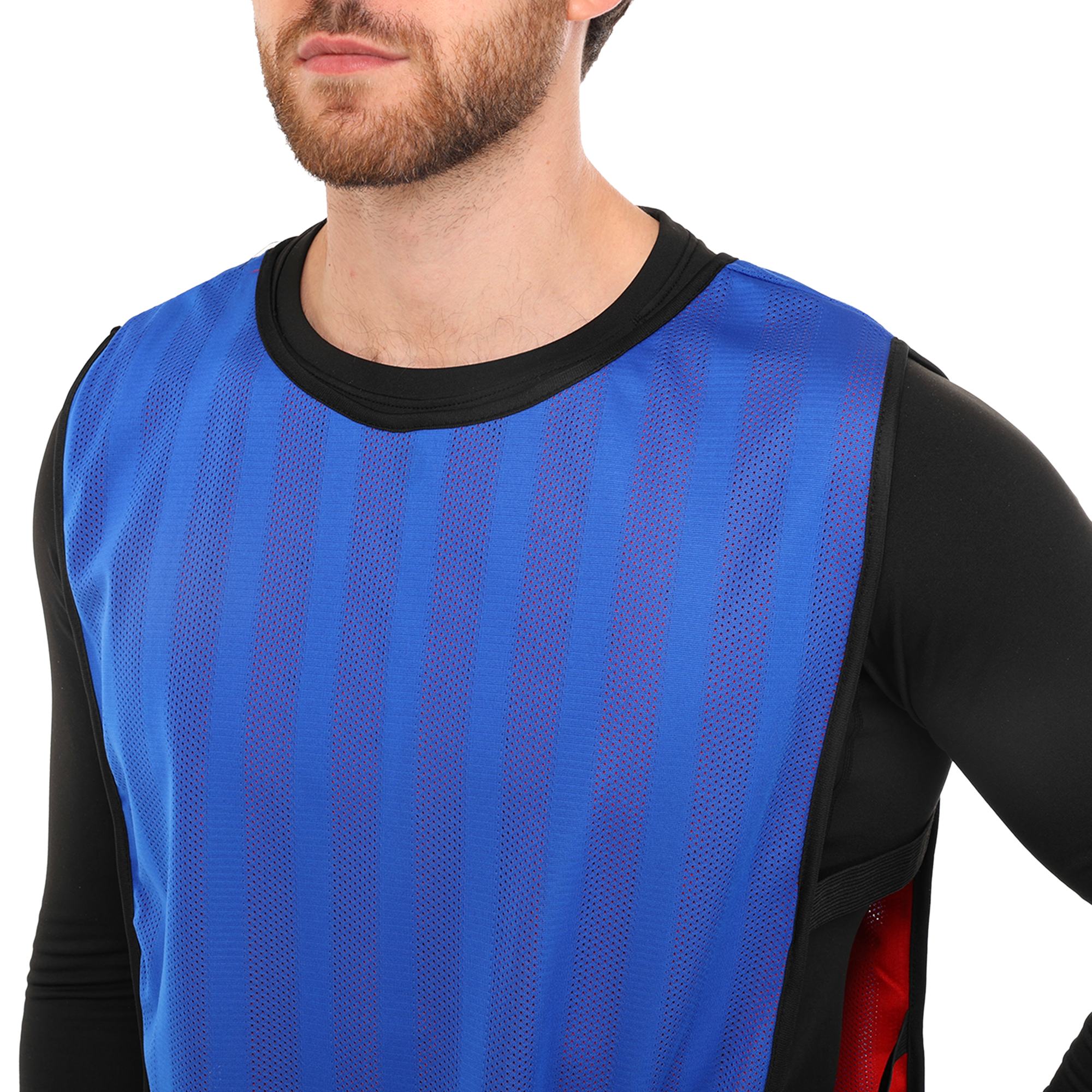 Двусторонняя накидка состоит из двух частей, соединенных резинками. Лицевая и изнаночная стороны окрашены в разные цвета. Игрок может быстро и легко надеть ее поверх формы любой стороной. Размер манишки: 68х43 см.
