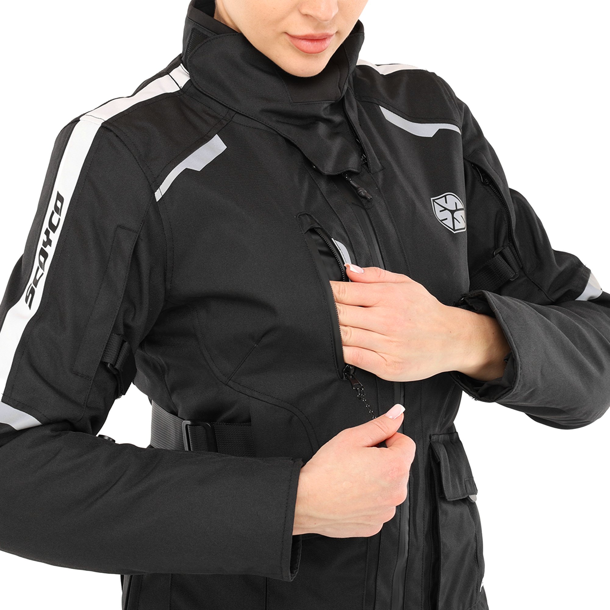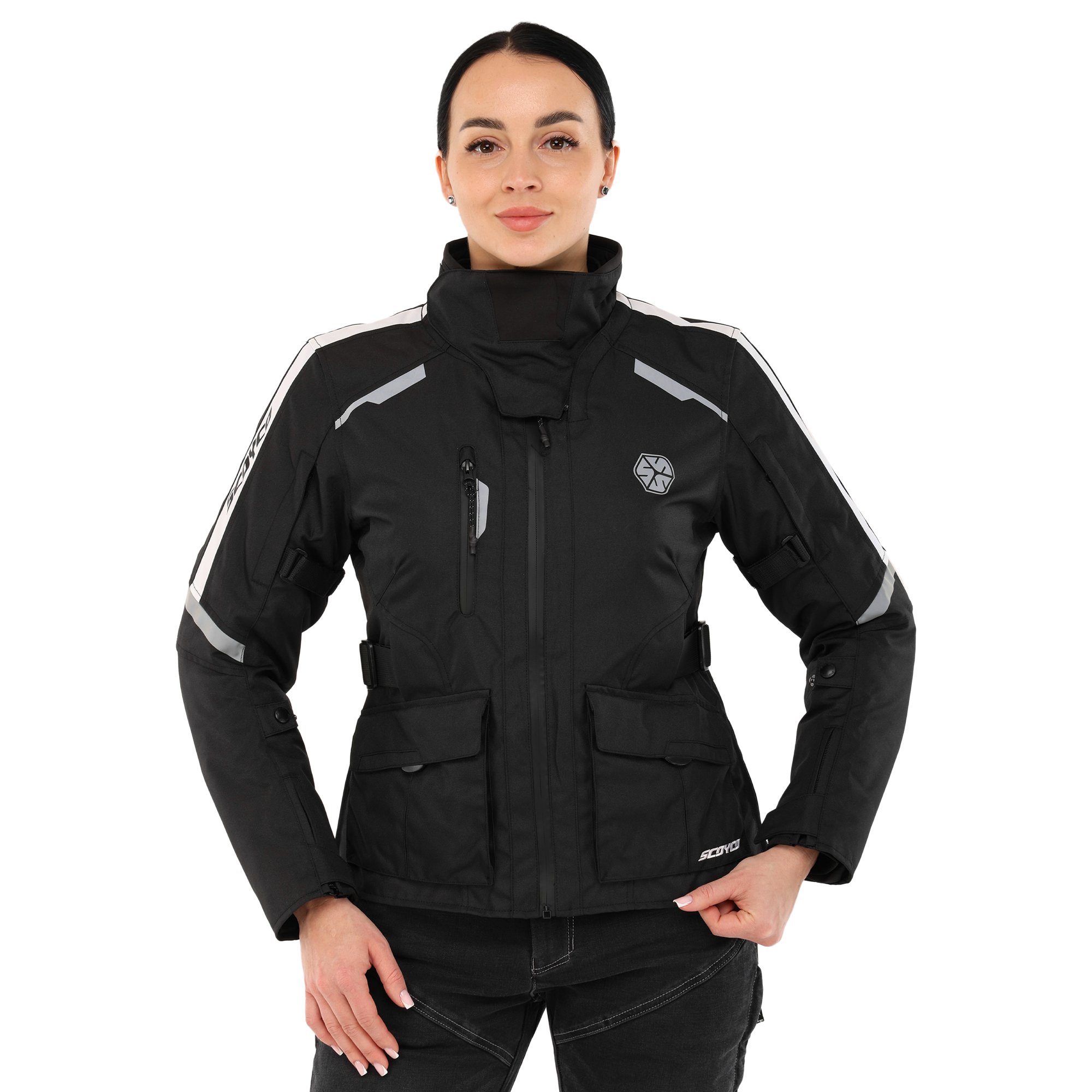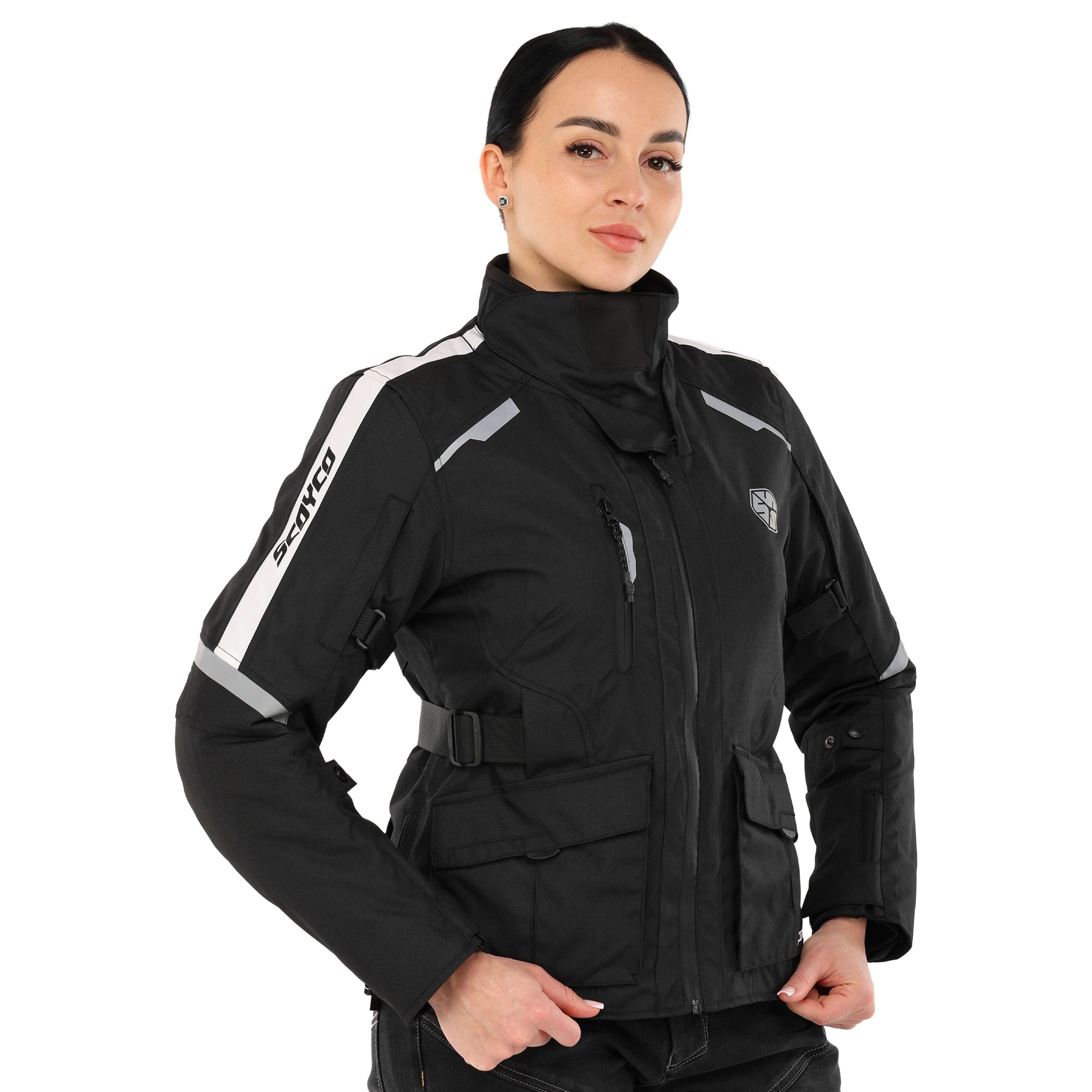 Оригинальная женская куртка известного бренда мототоваров SCOYCO — это многофункциональная экипировка с высоким уровнем защиты и стильным современным дизайном. Модель выполнена из прочной смесовой ткани саржевого плетения и оснащена протекторами ESA, которые снижают риск травм и повышают безопасность мотоциклиста.