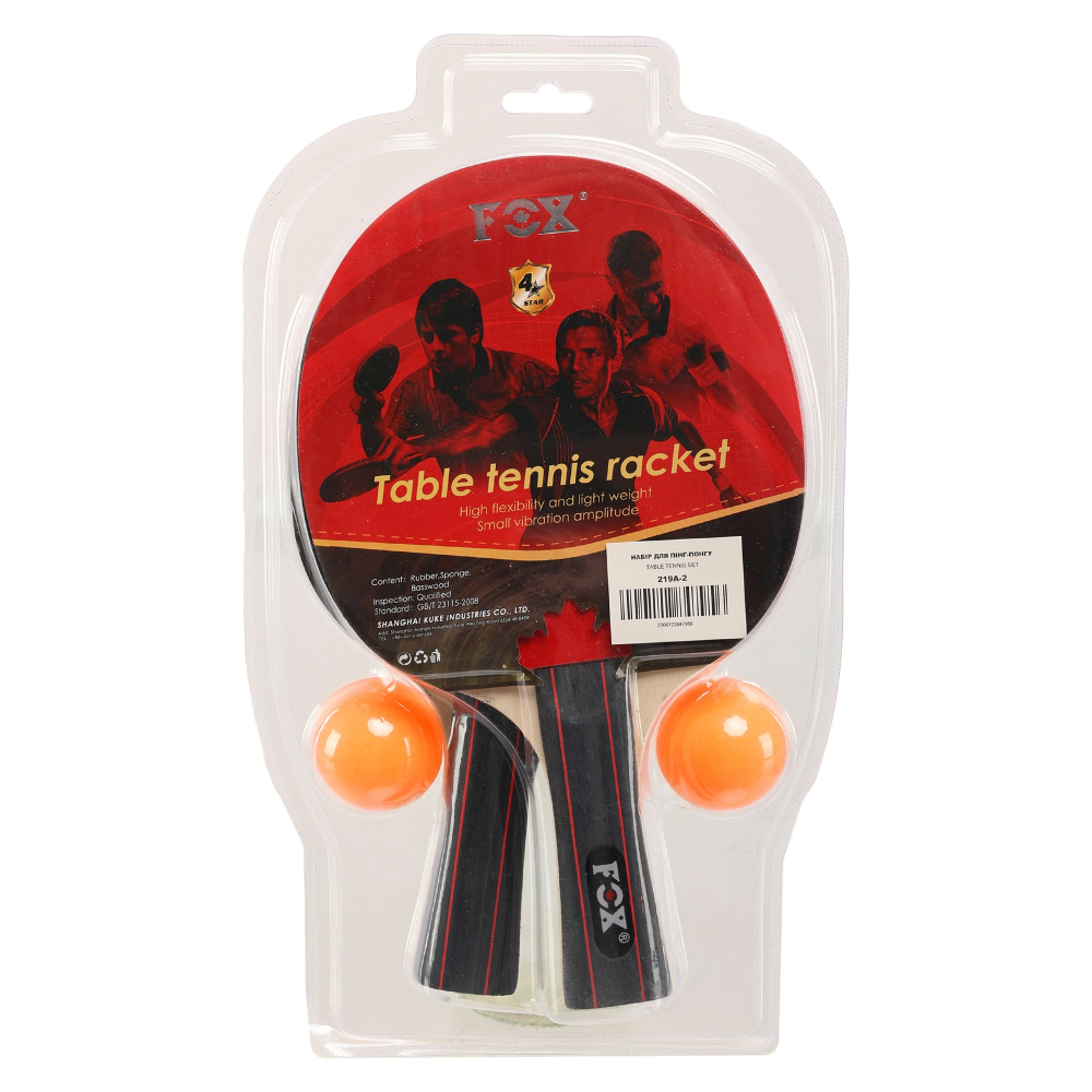 Набор для настольного тенниса FOX 219A-2 включает пару ракеток и мячей. Ракетка изготовлена из дерева и имеет резиновое покрытие, которое позволяет гасить вибрацию от ударов и делать их более точными. Благодаря гладкой поверхности ракетки можно использовать для игры в любом стиле. Также они подходят для игроков любого уровня.