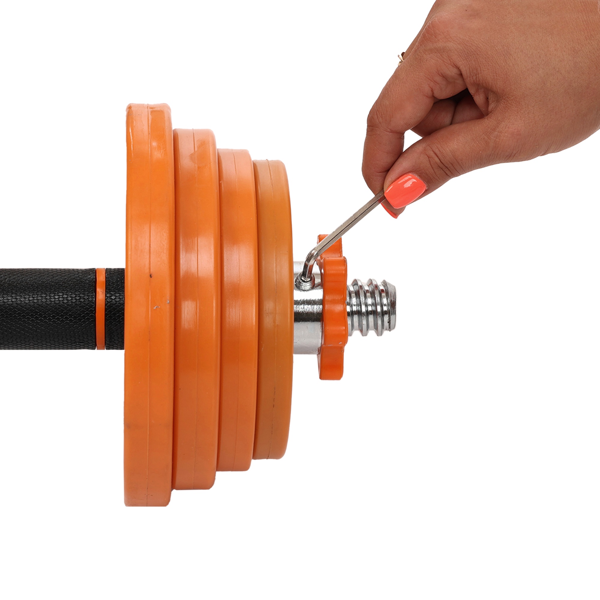 Гриф выполнен из стали с резиновыми вставками, которые добавляют сцепления и комфорта в каждой повторяющейся амплитуде движения. Тип замка — гайка, надежно фиксирует блины, исключая опасное смещение во время тренировки.