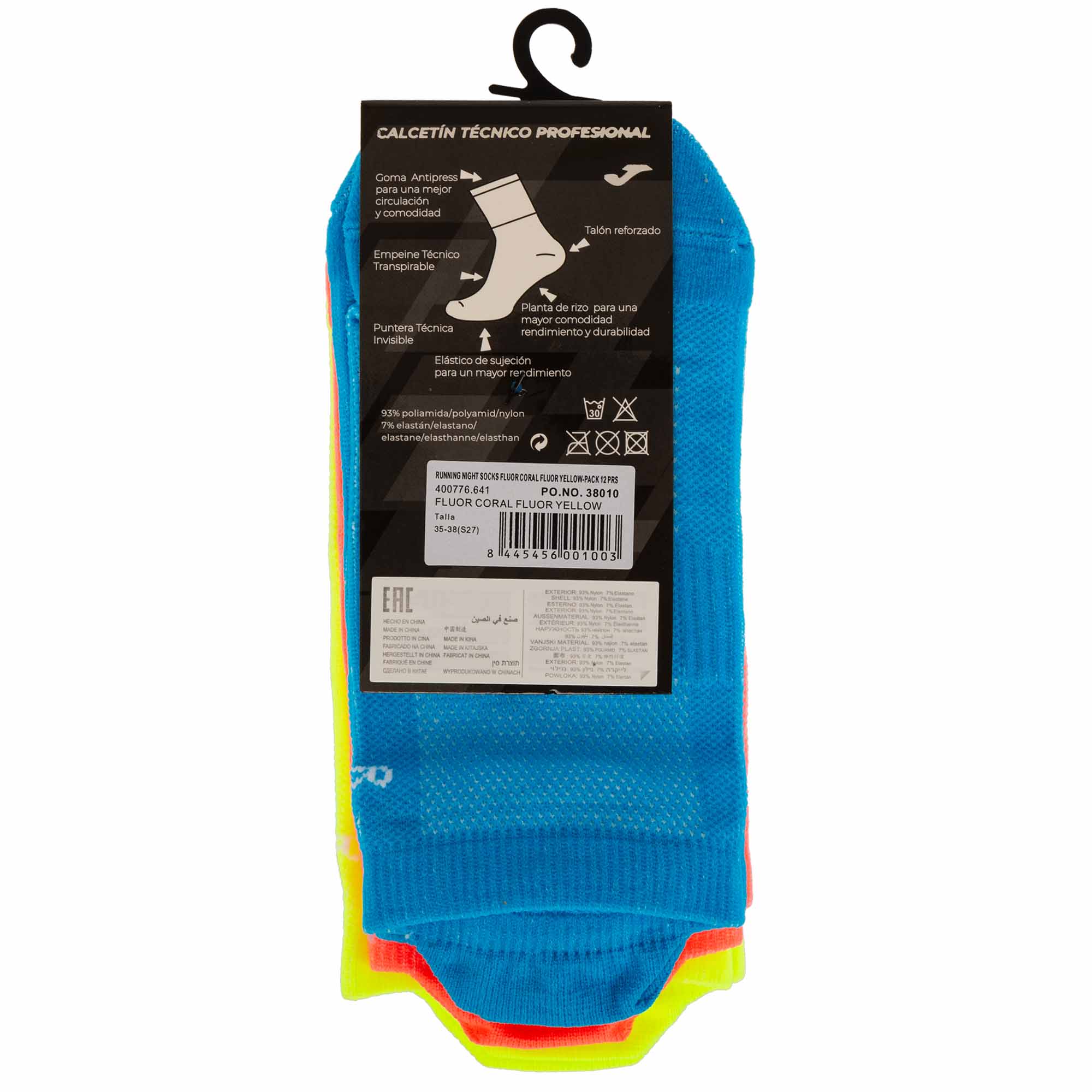 Короткие спортивные носки Joma SPORT имеют привлекательный яркий дизайн и продаются в наборе, который состоит из трёх пар. Носки изготовлены из нейлона и эластана. Такое сочетание материалов позволяет сделать их гладкими, приятными на ощупь и эластичными. Они закрывают поверхность не выше щиколотки и имеют сзади светоотражающие полоски, которые обеспечивают лучшую видимость спортсмена во время занятий спортом в тёмное время суток. В области пятки и носка присутствует усиление, которое гарантирует защиту от преждевременного износа. Благодаря использованию оптимальной ткани с компрессионными свойствами носки плотно прилегают к телу и обеспечивают максимальный комфорт во время занятий спортом. Ребристые манжеты препятствуют смещению носков. Носки не скользят в обуви, что даёт дополнительный комфорт и уверенность в каждом движении. Ткань хорошо дышит и эффективно отводит влагу, обеспечивая сухость и комфорт.