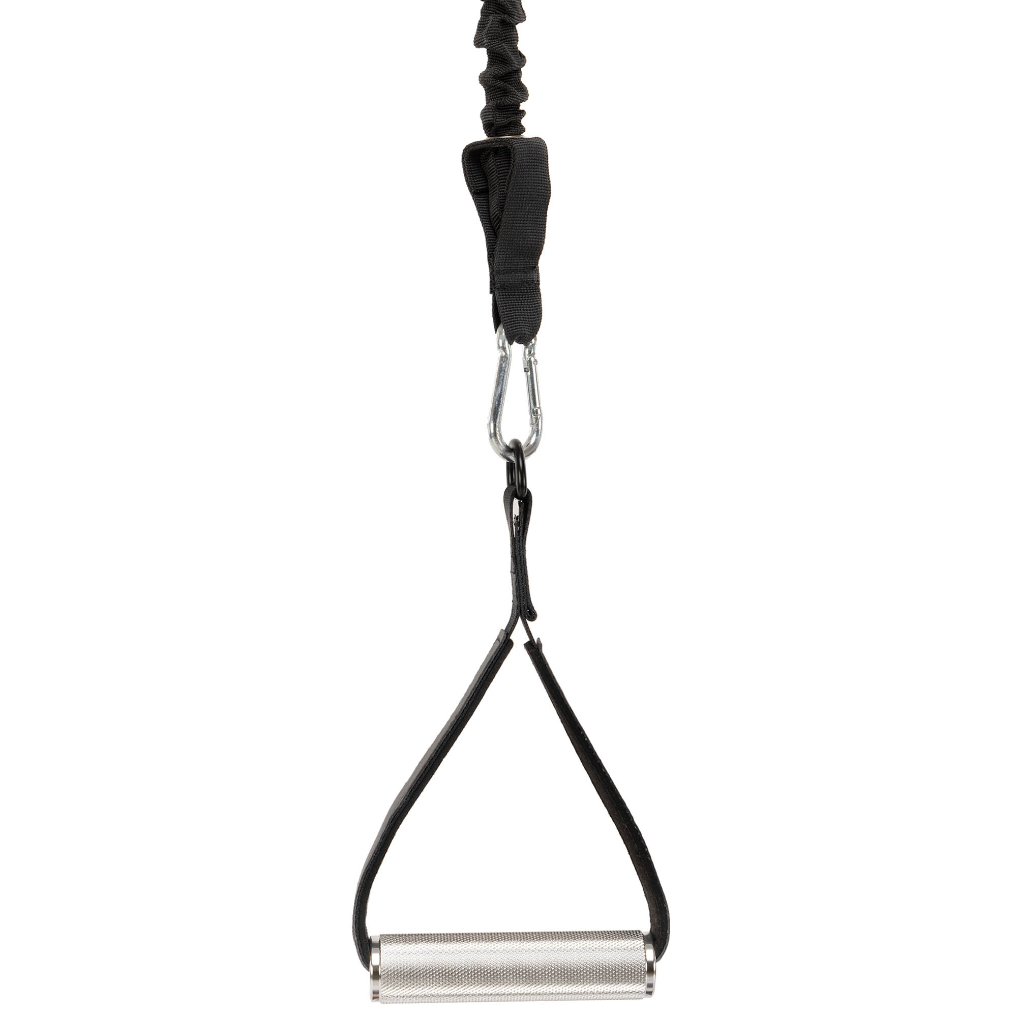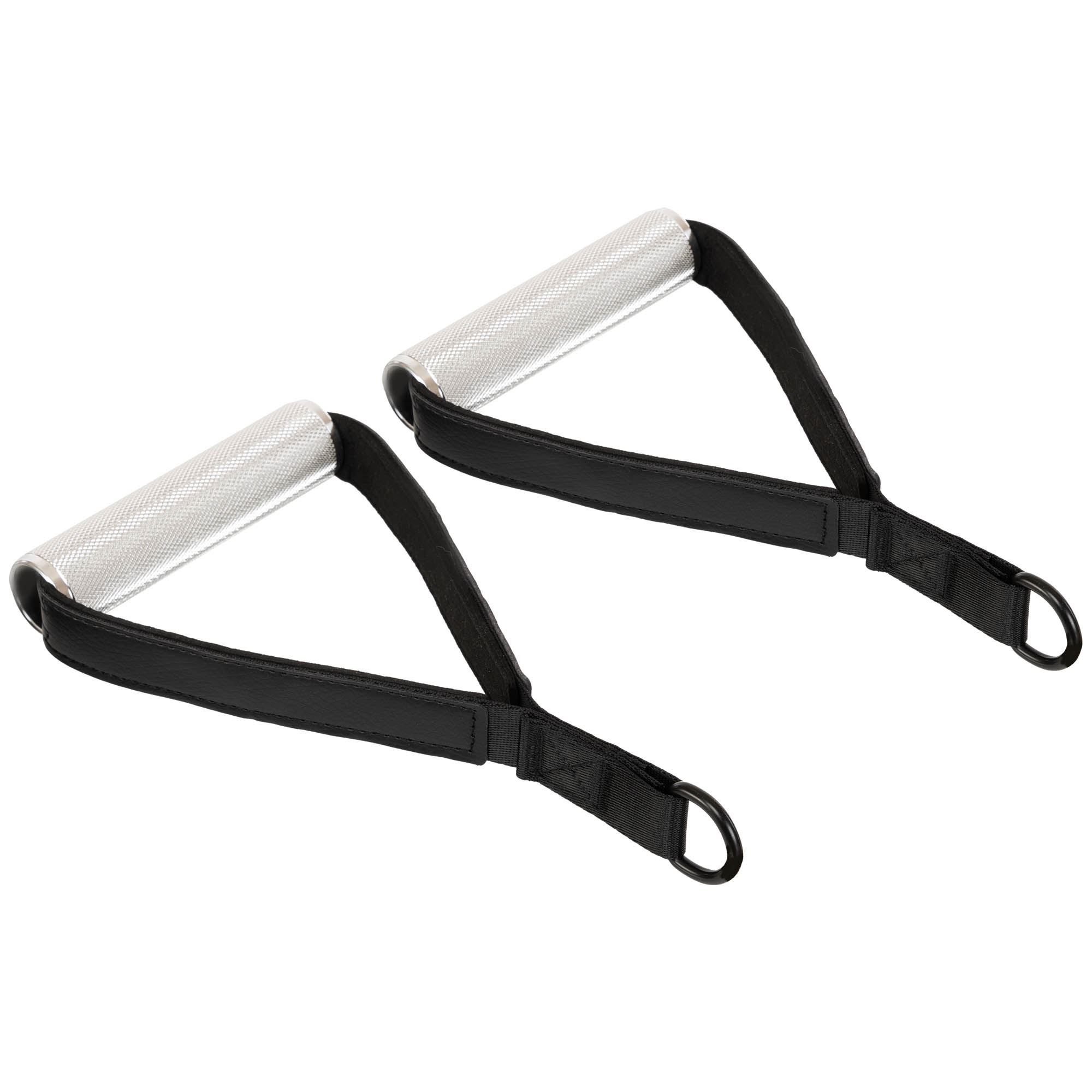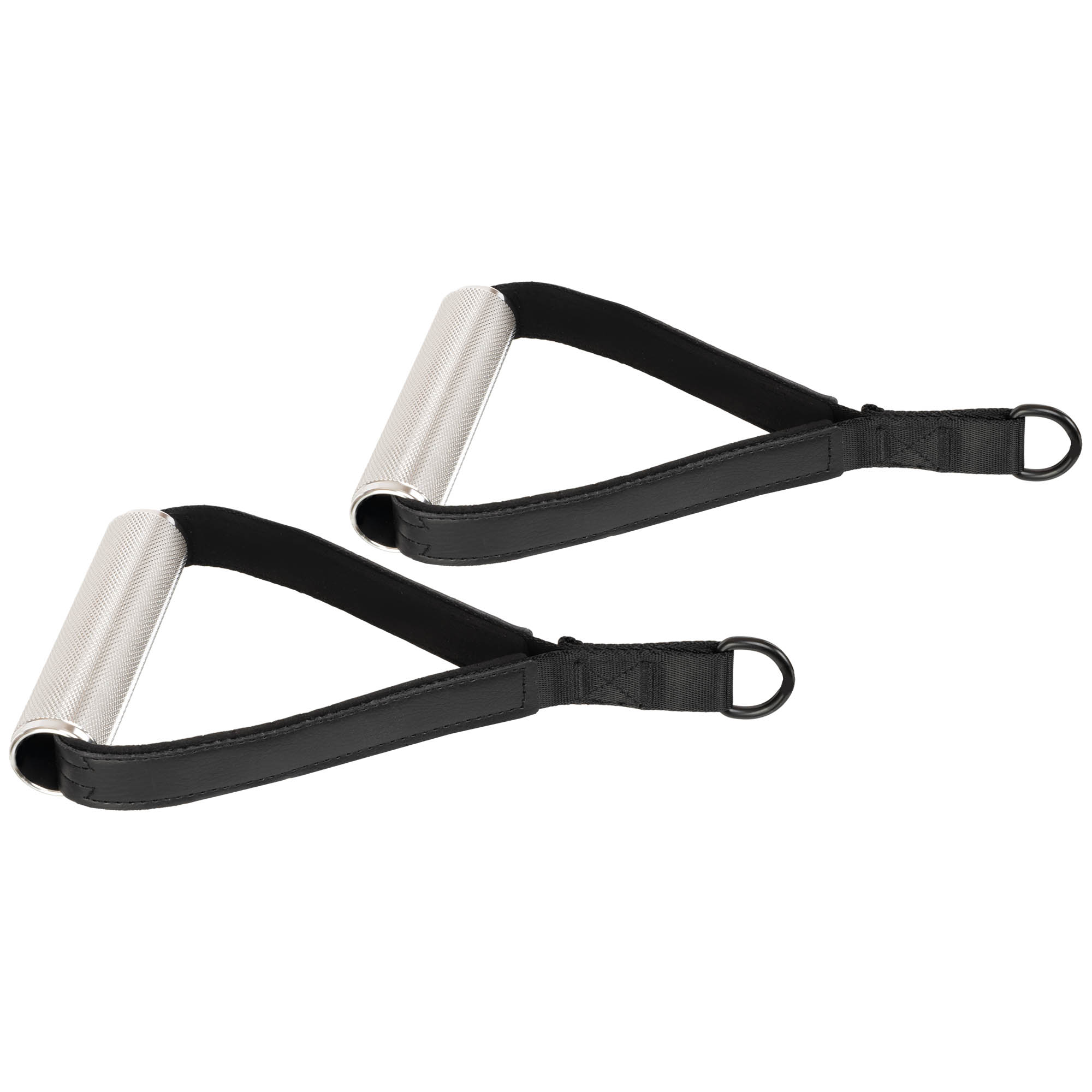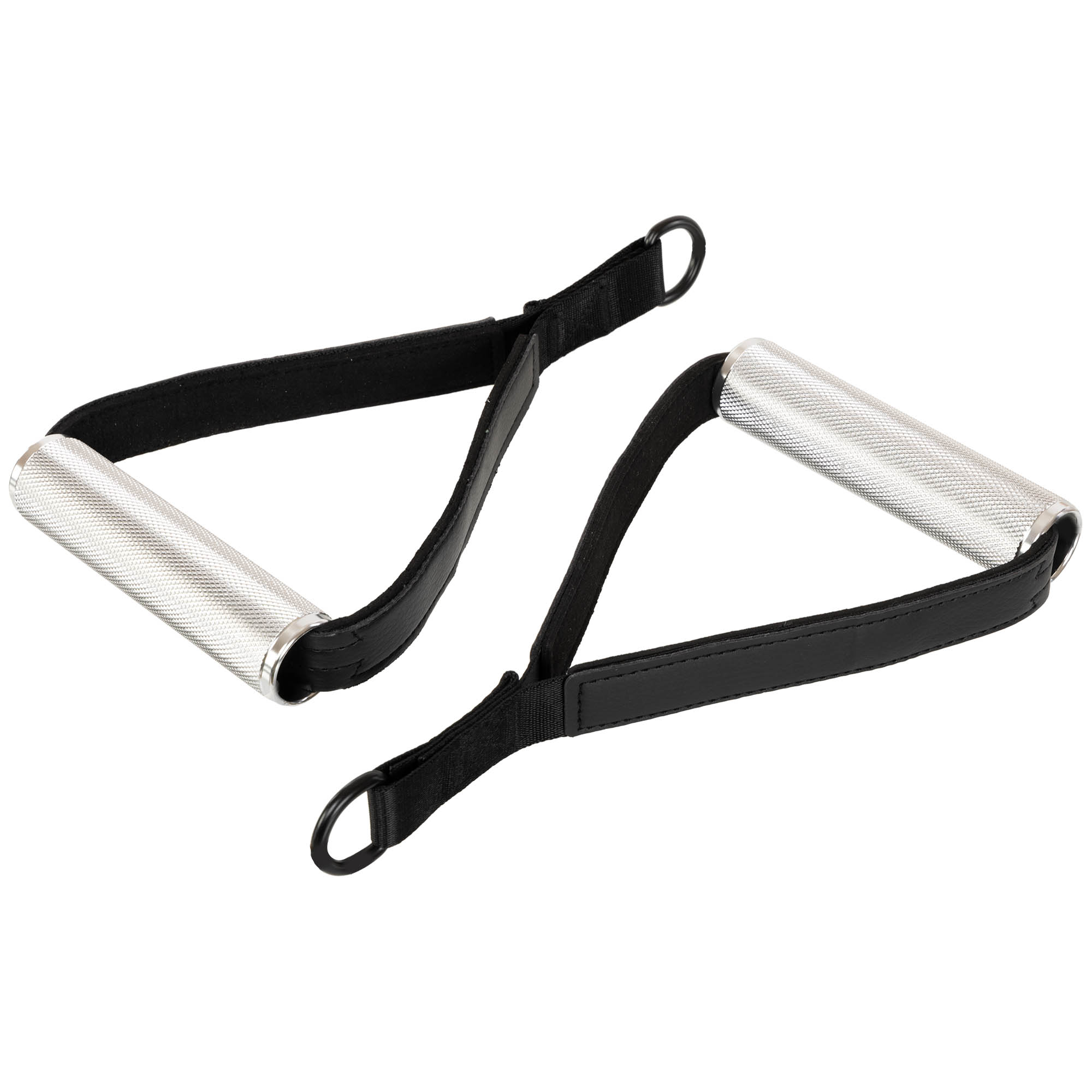 Во время работы с блочным тренажёром необходимо использовать специальные рукоятки. Также подобные ручки можно использовать во время выполнения упражнений с эспандером. Крепление происходит через специальные полукольца, которые соединяются с карабином на тренажёре или эспандере. Полукольца изготовлены из стали и обеспечивают надёжное и прочное крепление. Стропа из полиэстера обладает большим запасом прочности, она соединяет между собой полукольцо и ручку. Длина стропы составляет 24 см. Ручка изготовлена из алюминия и имеет насечки на своей поверхности для более надёжного хвата и хорошего сцепления.