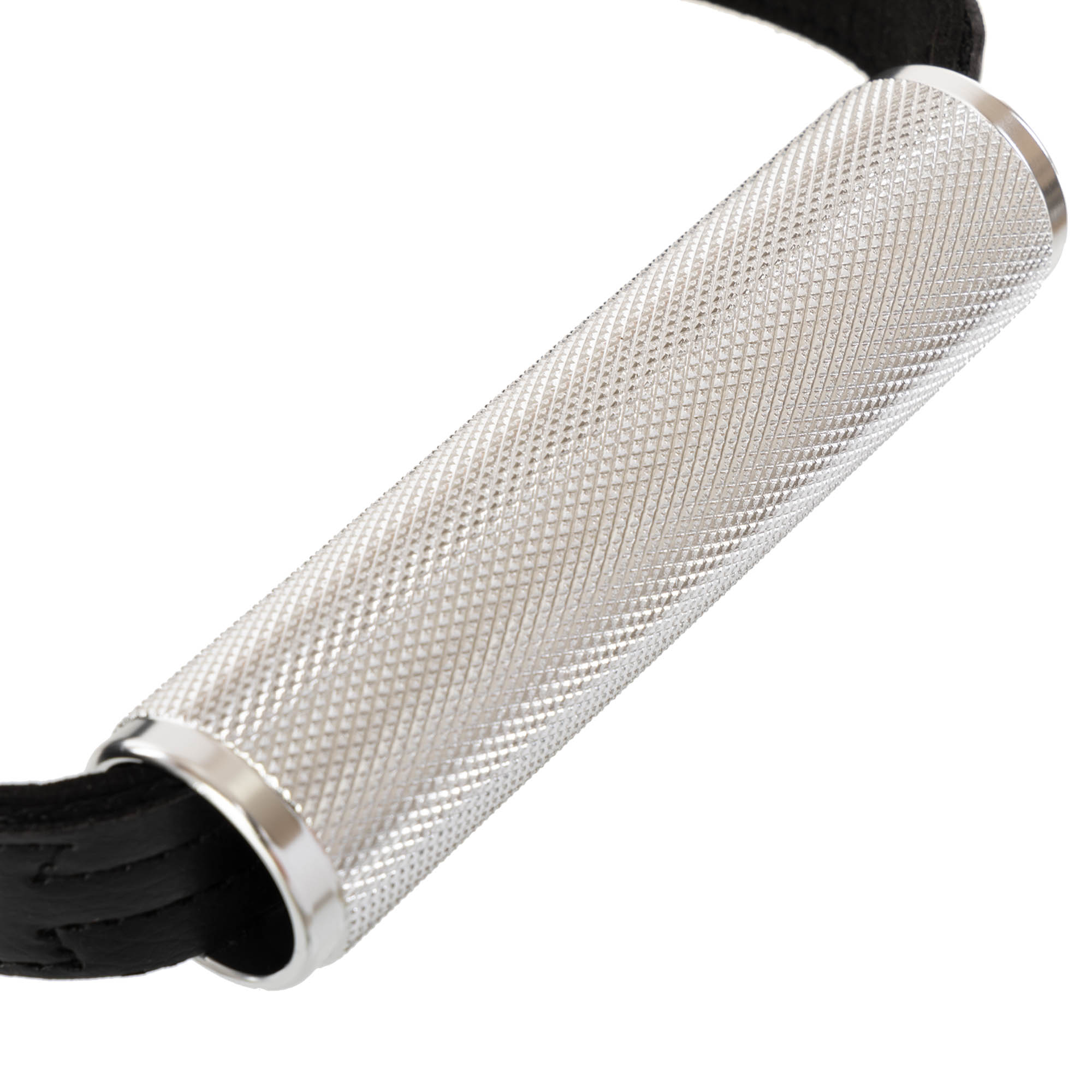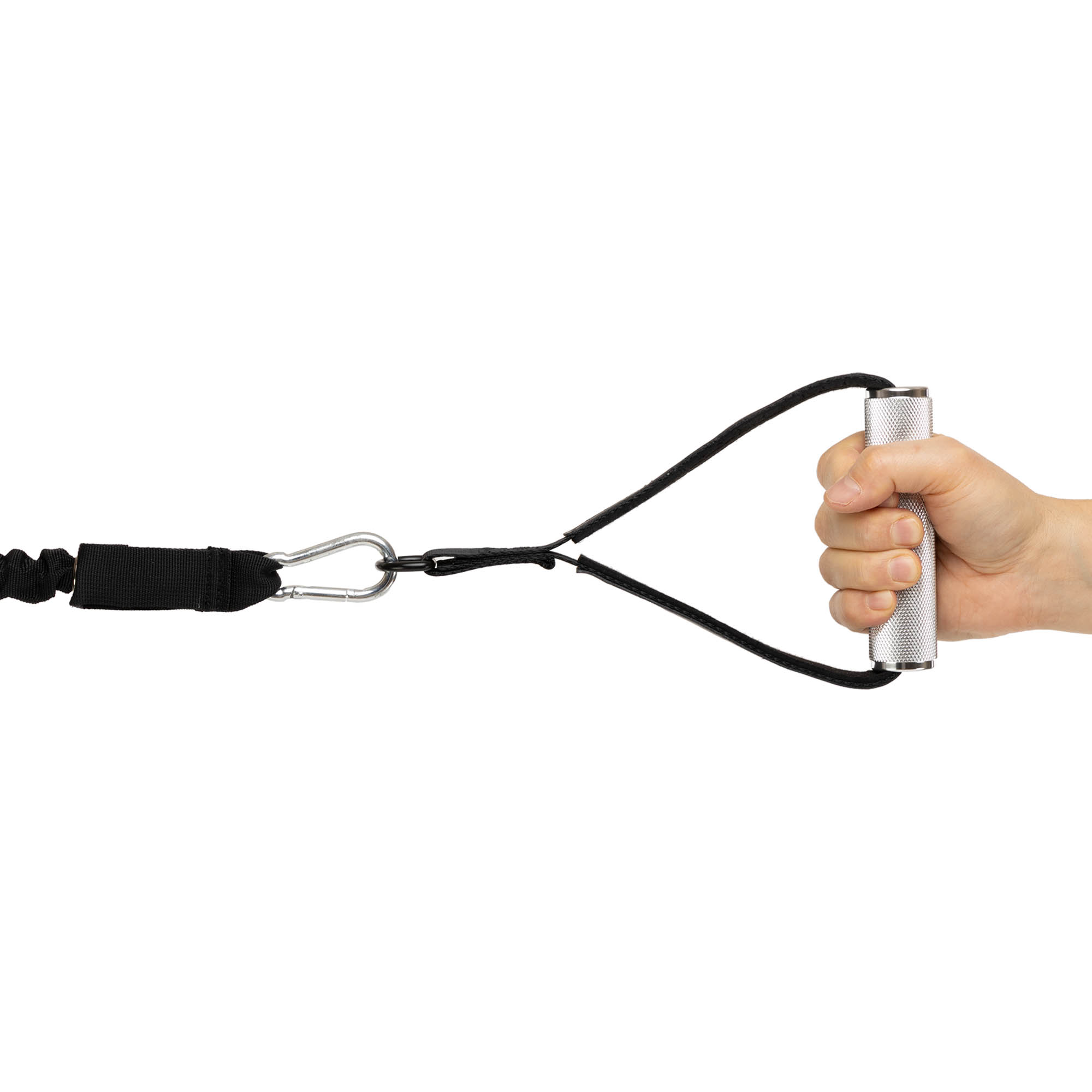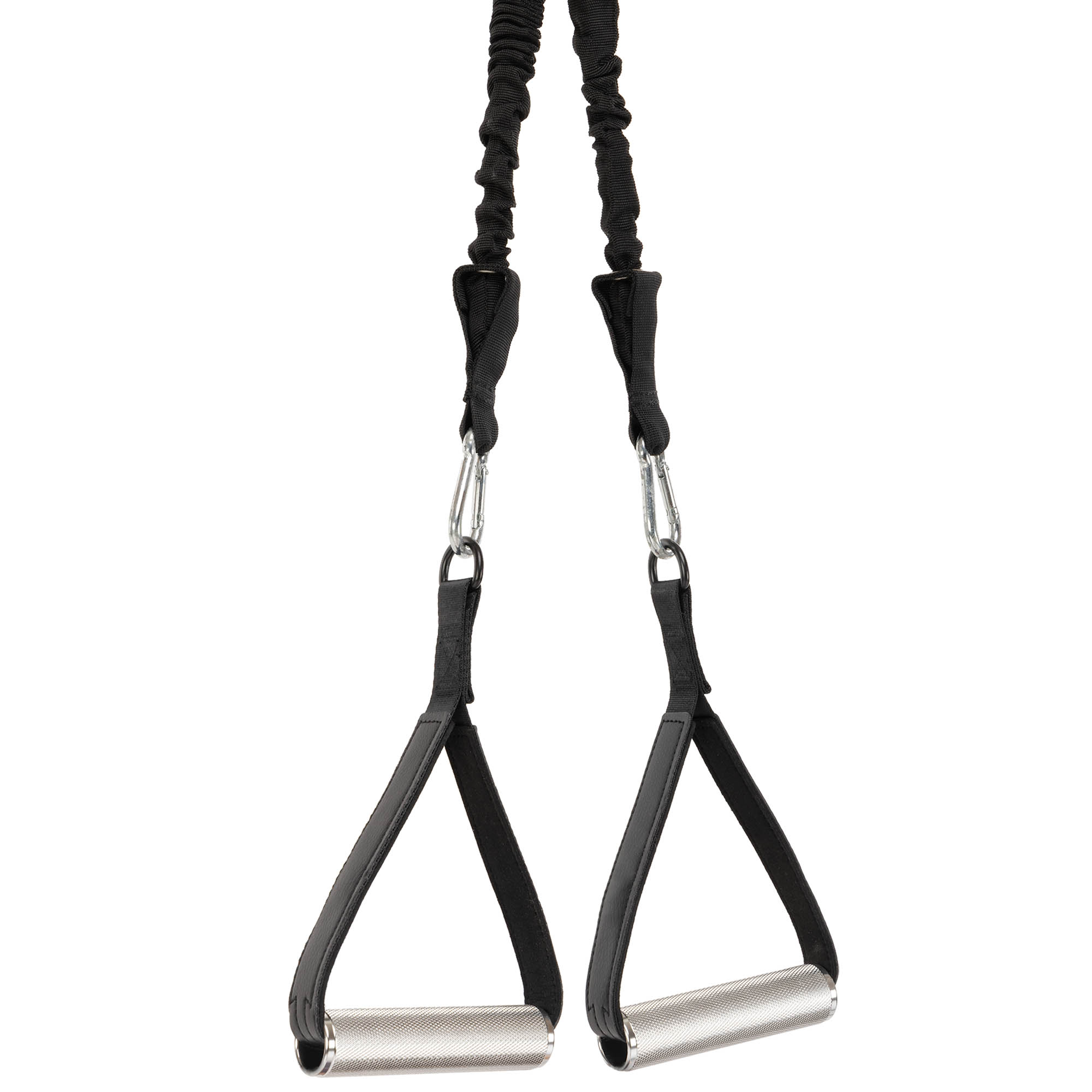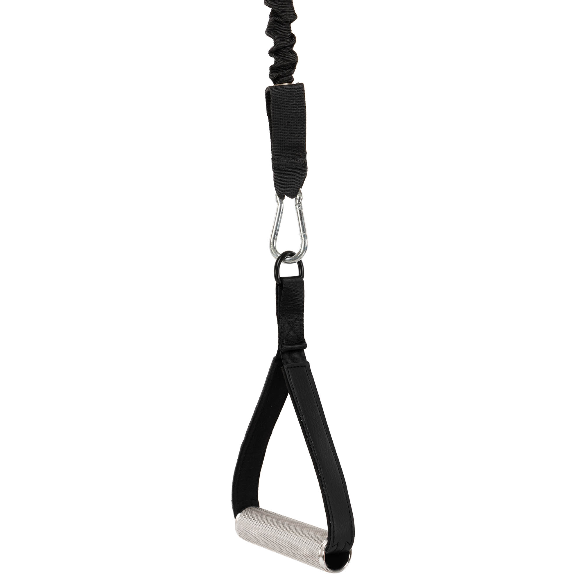 Во время работы с блочным тренажёром необходимо использовать специальные рукоятки. Также подобные ручки можно использовать во время выполнения упражнений с эспандером. Крепление происходит через специальные полукольца, которые соединяются с карабином на тренажёре или эспандере. Полукольца изготовлены из стали и обеспечивают надёжное и прочное крепление. Стропа из полиэстера обладает большим запасом прочности, она соединяет между собой полукольцо и ручку. Длина стропы составляет 24 см. Ручка изготовлена из алюминия и имеет насечки на своей поверхности для более надёжного хвата и хорошего сцепления.