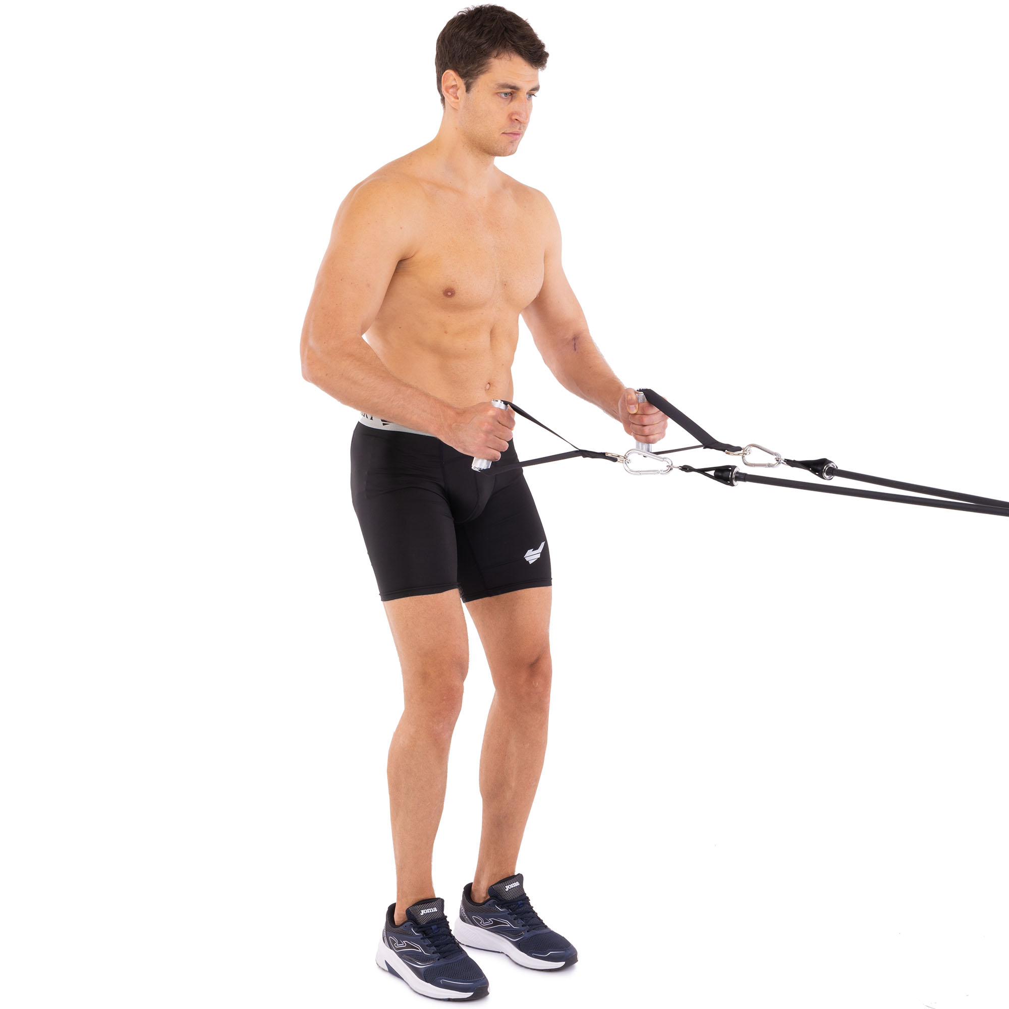 - Можно использовать с блочным тренажёром, эспандерами и резинками.