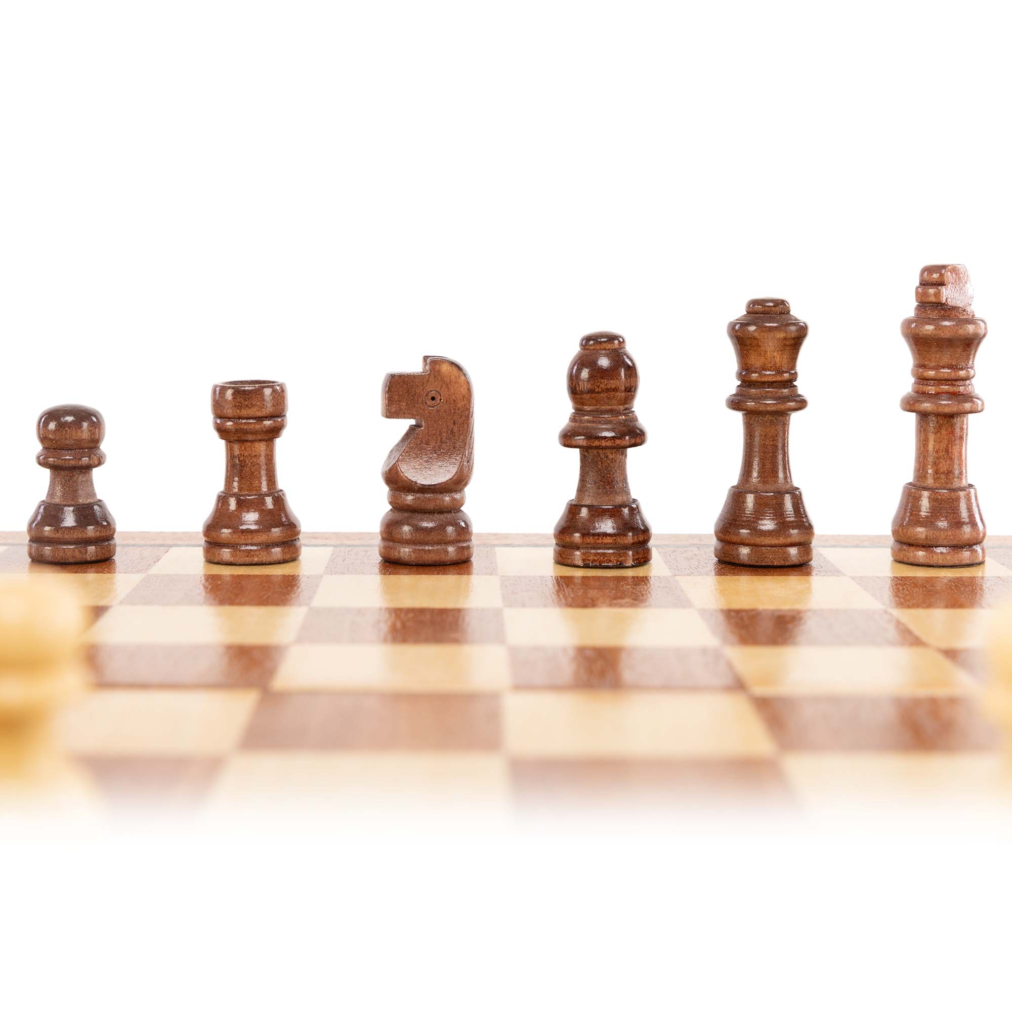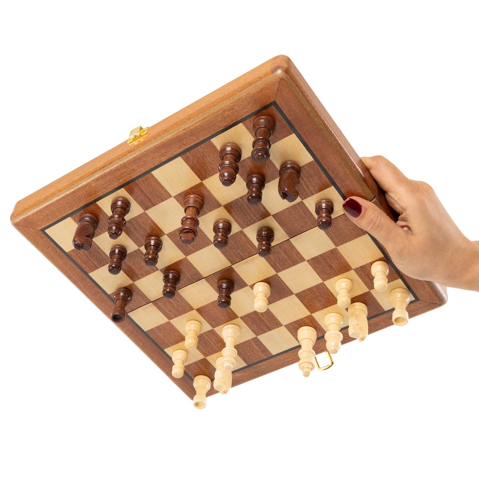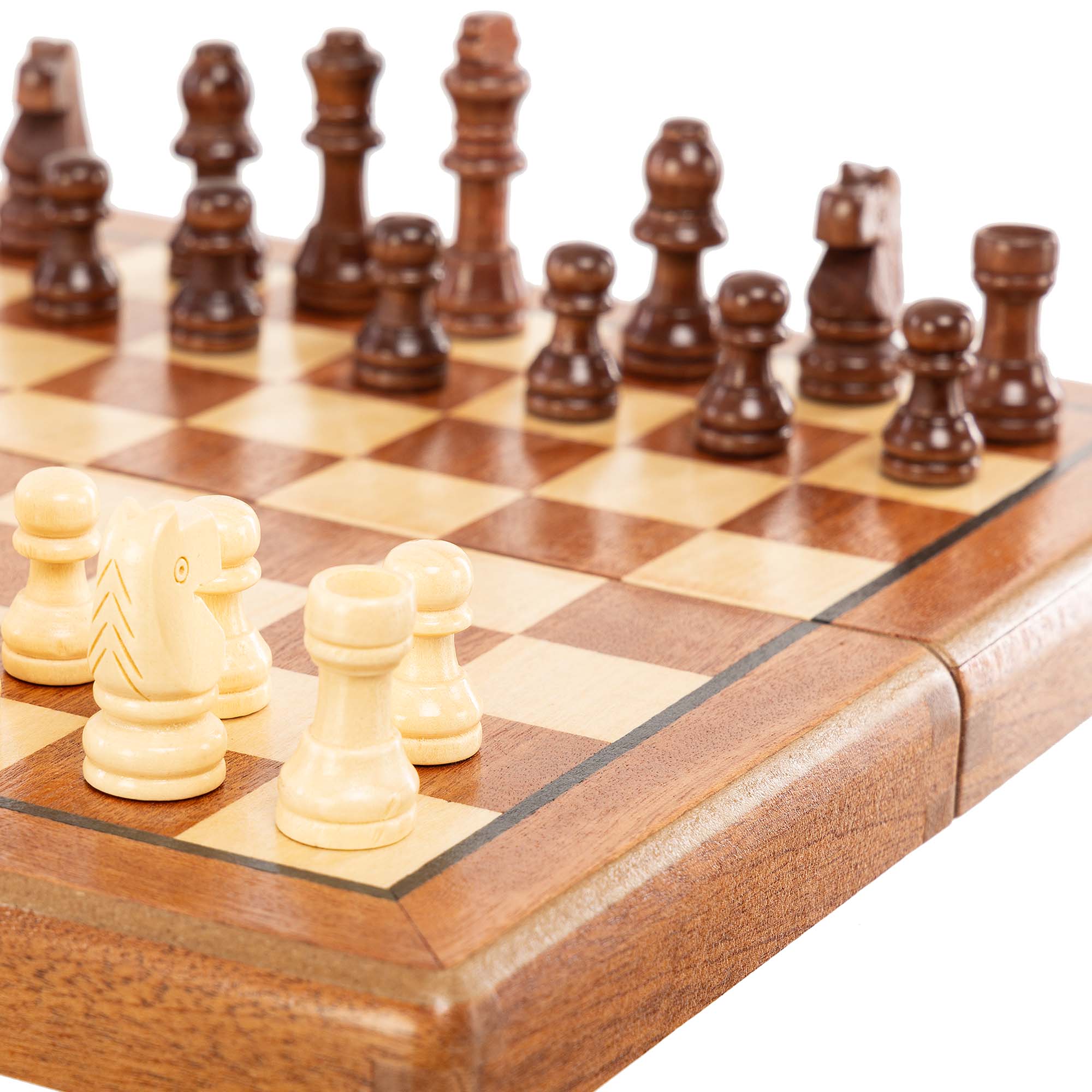 Классический шахматный набор изготовлен из натурального дерева. Доска имеет размер в разложенном виде 29 х 29 х 2.5 см. Также из натурального дерева выполнены фигуры и фишки. Петли и замки изготовлены из прочного металла, что гарантирует долговечность набора. Доска одновременно является футляром для удобного хранения всех фигур. Там они аккуратно раскладываются каждая на свое место. В сложенном виде доска имеет компактные размеры, всего 29 x 14.5 x 5 см, что позволяет удобно брать ее с собой для игры вне дома. Набор упакован в яркую картонную коробку.
