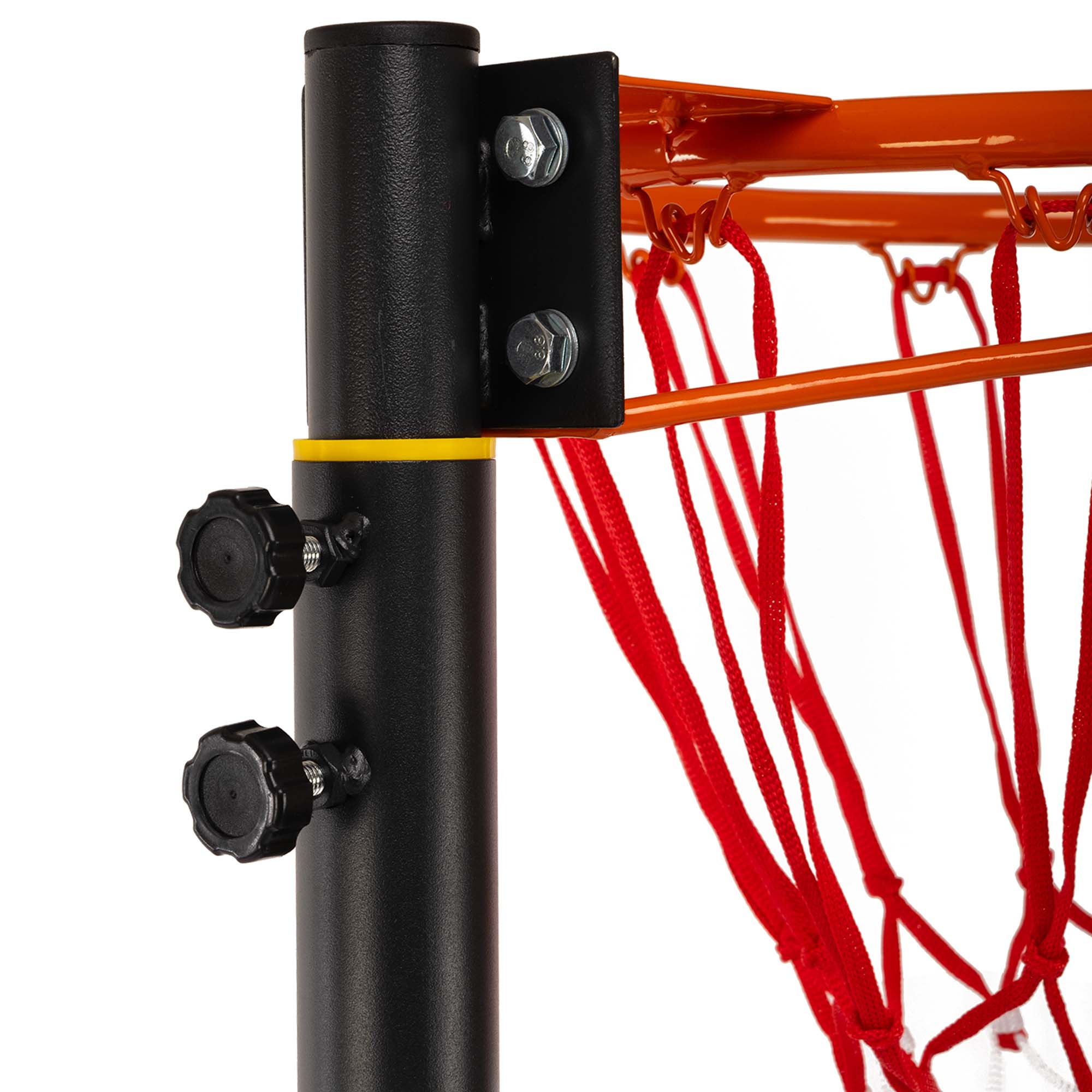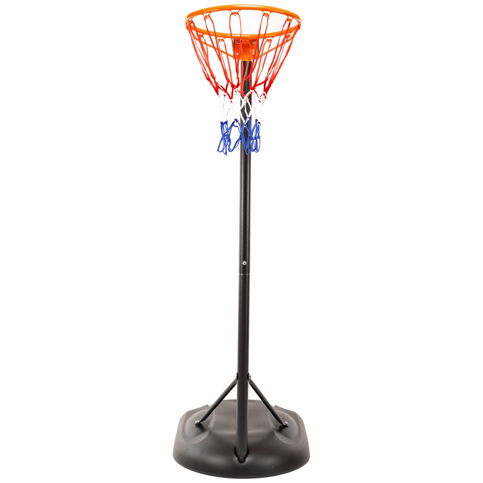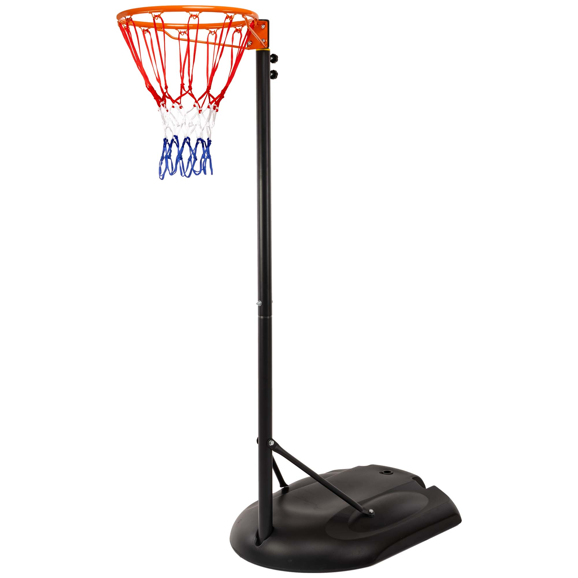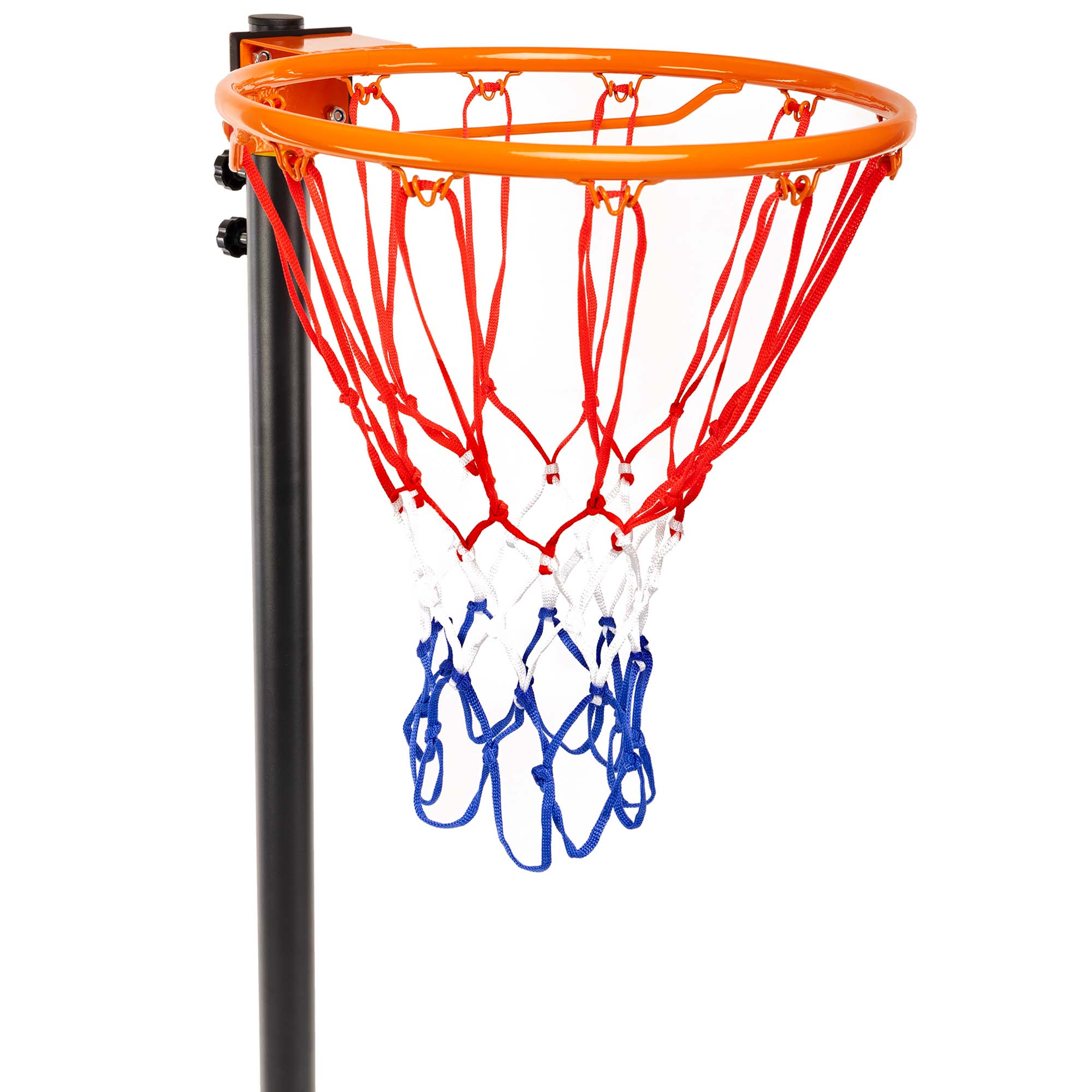 Мобильная стойка для нетбола подойдет для игр и тренировок, может использоваться как взрослыми, так и детьми. Стойка имеет возможность регулировки по высоте в диапазоне от 240 до 305 см. В конструкции предусмотрен винтовой механизм регулировки, который позволяет с небольшим шагом регулировать высоту. Основание изготовлено из формованного полиэтилена и имеет размер 80 см на 56 см. Чтобы конструкция была максимально устойчивой, ее основание можно наполнить песком или водой. Не утяжеленная конструкция имеет вес 9 кг. Стойку можно легко перемещать по площадке благодаря установленным на ее основании колесам. Кольцо изготовлено из металла, как и сама стойка, и имеет диаметр 38 см. Такой диаметр кольца полностью соответствует требованиям правил игры. Кольцо комплектуется сеткой.