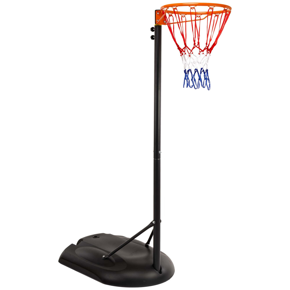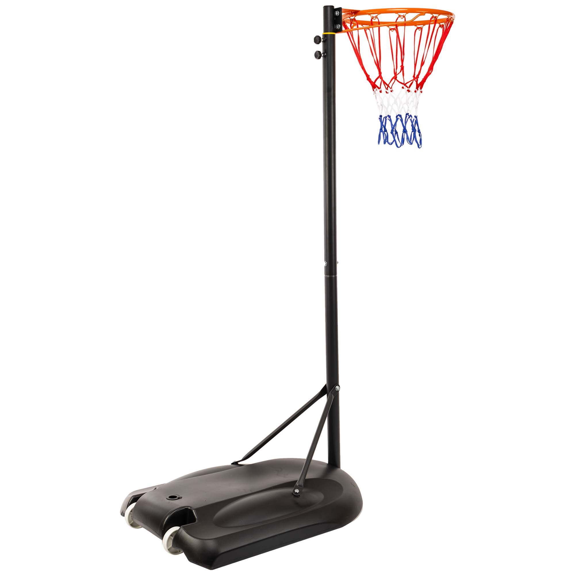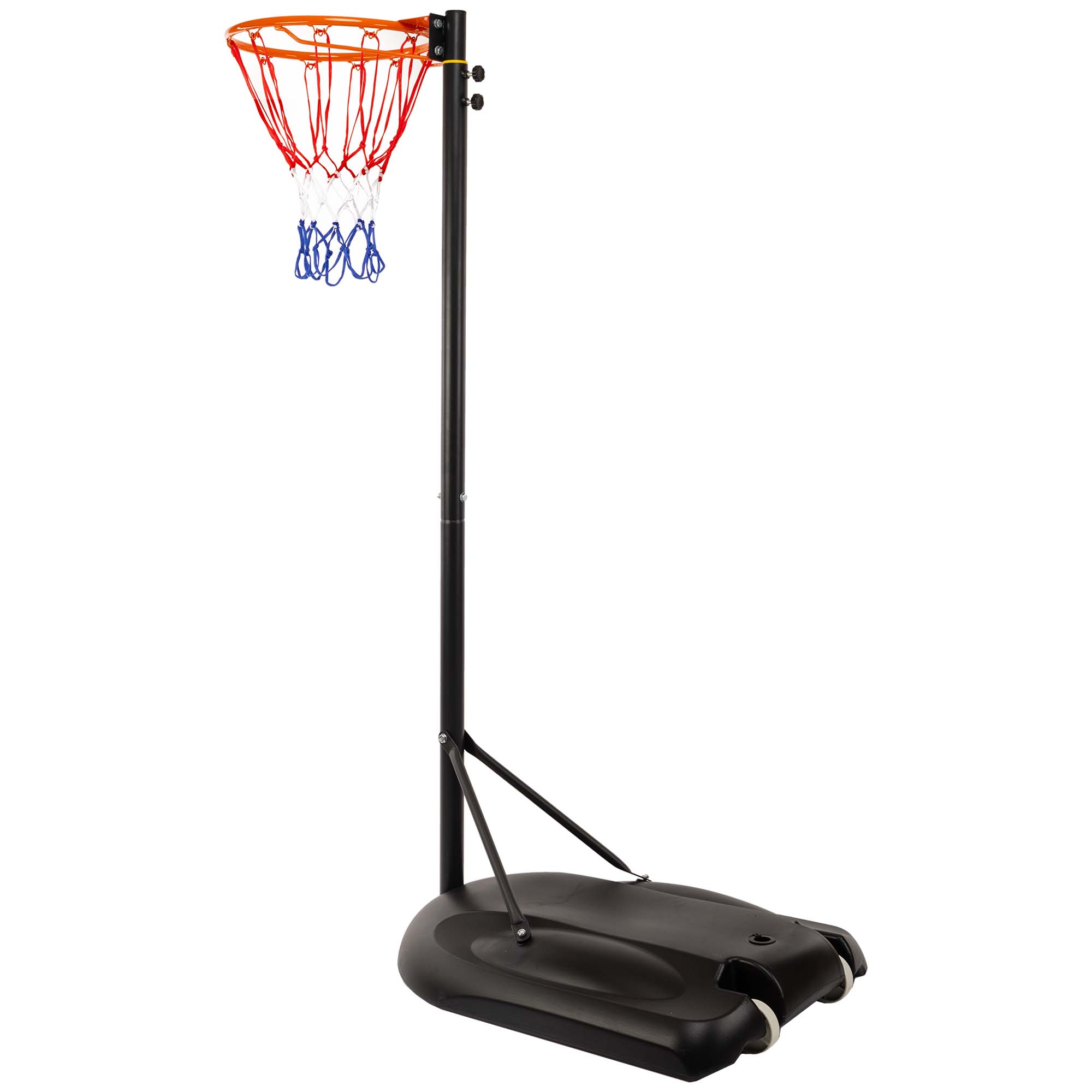 Мобильная стойка для нетбола подойдет для игр и тренировок, может использоваться как взрослыми, так и детьми. Стойка имеет возможность регулировки по высоте в диапазоне от 240 до 305 см. В конструкции предусмотрен винтовой механизм регулировки, который позволяет с небольшим шагом регулировать высоту. Основание изготовлено из формованного полиэтилена и имеет размер 80 см на 56 см. Чтобы конструкция была максимально устойчивой, ее основание можно наполнить песком или водой. Не утяжеленная конструкция имеет вес 9 кг. Стойку можно легко перемещать по площадке благодаря установленным на ее основании колесам. Кольцо изготовлено из металла, как и сама стойка, и имеет диаметр 38 см. Такой диаметр кольца полностью соответствует требованиям правил игры. Кольцо комплектуется сеткой.