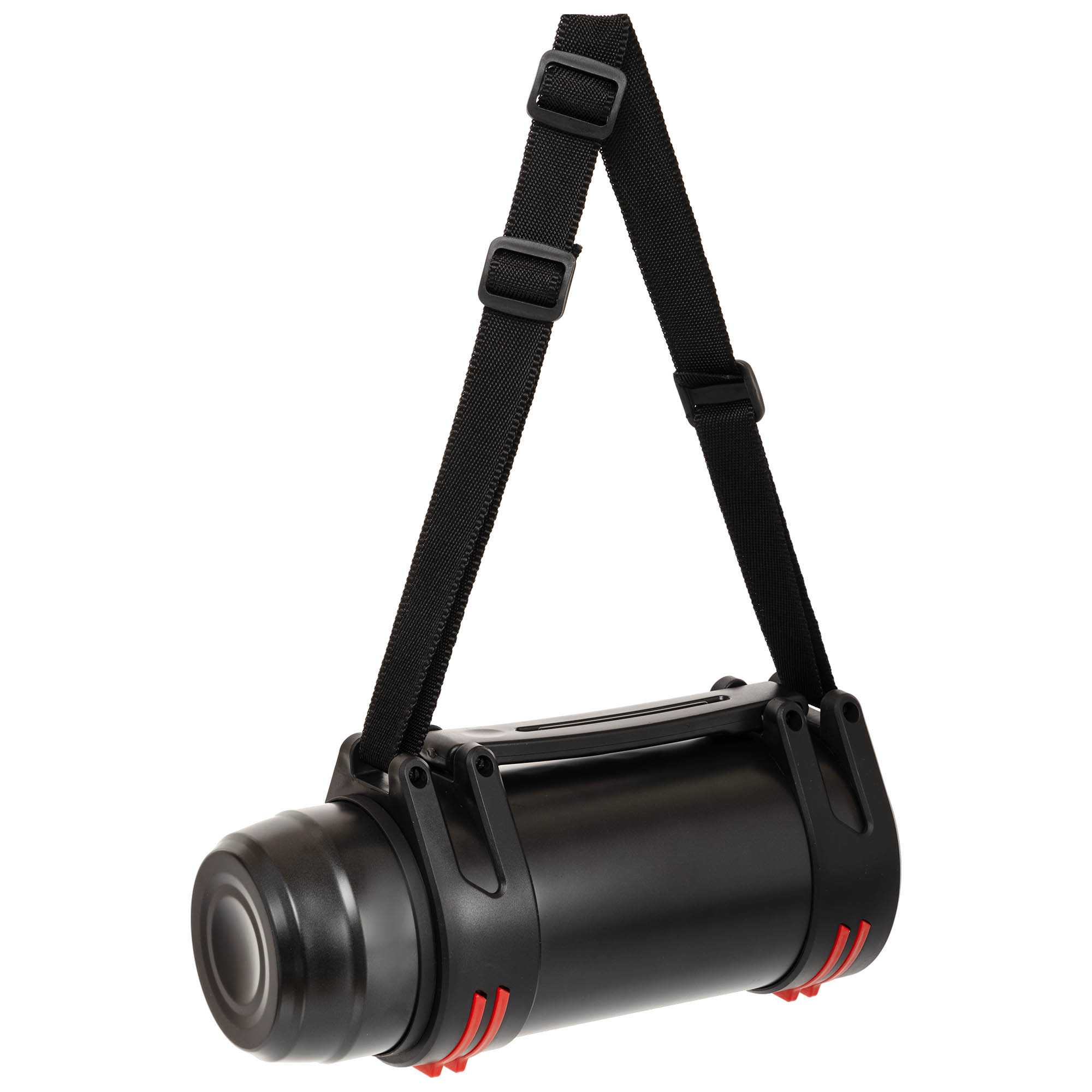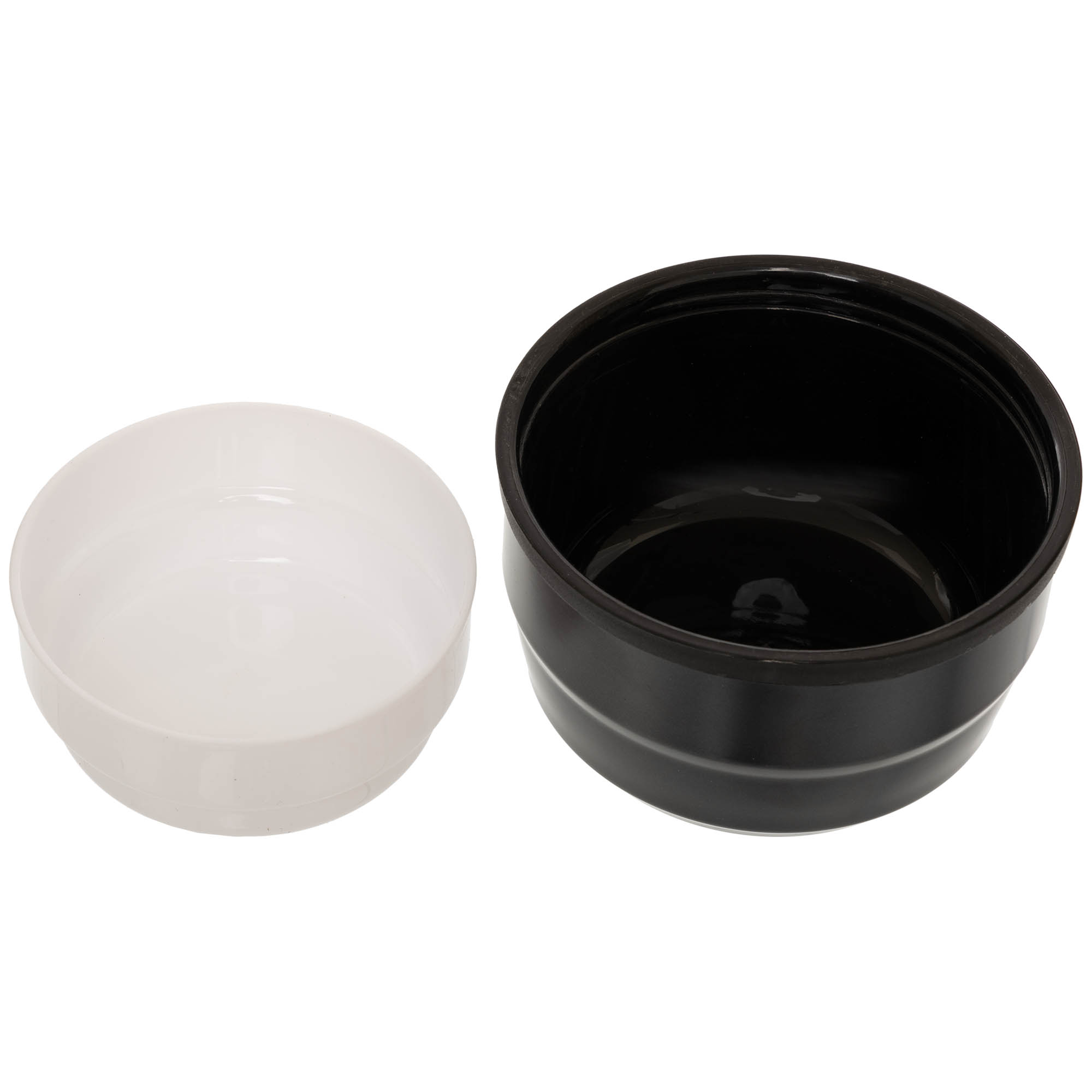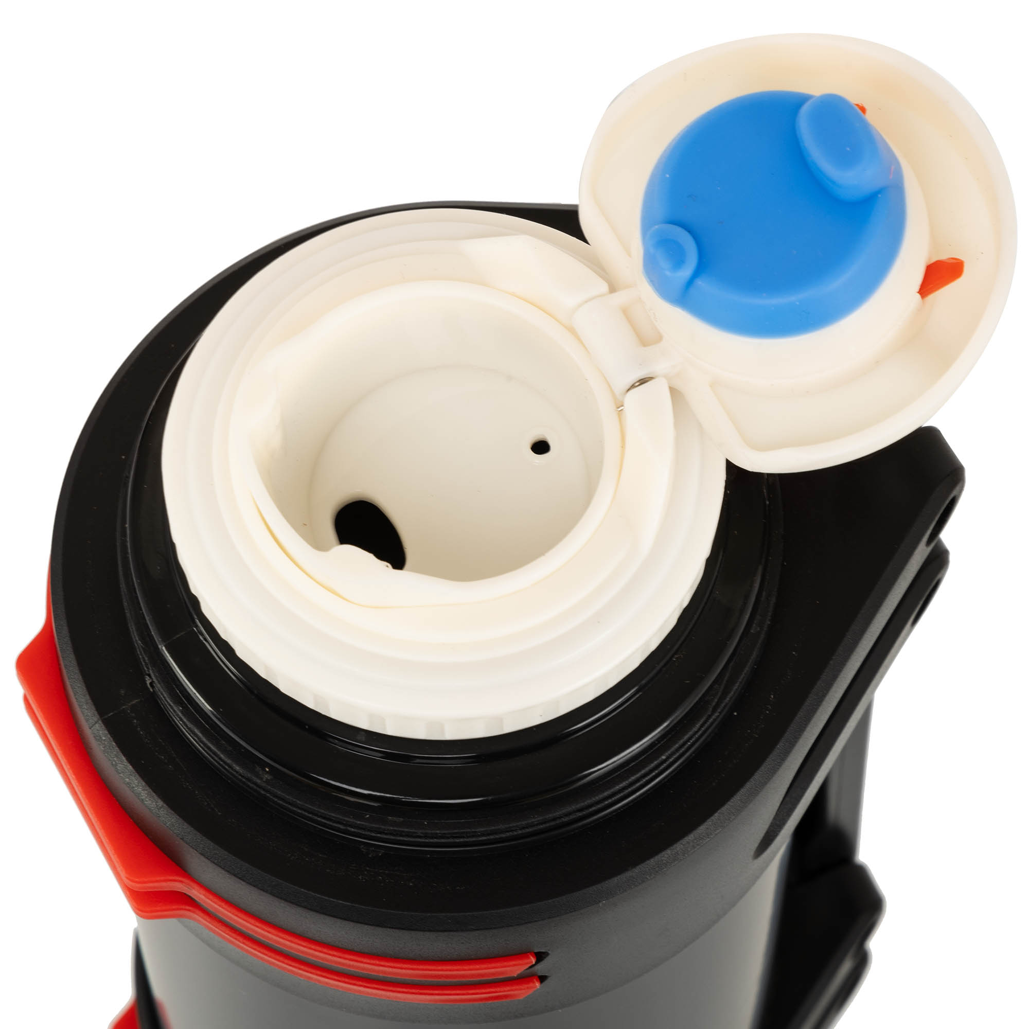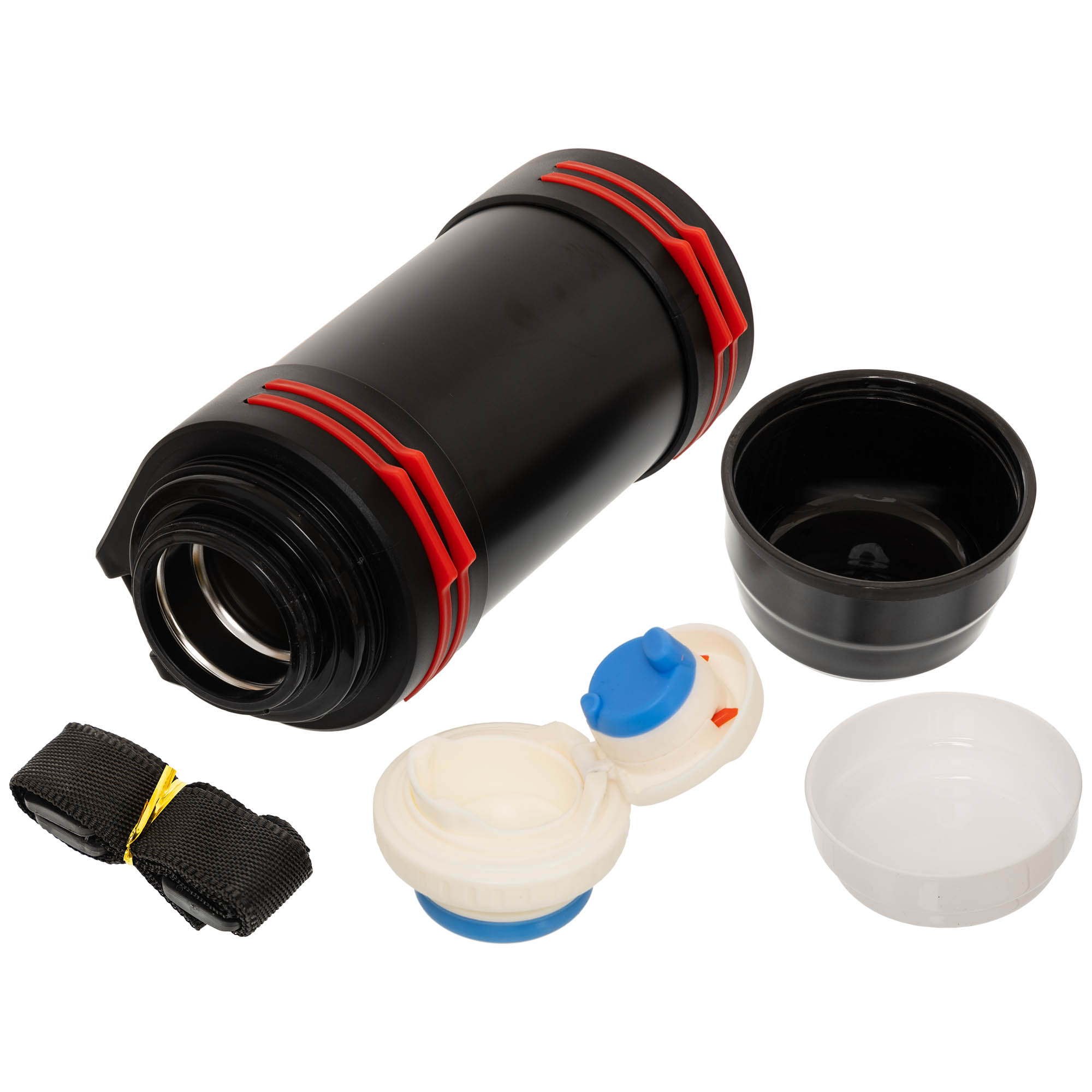 Аксессуар имеет классическую конструкцию, гарантирующую надежность и долговечность. Двойная колба и герметично закрывающаяся крышка создают эффект теплоизоляции. Крышка оборудована специальным клапаном, с помощью которого удобно наливать напиток даже на ходу. Под верхней крышкой, которую можно использовать в качестве чаши для питья, есть еще одна пластиковая чаша. Для удобной транспортировки на корпусе расположена гибкая ручка, в комплекте также поставляется ремешок регулируемой длины, для переноски на плече.
