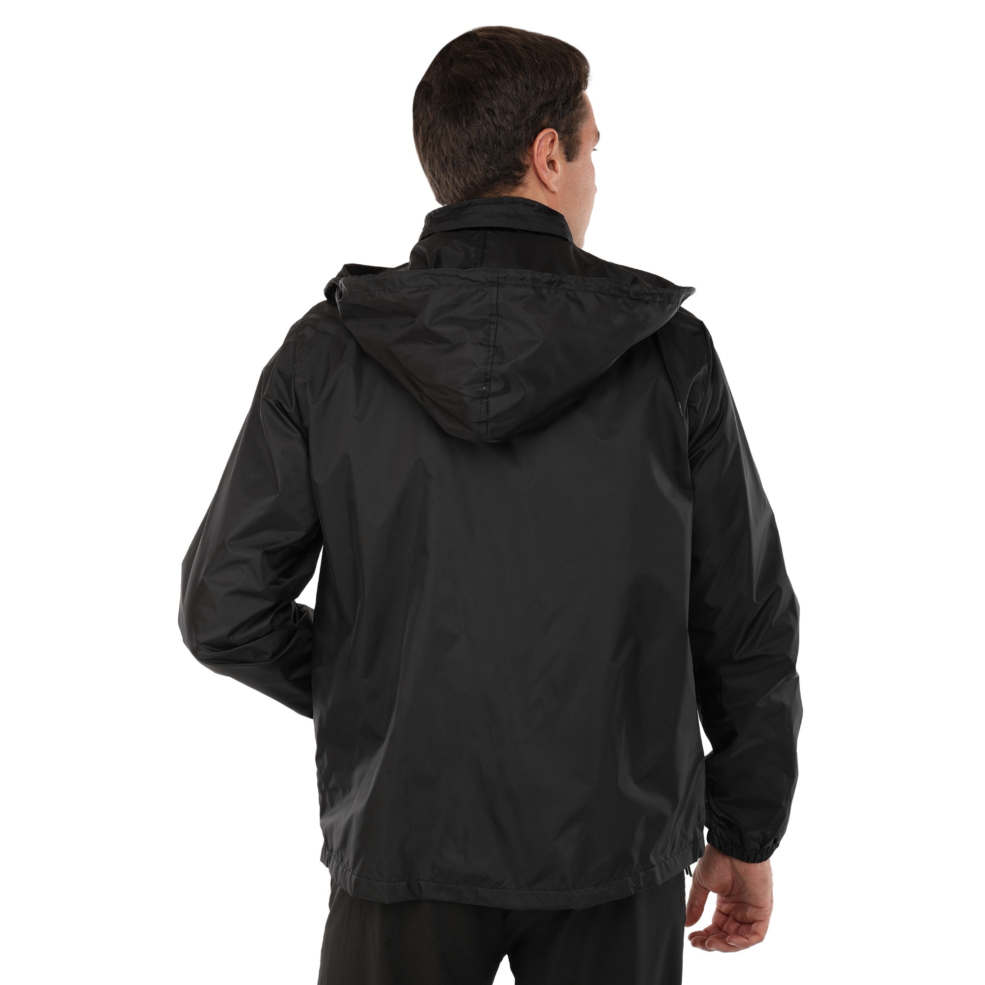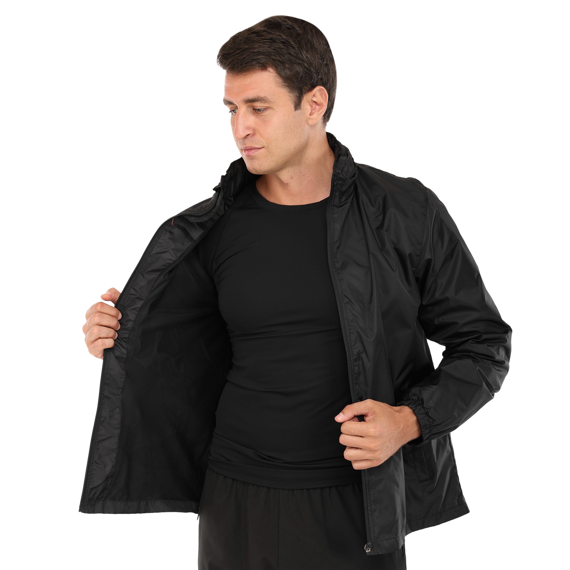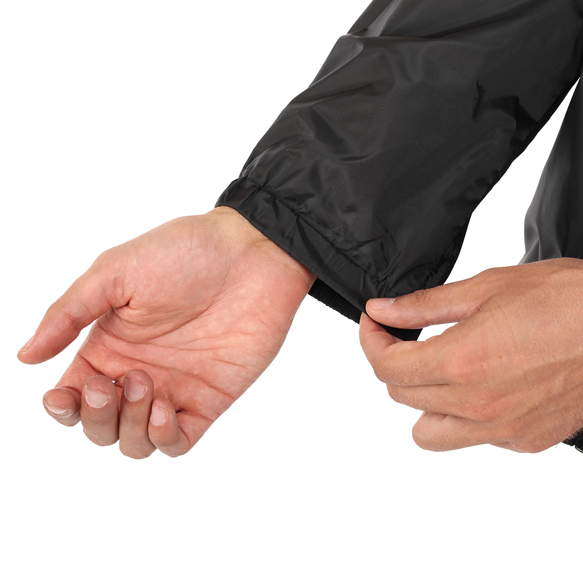 Куртка застегивается на молнию с запирающим язычком, который предотвращает расстегивание и попадание внутрь воды. На поясе и манжетах есть эластичные резинки для более плотного прилегания. Голову и шею защищает капюшон со шнурками. Он легко убирается в карман на молнии на шее. Куртка также оснащена удобными карманами для хранения мелких вещей.