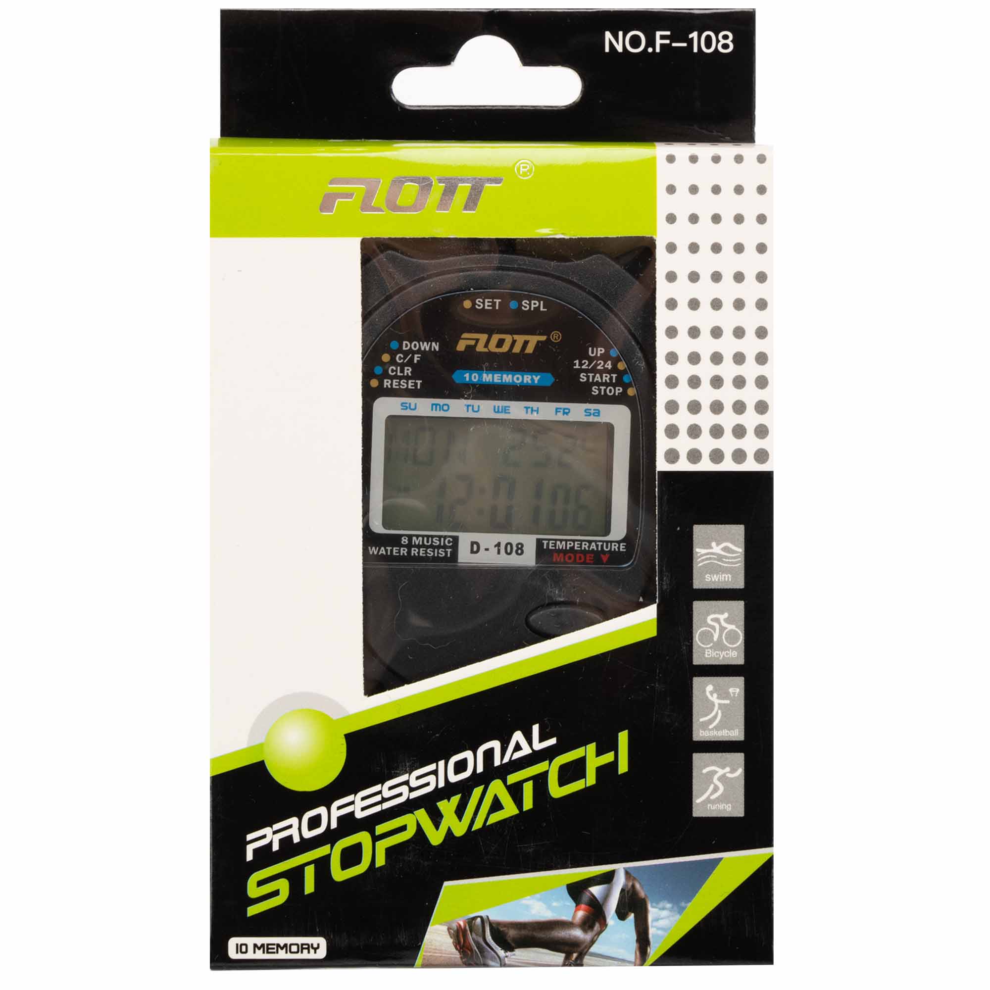 Секундомір спортивний електронний 10 результатів пам'яті дворядковий FLOTT F-108 чорний Код F-108