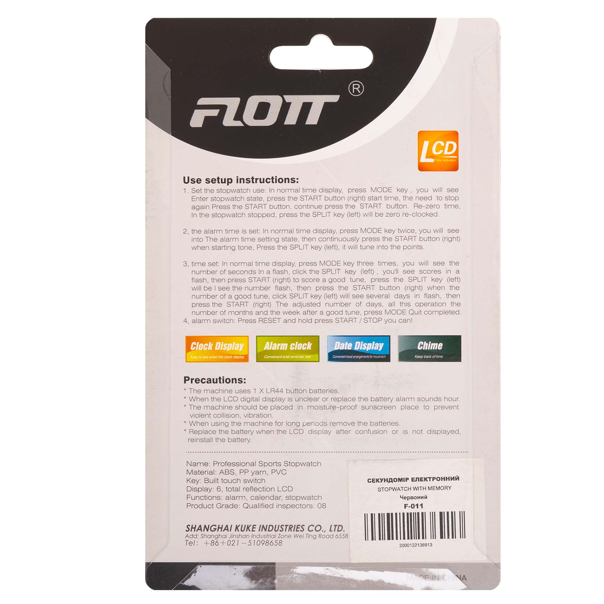 FLOTT — це ім’я, яке давно асоціюється з точністю та надійністю у світі спортивного обладнання. Продукція цієї марки відома своїм якісним виконанням і увагою до деталей, і F-011 не став винятком. Це пристрій, якому можна довірити точний відлік часу.Матеріал: пластик