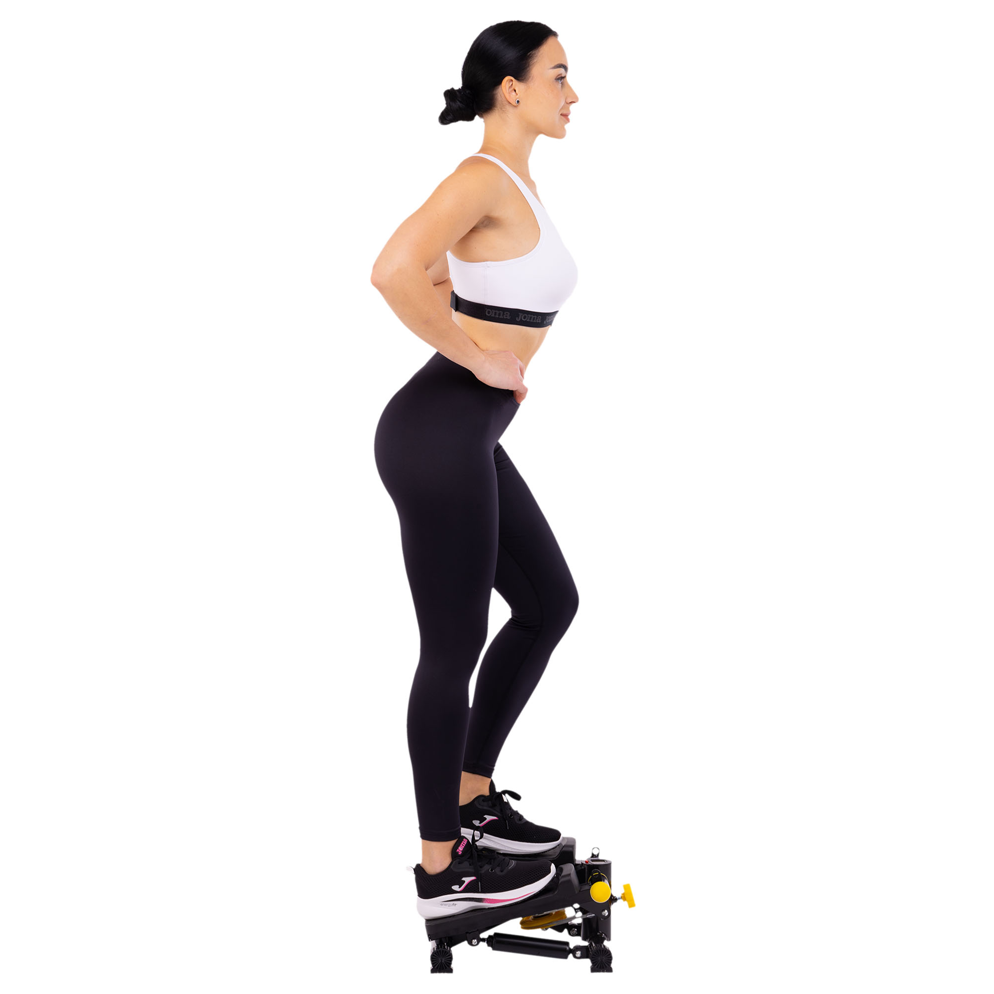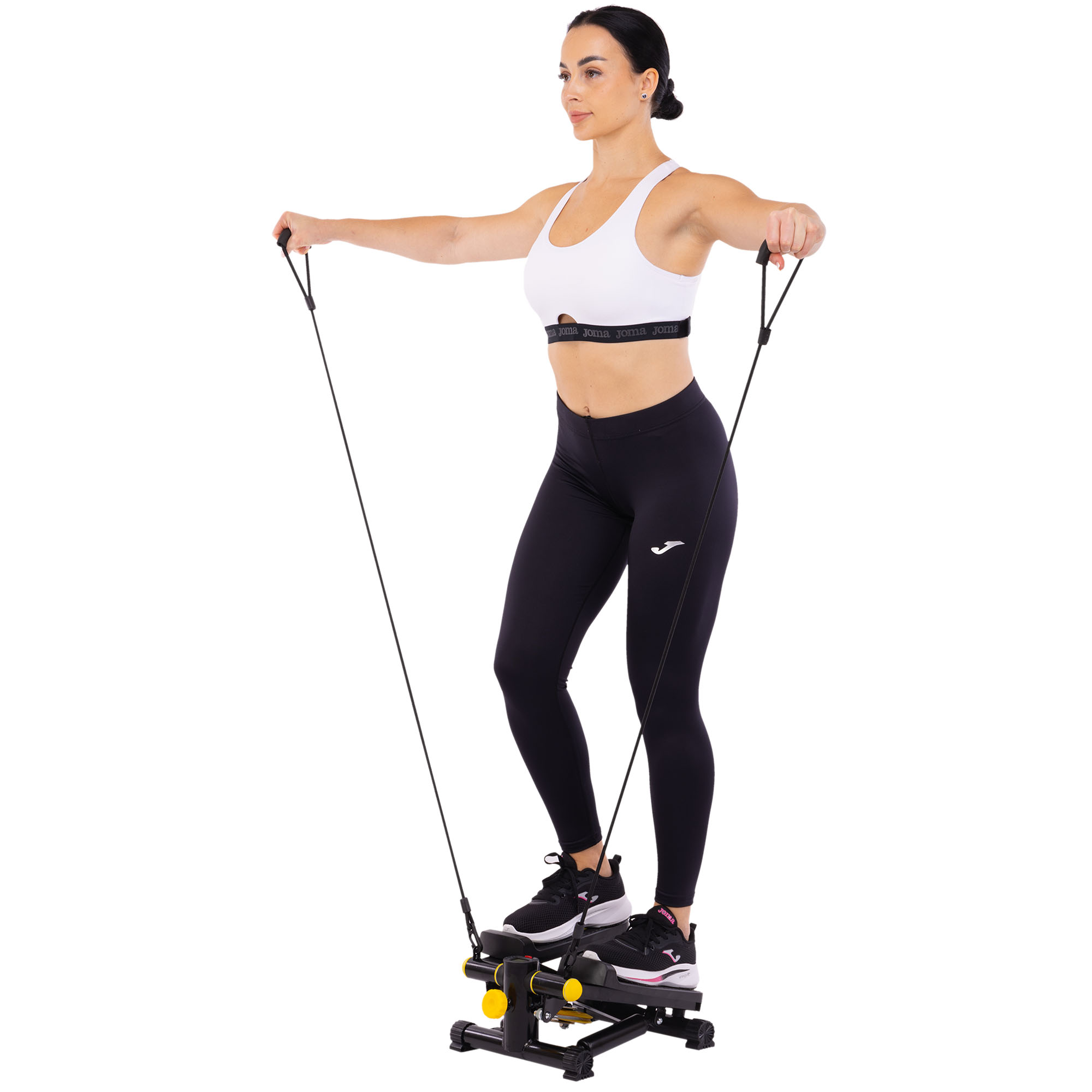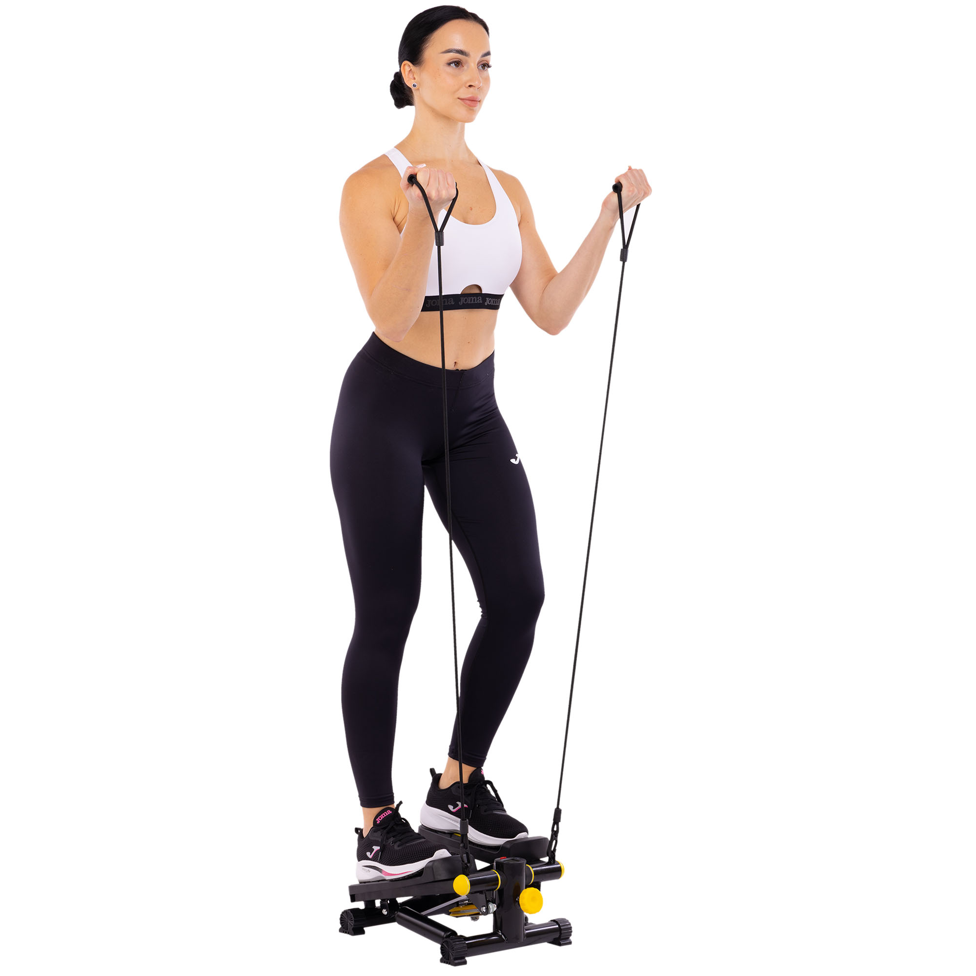 - Степпер з еспандерами дозволяє одночасно тренувати нижню і верхню частину тіла.