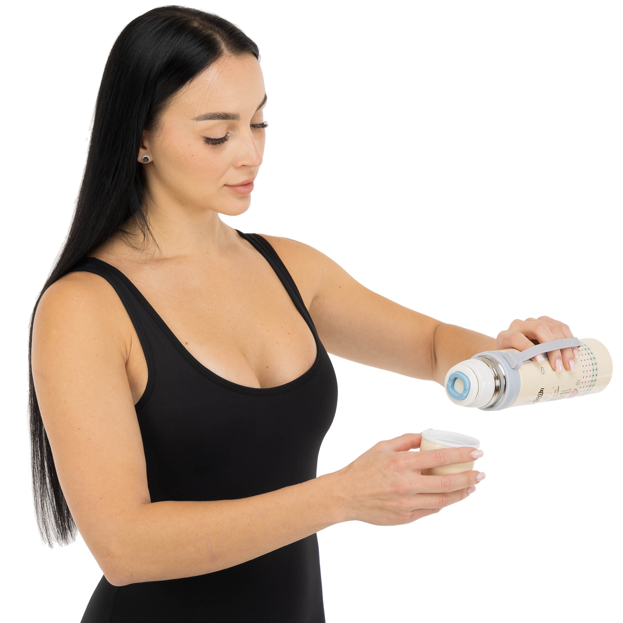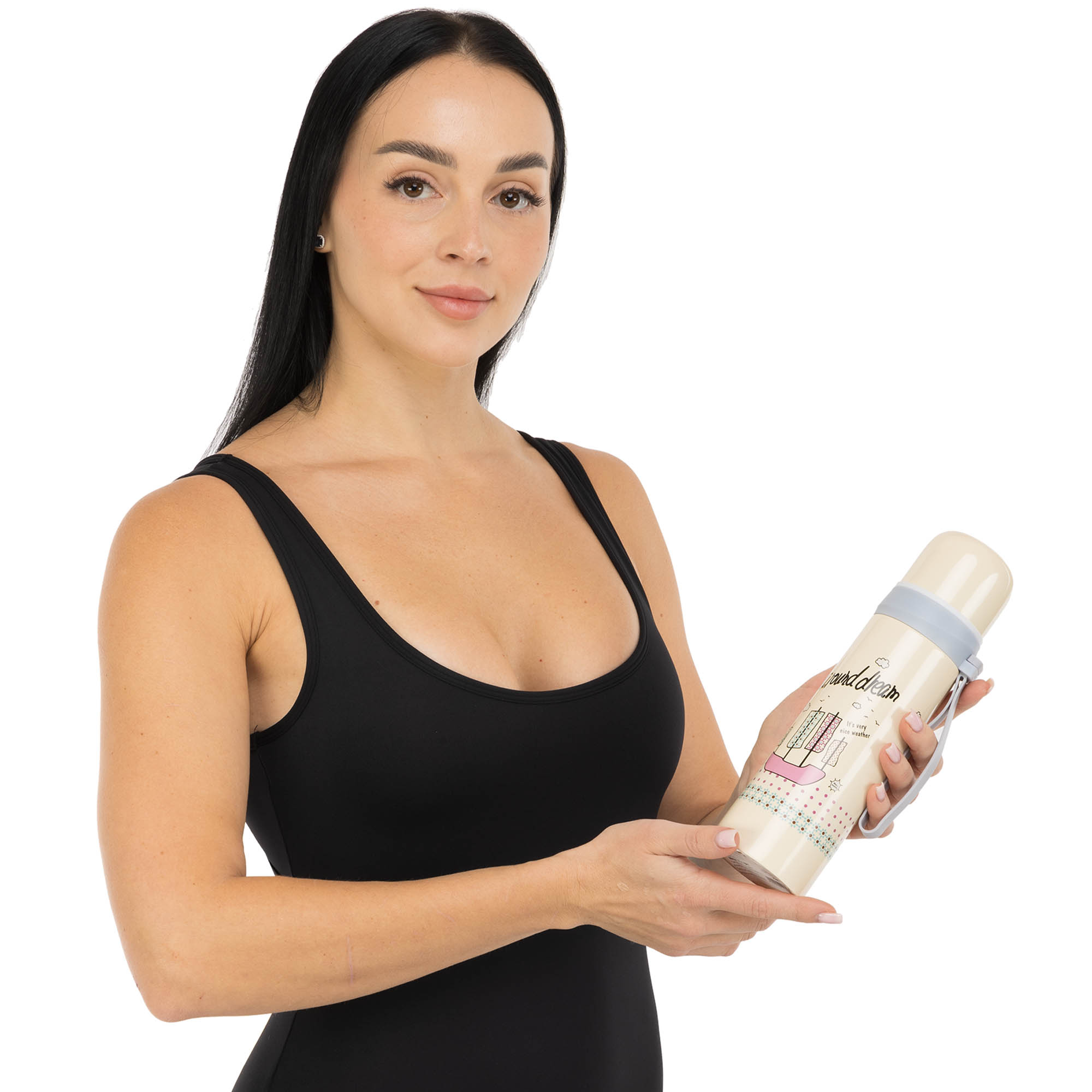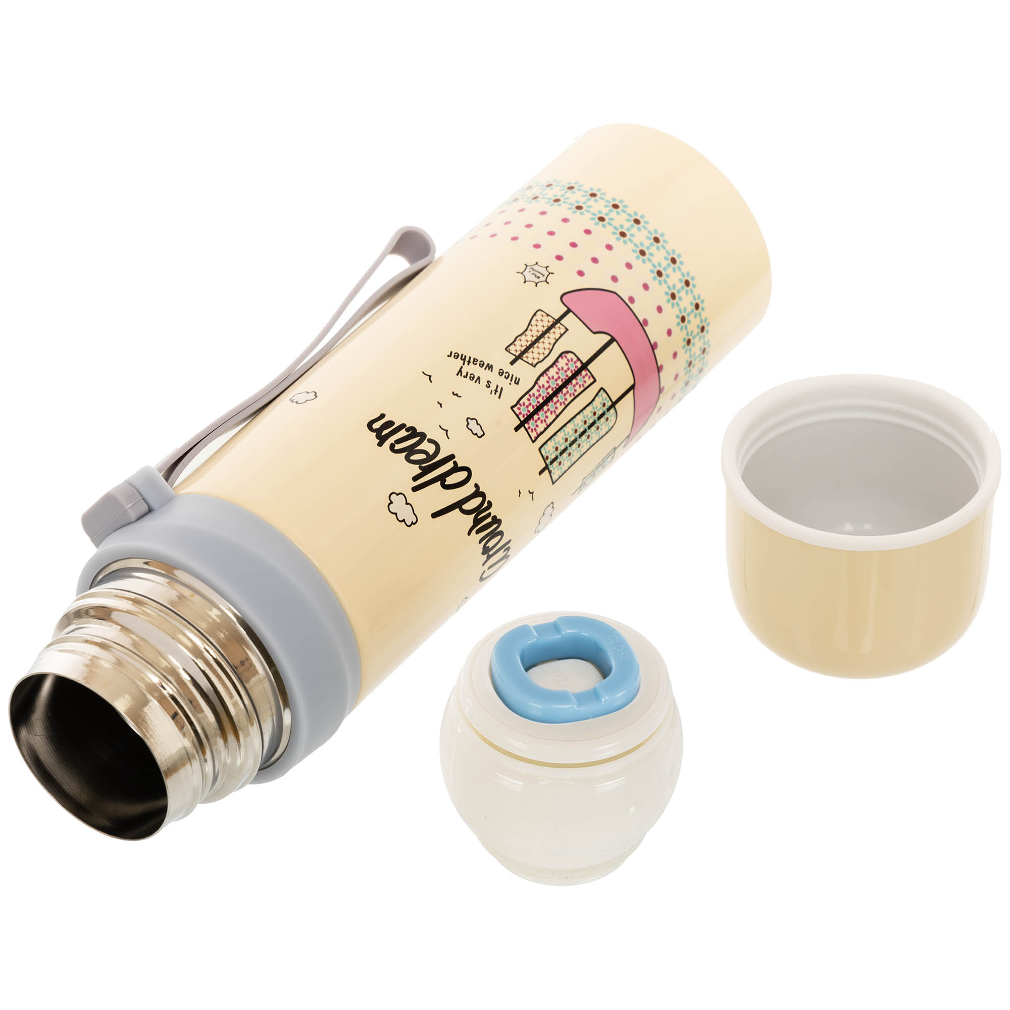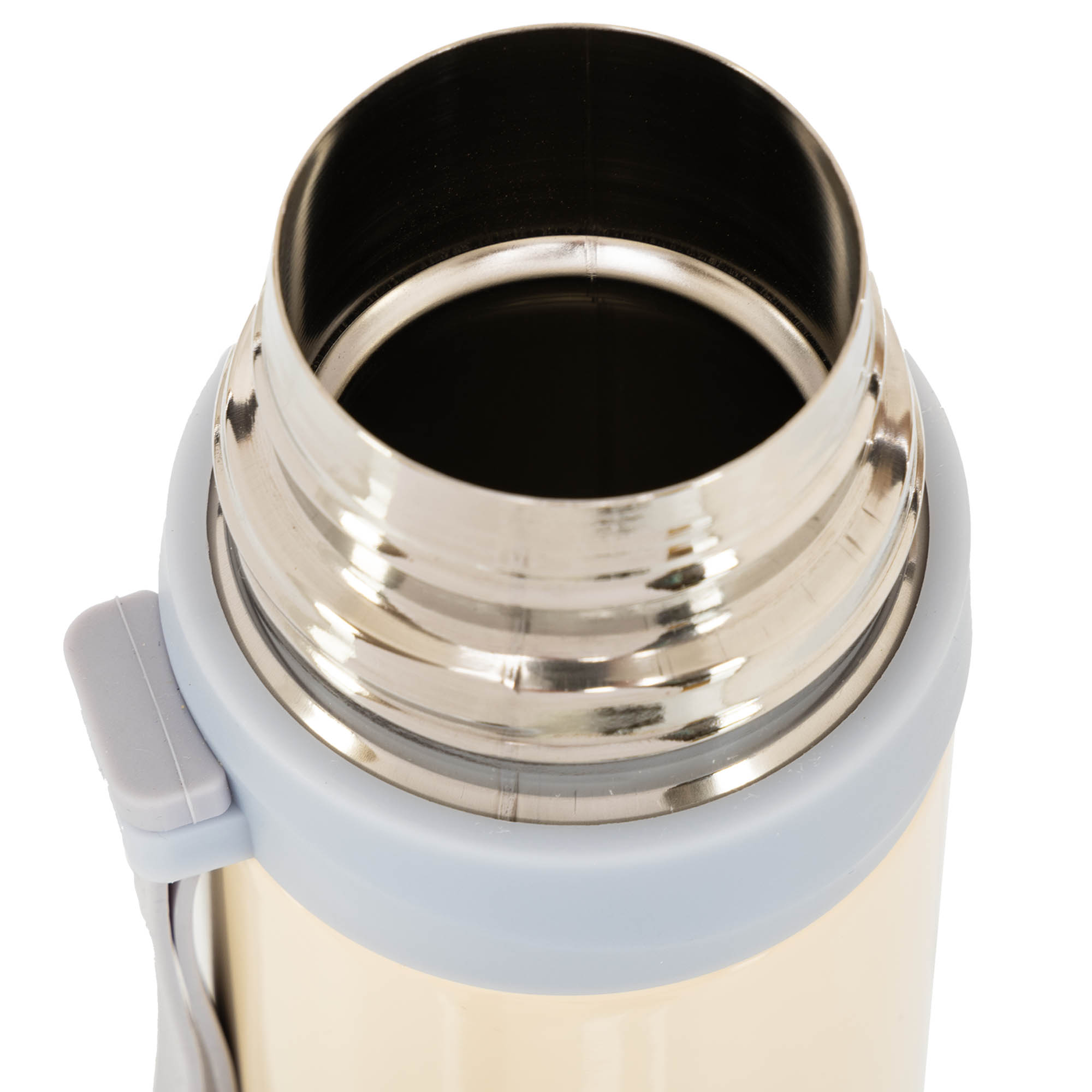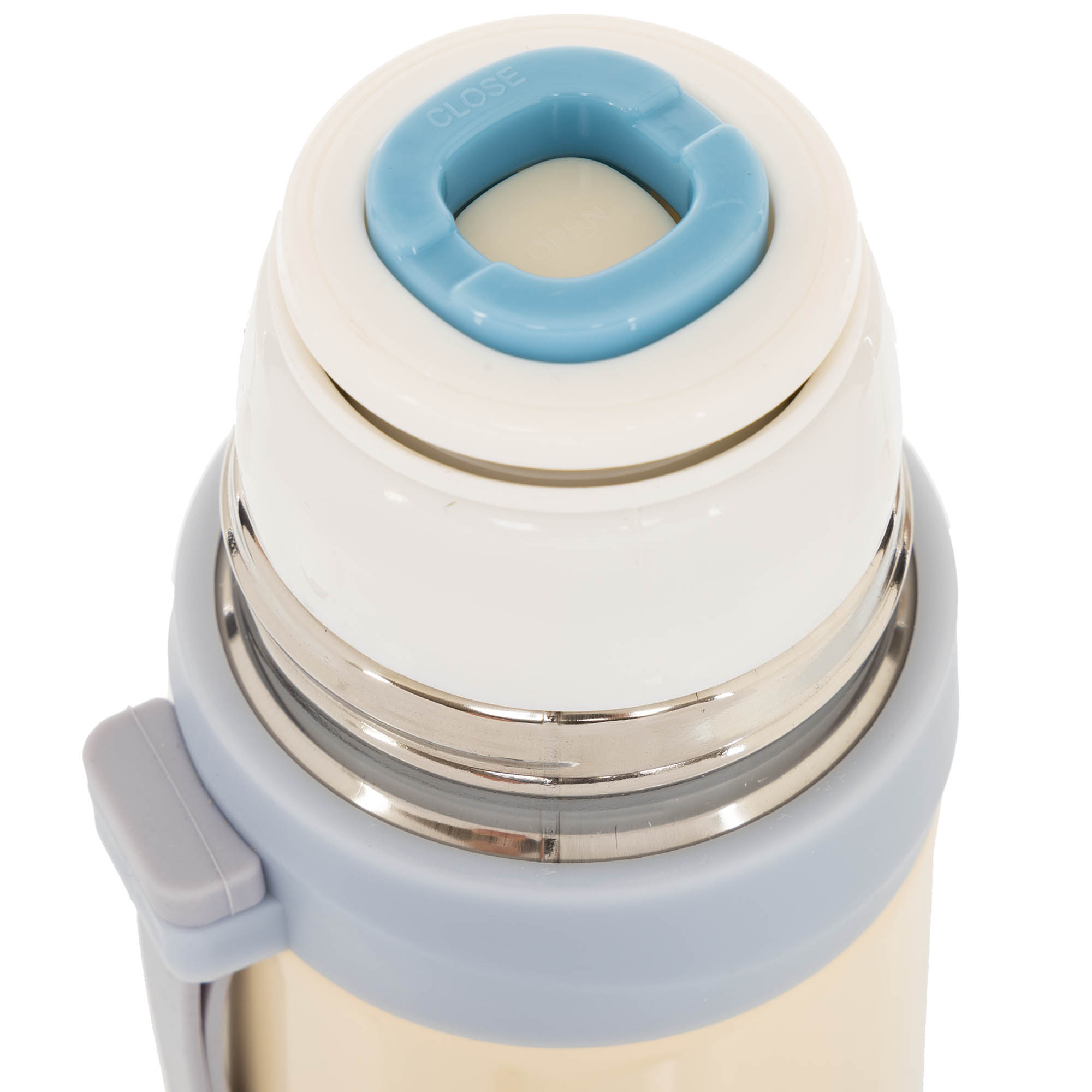 Компактний термос із вакуумною ізоляцією тримає температуру до 12 годин, має яскравий дизайн і зручну кришку. Конструкція не протікає, її можна нахиляти і перевертати, класти в сумку або рюкзак. Гладке широке горлечко зручне для пиття, через нього всередину можна помістити шматочки льоду, листовий чай або свіжі фрукти. Щоб налити напій у чашку не обов'язково повністю відкривати термос, для цього на кришці є спеціальний клапан.