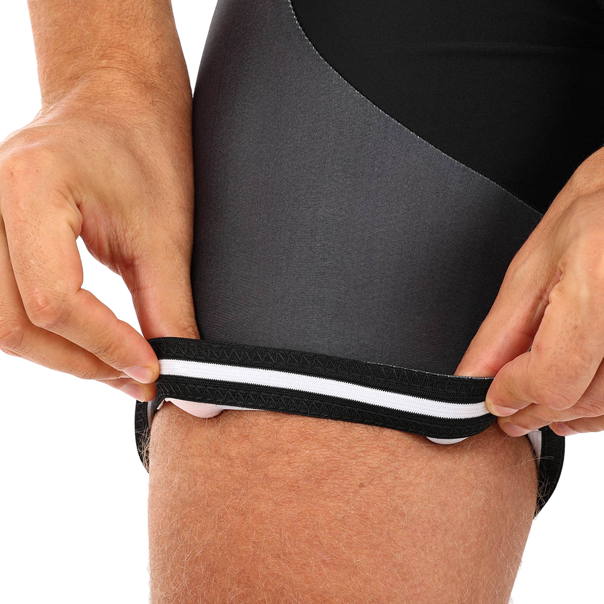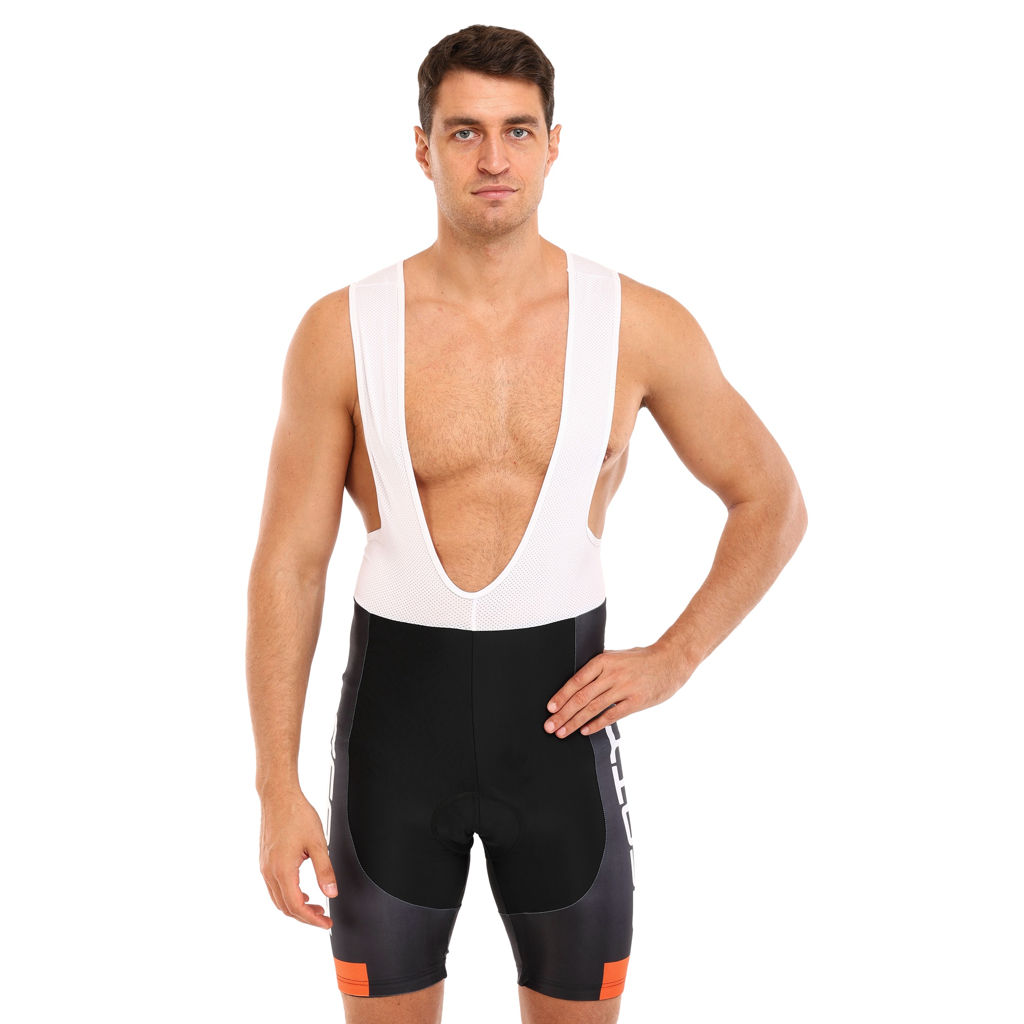 Шорти з лямками виконані з еластичного матеріалу, що щільно облягає тіло, не сковуючи рухів. Лямки забезпечують надійну фіксацію шортів на місці, запобігаючи їх сповзанню та перекручуванню під час їзди. Ергономічний крій шорт сприяє покращенню аеродинаміки та комфорту, знижуючи втому м'язів при тривалих поїздках. Спеціальний анатомічний памперс в області сидіння мінімізує тертя та надає додаткове пом'якшення.