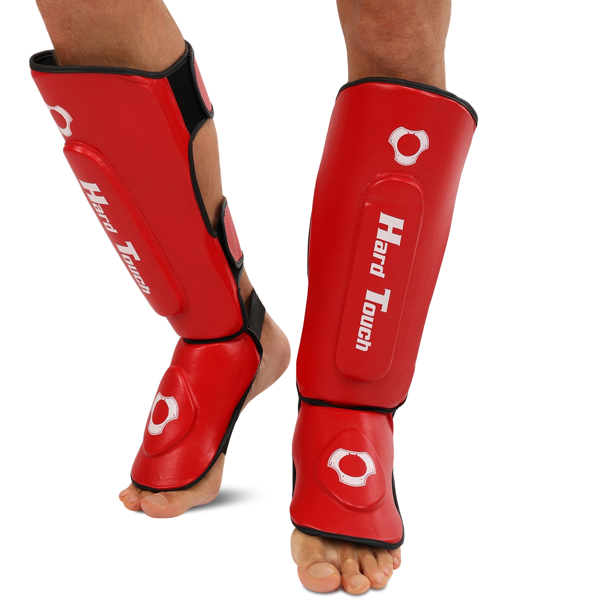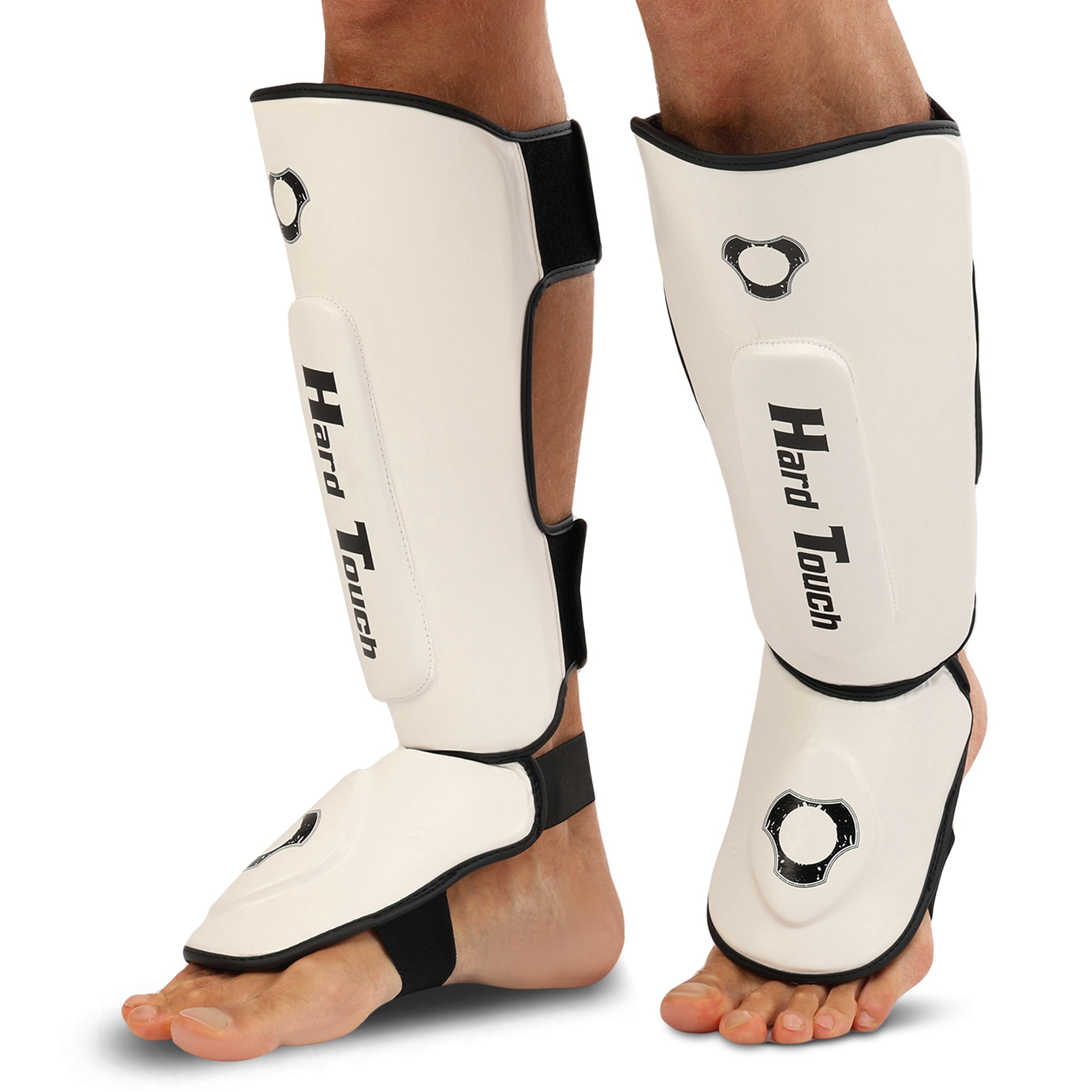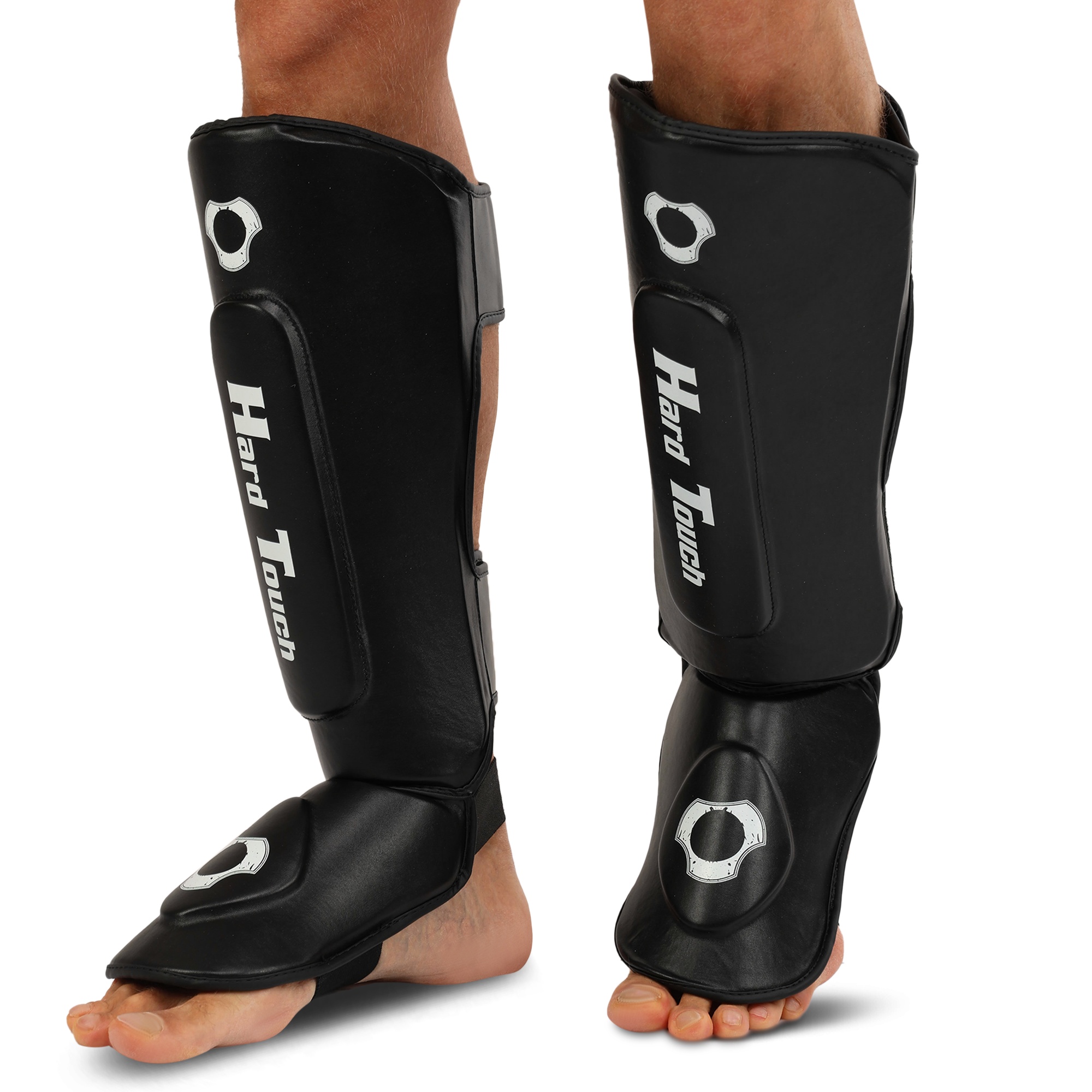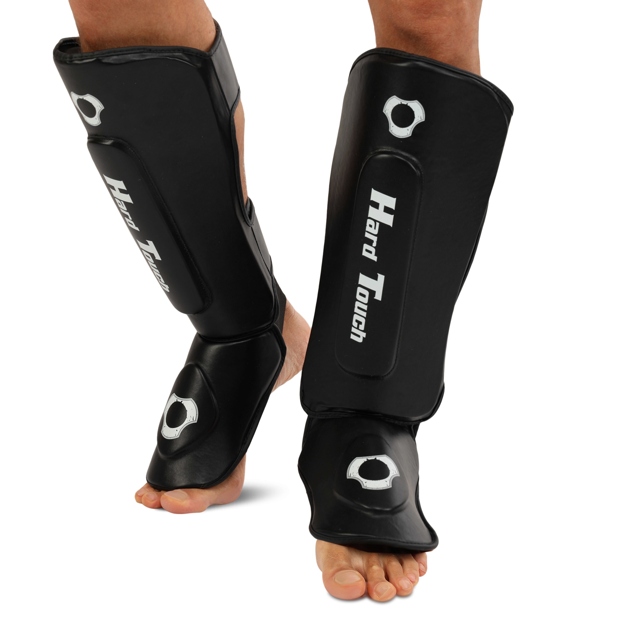 HARD TOUCH BO-7380 - найкраще екіпірування для занять муай-тай, ММА та кікбоксингом. Екіпірування надійно захищає гомілку та стопу. Воно являє собою пару накладок, які мають ергономічну форму та виготовлені з легких матеріалів. В якості матеріалу верху застосовується поліуретан, а під ним ховається сформований пінний наповнювач, який необхідний для того, щоб екіпірування успішно гасило найсильніші удари. На тильній стороні екіпірування розташовується пара липучок і пара еластичних гумок. Гумки фіксують частину екіпіровки, яка прилягає до стопи, а липучки - до гомілки. Екіпіровка має зручну посадку, не зміщується і не сповзає під час виконання ударів ногами. Спортсмен не втрачає рухливість і може виконувати будь-які рухи.
