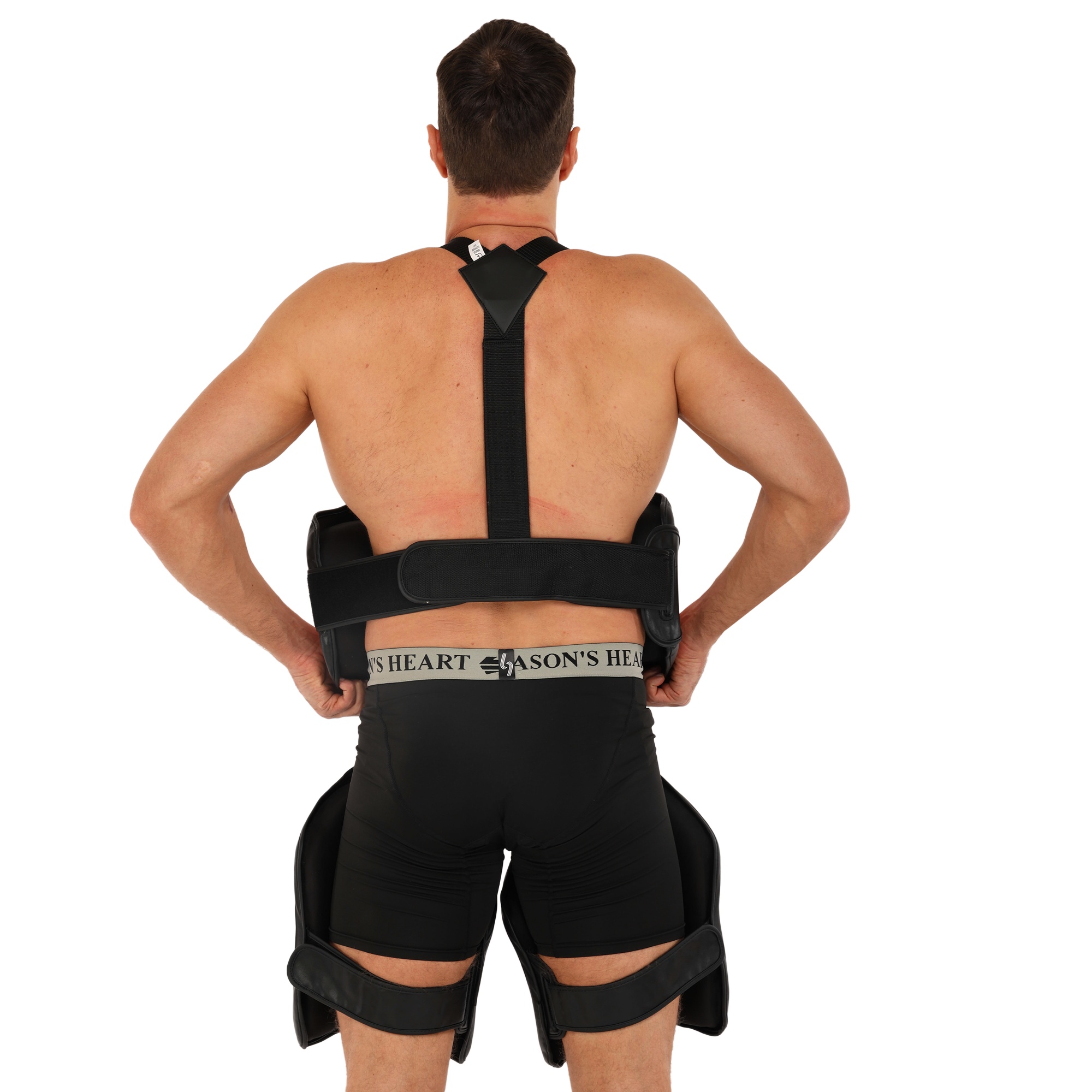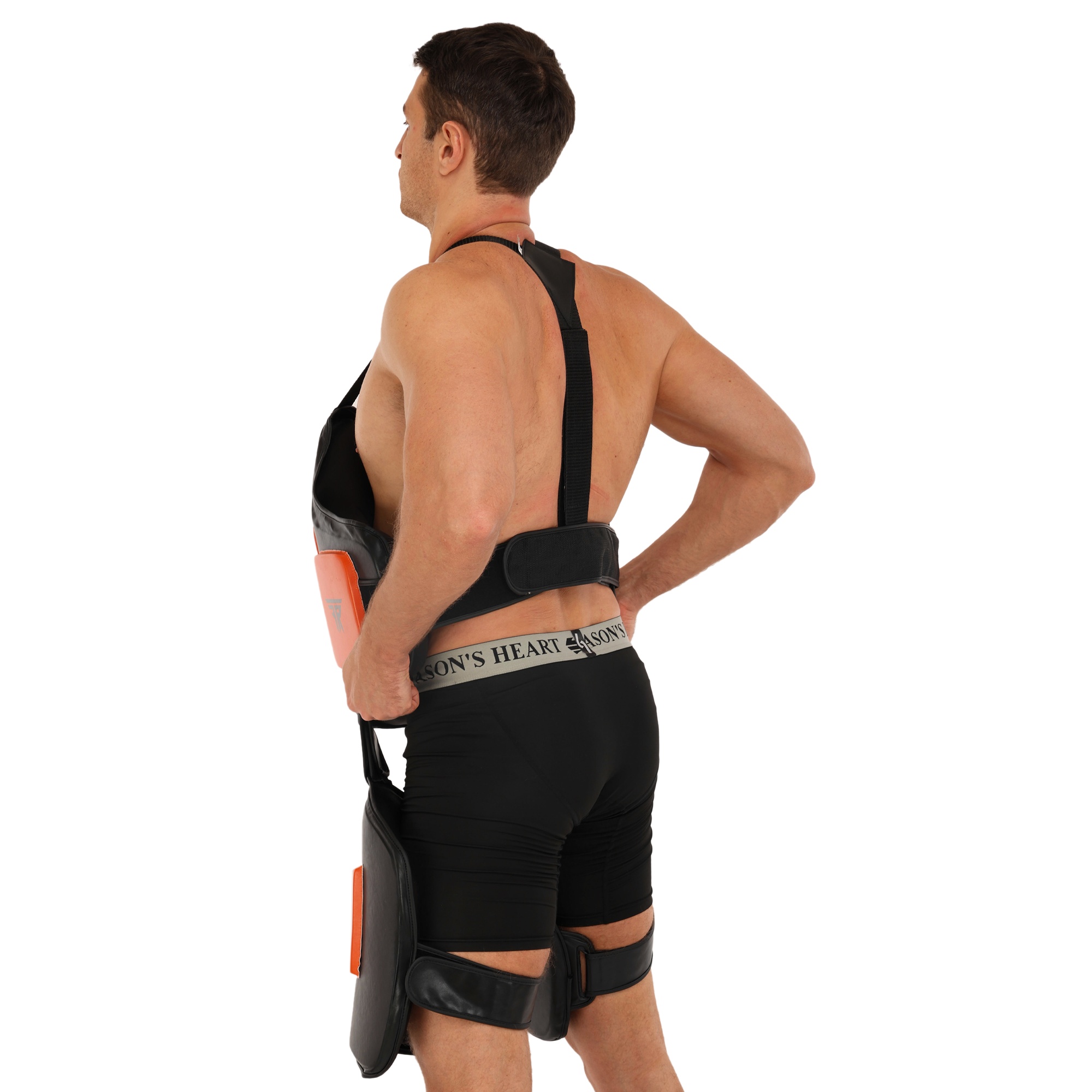 У комплект входить захист грудей і живота, а також захист стегон. Зовнішня частина виконана з поліуретану — ударостійкого матеріалу, стійкого до зносу. Оптимальне поглинання ударів гарантує спеціальний наповнювач. За допомогою зручних липучок захист можна відрегулювати за розміром і надійно зафіксувати на тілі.