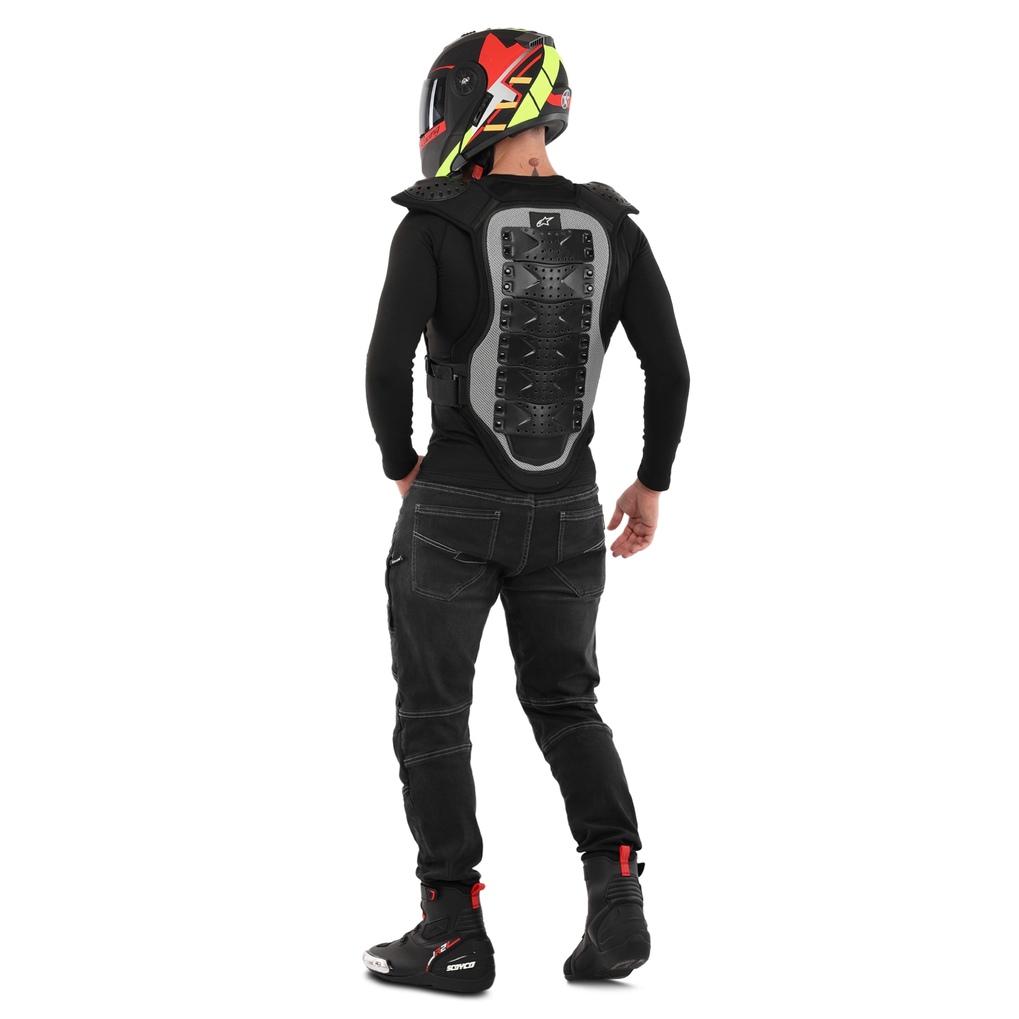 Моточерепаха закриває плечі, для цього на них є спеціальні пластикові накладки, а також груди і спину. Захисні накладки на спині розділені на кілька сегментів, які дають змогу приймати зручне положення сидячи на мотоциклі, але водночас запобігають неприродним вигинам хребта.