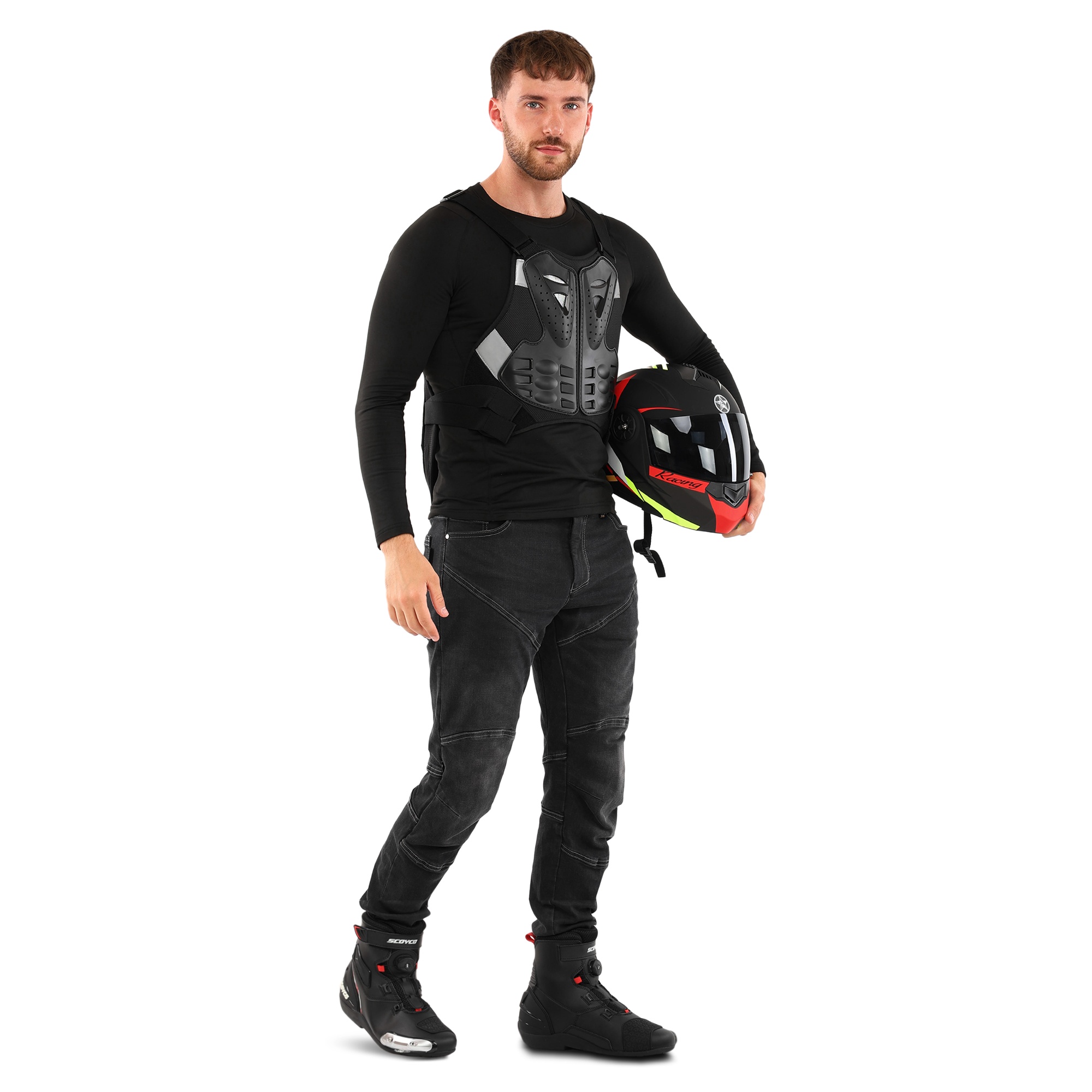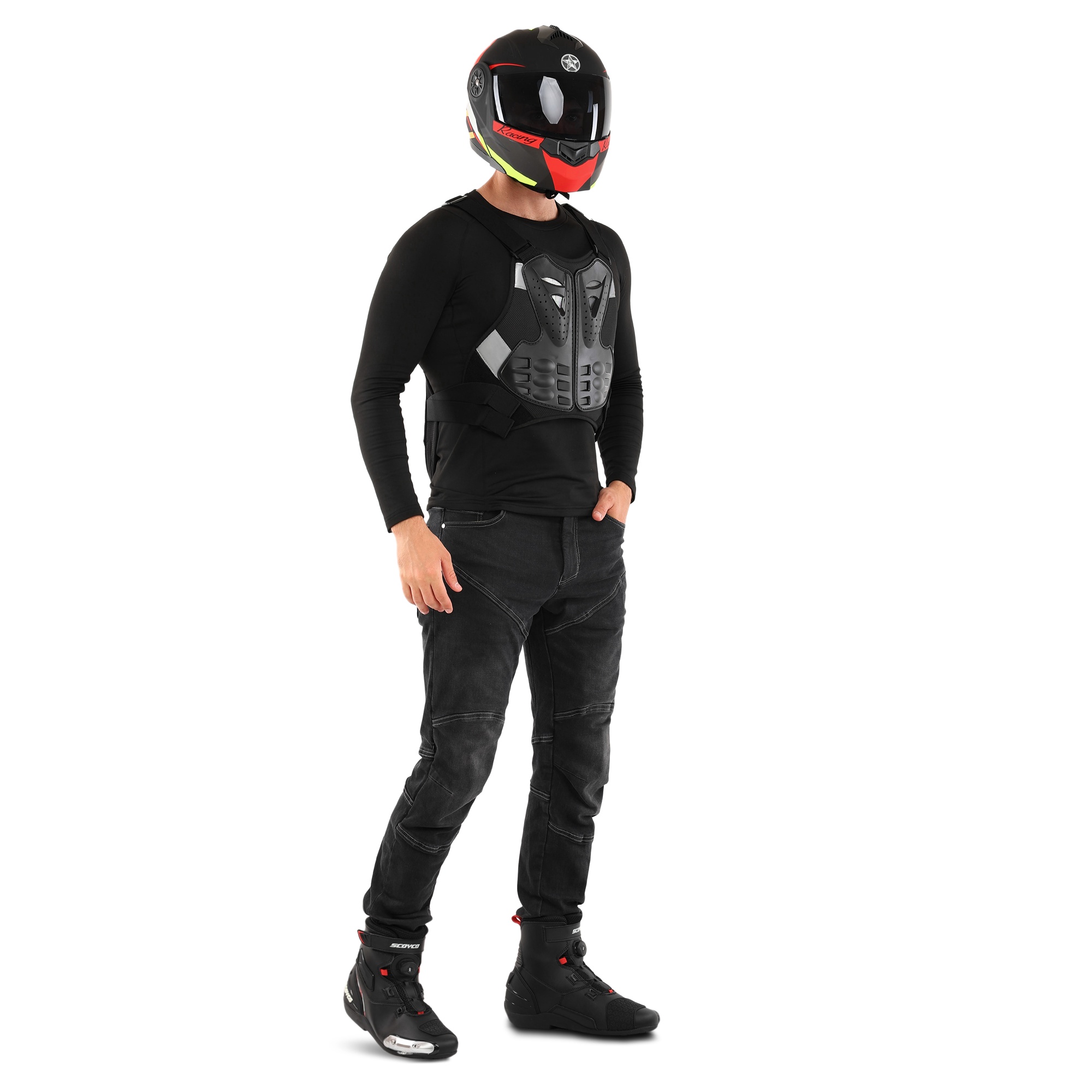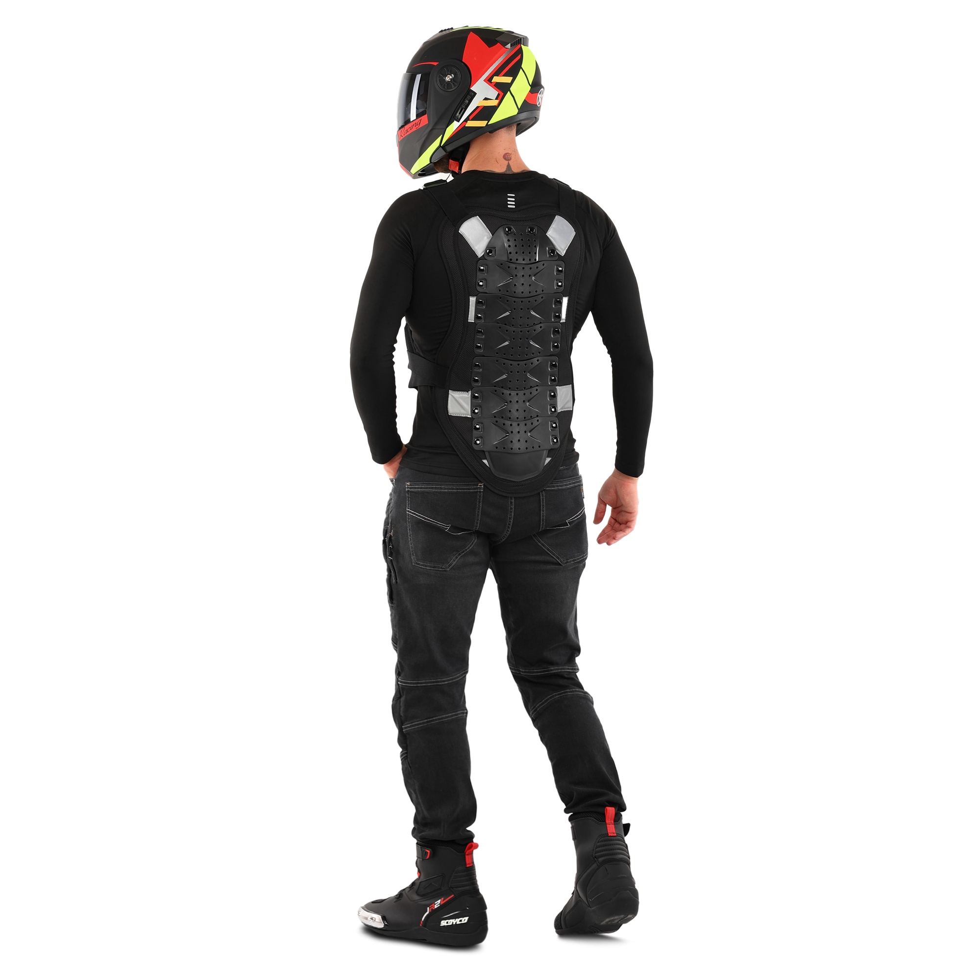 Завдяки використанню якісної захисної екіпіровки ви зможете уникнути серйозних ушкоджень хребта або ребер і без важких наслідків перенести аварію або падіння з мотоцикла. Моточерепаха має регульований розмір, що дає змогу використовувати її користувачам різної комплекції. Ремені для регулювання за розміром проходять на плечах і ребрах. Моточерепаха закриває груди і спину, на грудях розташовані світловідбивні вставки. Підкладка з поліестеру не перешкоджає повітрообміну. На пластикових захисних накладках є отвори, які сприяють охолодженню тіла.